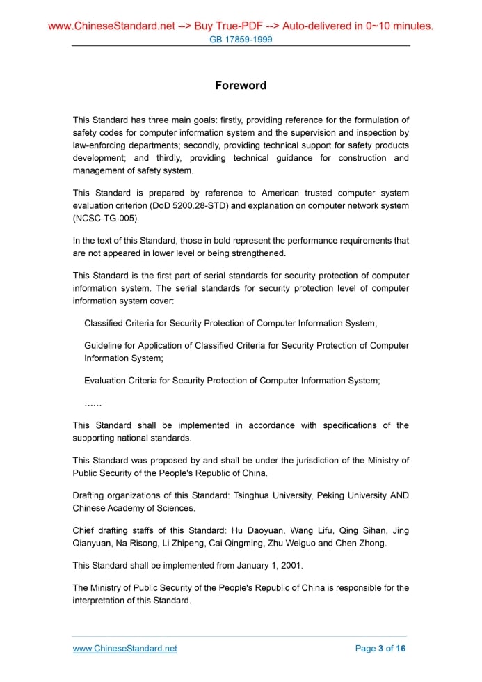 Similar standardsGB 17859-1999: Classified criteria for security protection of computer information system---This is an excerpt. Full copy of true-PDF in English version (including equations, symbols, images, flow-chart, tables, and figures etc.), auto-downloaded/delivered in 9 seconds, can be purchased online: https://www.ChineseStandard.net/PDF.aspx/GB17859-1999GB NATIONAL STANDARD OF THE PEOPLE’S REPUBLIC OF CHINA ICS 35.020 L 09 Classified Criteria for Security Protection of Computer Information System Issued on. SEPTEMBER 13, 1999 Implemented on. JANUARY 1, 2001 Issued by. State Quality Technical Supervision Bureau Table of ContentsForeword... 3 1 Scope... 4 2 Normative References... 4 3 Definitions... 4 4 Level Classification Criteria... 5ForewordThis Standard has three main goals. firstly, providing reference for the formulation of safety codes for computer information system and the supervision and inspection by law-enforcing departments; secondly, providing technical support for safety products development; and thirdly, providing technical guidance for construction and management of safety system. This Standard is prepared by reference to American trusted computer system evaluation criterion (DoD 5200.28-STD) and explanation on computer network system (NCSC-TG-005). In the text of this Standard, those in bold represent the performance requirements that are not appeared in lower level or being strengthened. This Standard is the first part of serial standards for security protection of computer information system. The serial standards for security protection level of computer information system cover. Classified Criteria for Security Protection of Computer Information System; Guideline for Application of Classified Criteria for Security Protection of Computer Information System; Evaluation Criteria for Security Protection of Computer Information System; ... This Standard shall be implemented in accordance with specifications of the supporting national standards. This Standard was proposed by and shall be under the jurisdiction of the Ministry of Public Security of the People's Republic of China. Drafting organizations of this Standard. Tsinghua University, Peking University AND Chinese Academy of Sciences. Chief drafting staffs of this Standard. Hu Daoyuan, Wang Lifu, Qing Sihan, Jing Qianyuan, Na Risong, Li Zhipeng, Cai Qingming, Zhu Weiguo and Chen Zhong. This Standard shall be implemented from January 1, 2001. The Ministry of Public Security of the People's Republic of China is responsible for the interpretation of this Standard. 3.1 Computer information system A man-machine system that is composed of computer and associated and supporting equipment and facility (including network) to collect, process, store, transmit and retrieve the information according to certain application goals and rules. 3.2 Trusted computing base of computer information system The generic term for the protection devices in computer system, which includes hardware, firmware, software, and assembly responsible for the implementation of security policy, establishes a basic protection environment and provides additional user service required by a trusted computing system. 3.3 Object Carrier of the information. 3.4 Subject Person, process or equipment etc. which cause flow of information among objects. 3.5 Sensitivity label A group of information that expresses the objects security level and describes the object data sensitivity; sensitivity label is adopted as the reference for mandatory access control decision in trusted computing base. 3.6 Security policy Laws, specifications and enforcement regulations in management, protection and issuing of sensitive information. 3.7 Channel Path for information transmission in system. 3.8 Covert channel Communication channel which allows the process transmits information in the mode to damage system security strategy. 3.9 Reference monitor Component for monitoring the authorization access relation between subject and object. 4.1 Level 1.the user's discretionary protection level Trusted computing base of computer information system at this level enables the user to be possessed of security protection capability by isolating user from data, and is provided with the controlling capability in multiple forms to perform access control for the user, i.e., provide feasible means to the user to protect information of the user and the user group as well as avoid illegal read/write and destroy concerning data by other users. 4.1.1 Discretionary access control Trusted computing base of computer information system defines and controls the access to named object by named user in the system. Implementation mechanism (for example. access control list) allows the named user, under the identity of user and (or) user group, to specify and control sharing by object as well as prevents unauthorized user reading sensitive information. 4.1.2 Identity authentication In the initial implementation by trusted computing base of computer information system, it is first required the user to label his own identity and authenticate the user's identity by protection mechanism (e.g.. password), then prevent unauthorized user to access user identity authentication data. 4.1.3 Data integrity Trusted computing base of computer information system prevents unauthorized user modifying or destroying sensitive information by way of discretionary integrity policy. 4.2 Level 2.system audit protection level Compared with the user's discretionary protection level, trusted computing base of computer information system at this level implements discretionary access control with finer granularity, and makes the user to be responsible for itself by logging in regulations, auditing security dependent event and isolating resources. 4.2.1 Discretionary access control Trusted computing base of computer information system defines and controls the access to named object by named user in the system. Implementation mechani