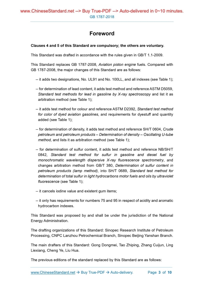GB 1787-2018: Aviation piston engine fuels---This is an excerpt. Full copy of true-PDF in English version (including equations, symbols, images, flow-chart, tables, and figures etc.), auto-downloaded/delivered in 9 seconds, can be purchased online: https://www.ChineseStandard.net/PDF.aspx/GB1787-2018GB NATIONAL STANDARD OF THE PEOPLE’S REPUBLIC OF CHINA ICS 75.160.20 E 31 Replacing GB 1787-2008 Aviation piston engine fuels Issued on: JULY 13, 2018 Implemented on: FEBRUARY 1, 2019 Issued by. National Administration for Market Regulation of the People's Republic of China; Standardization Administration of the People's Republic of China. Table of ContentsForeword ... 3 1 Scope ... 5 2 Normative references ... 5 3 Classification and designation ... 7 4 Requirements and test methods ... 8 5 Inspection rules ... 9 6 Marking, packaging, transportation and storage ... 10 7 Safety ... 10ForewordClauses 4 and 5 of this Standard are compulsory; the others are voluntary. This Standard was drafted in accordance with the rules given in GB/T 1.1-2009. This Standard replaces GB 1787-2008, Aviation piston engine fuels. Compared with GB 1787-2008, the major changes of this Standard are as follows. -- it adds two designations, No. UL91 and No. 100LL, and all indexes (see Table 1); -- for determination of lead content, it adds test method and reference ASTM D5059, Standard test methods for lead in gasoline by X-ray spectroscopy and list it as arbitration method (see Table 1); -- it adds test method for colour and reference ASTM D2392, Standard test method for color of dyed aviation gasolines, and requirements for dyestuff and quantity added (see Table 1); -- for determination of density, it adds test method and reference SH/T 0604, Crude petroleum and petroleum products – Determination of density – Oscillating U-tube method, and lists it as arbitration method (see Table 1); -- for determination of sulfur content, it adds test method and reference NB/SH/T 0842, Standard test method for sulfur in gasoline and diesel fuel by monochromatic wavelength dispersive X-ray fluorescence spectrometry, and changes arbitration method from GB/T 380, Determination of sulfur content in petroleum products (lamp method), into SH/T 0689, Standard test method for determination of total sulfur in light hydrocarbons motor fuels and oils by ultraviolet fluorescence (see Table 1); -- it cancels iodine value and existent gum items; -- it only has requirements for numbers 75 and 95 in respect of acidity and aromatic hydrocarbon indexes. This Standard was proposed by and shall be under the jurisdiction of the National Energy Administration. The drafting organizations of this Standard. Sinopec Research Institute of Petroleum Processing, CNPC Lanzhou Petrochemical Branch, Sinopec Beijing Yanshan Branch. The main drafters of this Standard. Gong Dongmei, Tao Zhiping, Zhang Cuijun, Ling Liexiang, Cheng Ye, Liu Hua. The previous editions of the standard replaced by this Standard are as follows. Aviation piston engine fuels Warning – This standard may involve certain hazards in the process of production, transportation, loading, use, etc. of the products covered by it, if appropriate protective measures are not taken, but it does not purport to address all of the safety concerns, if any. It is the responsibility of the user of this Standard to establish appropriate safety and health practices and determine the applicability of regulatory limitations prior to use.1 ScopeThis Standard specifies the classification and designation, requirements and test methods, inspection rules, marking, packaging, transportation and storage and safety of aviation piston engine fuels, which are produced using the materials and processes approved through the national evaluation procedure and adding appropriate additives. This Standard applies to aviation piston engine fuels.2 Normative referencesThe following referenced documents are indispensable for the application of this document. For dated references, only the edition dated applies to this document. For undated references, the latest edition of the referenced documents (including all amendments) applies to this document. GB 190, Labels for Packages of dangerous goods GB/T 258, Standard test method for determination of acidity of light petroleum products GB/T 259, Petroleum products – Determination of water-soluble acids and alkalis GB/T 260, Test method for water in petroleum products – Distillation method GB/T 380, Determination of sulfur content in petroleum products (lamp method) GB/T 384, Determination of calorific value of petroleum products GB/T 503, Determination of the gasoline octane number – Test method for motor octane number SH/T 0506, Determination of knock characteristics of aviation gasolines (pressurization method) SH/T 0585, Determination method for oxidation stability of aviation fuel (potential residue method) SH/T 0604, Crude petroleum and petroleum products – Determination of density – Oscillating U-tube method SH/T 0689, Standard test method for determination of total sulfur in light hydrocarbons motor fuels and oils by ultraviolet fluorescence SH/T 0770, Standard test method for freezing point of aviation fuels (automatic phase transition method) SH/T 0794, Standard test method for vapor pressure of petroleum products (mini method) NB/SH/T 0842, Standard test method for sulfur in gasoline and diesel fuel by monochromatic wavelength dispersive X-ray fluorescence spectrometry ASTM D2392, Standard test method for color of dyed aviation gasolines ASTM D3338, Standard test method for estimation of net heat of combustion of aviation fuels ASTM D5059, Standard test methods for lead in gasoline by X-ray spectroscopy3 Classification and designation3.1 Classification Aviation piston engine fuels includes 5 designations according to motor octane numbers, including numbers 75, UL91, 95, 100 and 100LL, with “UL” representing unleaded and “LL” representing low lead. 3.2 De