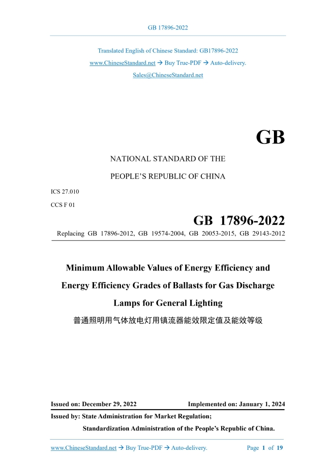 GB 17896-2022: Minimum allowable values of energy efficiency and energy efficiency grades of ballasts for gas discharge lamps for general lighting Delivery: 9 seconds. True-PDF full-copy in English & invoice will be downloaded + auto-delivered via email. See step-by-step procedure Status: Valid GB 17896: Historical versions