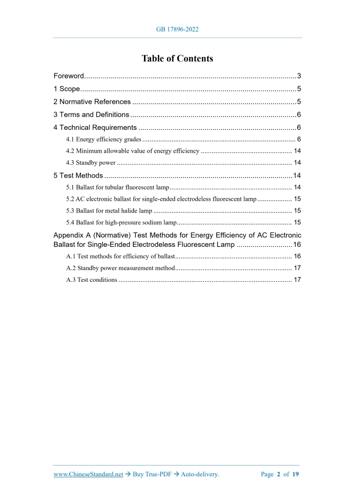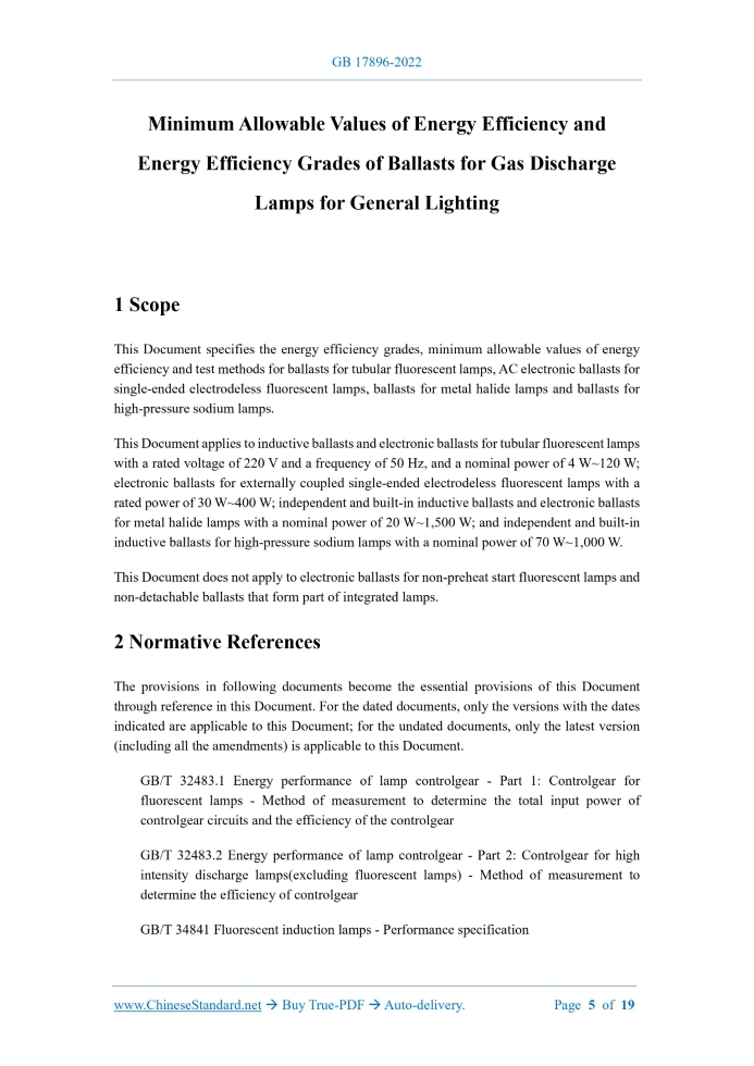 Similar standardsGB 17896-2022: Minimum allowable values of energy efficiency and energy efficiency grades of ballasts for gas discharge lamps for general lighting---This is an excerpt. Full copy of true-PDF in English version (including equations, symbols, images, flow-chart, tables, and figures etc.), auto-downloaded/delivered in 9 seconds, can be purchased online: https://www.ChineseStandard.net/PDF.aspx/GB17896-2022 GB NATIONAL STANDARD OF THE PEOPLE’S REPUBLIC OF CHINA ICS 27.010 CCS F 01 Replacing GB 17896-2012, GB 19574-2004, GB 20053-2015, GB 29143-2012 Minimum Allowable Values of Energy Efficiency and Energy Efficiency Grades of Ballasts for Gas Discharge Lamps for General Lighting ISSUED ON: DECEMBER 29, 2022 IMPLEMENTED ON: JANUARY 1, 2024 Issued by: State Administration for Market Regulation; Standardization Administration of the People’s Republic of China. Table of ContentsForeword ... 3 1 Scope ... 5 2 Normative References ... 5 3 Terms and Definitions ... 6 4 Technical Requirements ... 6 4.1 Energy efficiency grades ... 6 4.2 Minimum allowable value of energy efficiency ... 14 4.3 Standby power ... 14 5 Test Methods ... 14 5.1 Ballast for tubular fluorescent lamp ... 14 5.2 AC electronic ballast for single-ended electrodeless fluorescent lamp ... 15 5.3 Ballast for metal halide lamp ... 15 5.4 Ballast for high-pressure sodium lamp ... 15 Appendix A (Normative) Test Methods for Energy Efficiency of AC Electronic Ballast for Single-Ended Electrodeless Fluorescent Lamp ... 16 A.1 Test methods for efficiency of ballast ... 16 A.2 Standby power measurement method ... 17 A.3 Test conditions ... 17 Minimum Allowable Values of Energy Efficiency and Energy Efficiency Grades of Ballasts for Gas Discharge Lamps for General Lighting1 ScopeThis Document specifies the energy efficiency grades, minimum allowable values of energy efficiency and test methods for ballasts for tubular fluorescent lamps, AC electronic ballasts for single-ended electrodeless fluorescent lamps, ballasts for metal halide lamps and ballasts for high-pressure sodium lamps. This Document applies to inductive ballasts and electronic ballasts for tubular fluorescent lamps with a rated voltage of 220 V and a frequency of 50 Hz, and a nominal power of 4 W~120 W; electronic ballasts for externally coupled single-ended electrodeless fluorescent lamps with a rated power of 30 W~400 W; independent and built-in inductive ballasts and electronic ballasts for metal halide lamps with a nominal power of 20 W~1,500 W; and independent and built-in inductive ballasts for high-pressure sodium lamps with a nominal power of 70 W~1,000 W. This Document does not apply to electronic ballasts for non-preheat start fluorescent lamps and non-detachable ballasts that form part of integrated lamps.2 Normative ReferencesThe provisions in following documents become the essential provisions of this Document through reference in this Document. For the dated documents, only the versions with the dates indicated are applicable to this Document; for the undated documents, only the latest version (including all the amendments) is applicable to this Document. GB/T 32483.1 Energy performance of lamp controlgear - Part 1: Controlgear for fluorescent lamps - Method of measurement to determine the total input power of controlgear circuits and the efficiency of the controlgear GB/T 32483.2 Energy performance of lamp controlgear - Part 2: Controlgear for high intensity discharge lamps(excluding fluorescent lamps) - Method of measurement to determine the efficiency of controlgear GB/T 34841 Fluorescent induction lamps - Performance specification3 Terms and DefinitionsFor the purposes of this Document, the terms and definitions given in GB/T 32483.1, GB/T 32483.2 and the following apply. 3.1 Ballast efficiency; ηb The ratio of the ballast output power (lamp power) to the total input power of the ballast-lamp circuit. NOTE: Sensors, network connections or other auxiliary loads are disconnected. If they cannot be disconnected, the power of these loads shall be deducted from the result. 3.2 Minimum allowable value of energy efficiency for ballast The minimum allowable value of ballast efficiency under the test conditions specified in the standard. 3.3 Standby power Average power consumption of the ballast in standby mode. NOTE 1: Standby mode is a mode of the ballast where the ballast is connected to the supply voltage and the lighting function is off but can be turned on by an external trigger signal instead of a network trigger signal. NOTE 2: External trigger signal such as a sensor or timer.4 Technical Requirements4.1 Energy efficiency grades 4.1.1 Ballast energy efficiency grades are divided into 3 grades, among which Grade-1 has the highest energy efficiency. 4.1.2 The efficiency of electronic ballasts for tubular fluorescent lamps of various grades shall be no lower than the requirements of Table 1; and the efficiency of inductive ballasts for tubular fluorescent lamps of various grades shall be no lower than the requirements of Table 2. A.3.2 Power supply voltage A.3.2.1 Test voltage When the used power supply voltage range is marked on the ballast, or when the ballast has several different independent rated power supply voltages, the voltage within the power supply voltage range of the ballast or any predetermined voltage can be used as the rated voltage for testing, whichever is the most unfavorable. A.3.2.2 Power supply stability During the test, the power supply voltage and frequency in the preheating stage shall be stably maintained within ±0.5% of the rated voltage value; during the actual measurement period, the voltage shall be maintained within ±0.2% of the rated voltage value. A.3.2.3 Test power supply voltage waveform The total harmonic content of the test power supply voltage shall not exceed 3%; the harmonic content is defined as the root mean square (RMS) sum of each component with the fundamental frequency as 100%. A.3.3 Magnetic e