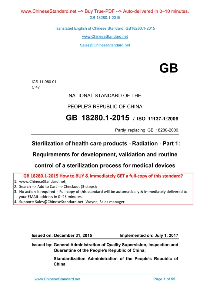 GB 18280.1-2015: Sterilization of health care products -- Radiation -- Part 1: Requirements for development, validation and routine control of a sterilization process for medical devices Delivery: 9 seconds. True-PDF full-copy in English & invoice will be downloaded + auto-delivered via email. See step-by-step procedure Status: Valid GB 18280.1: Historical versions