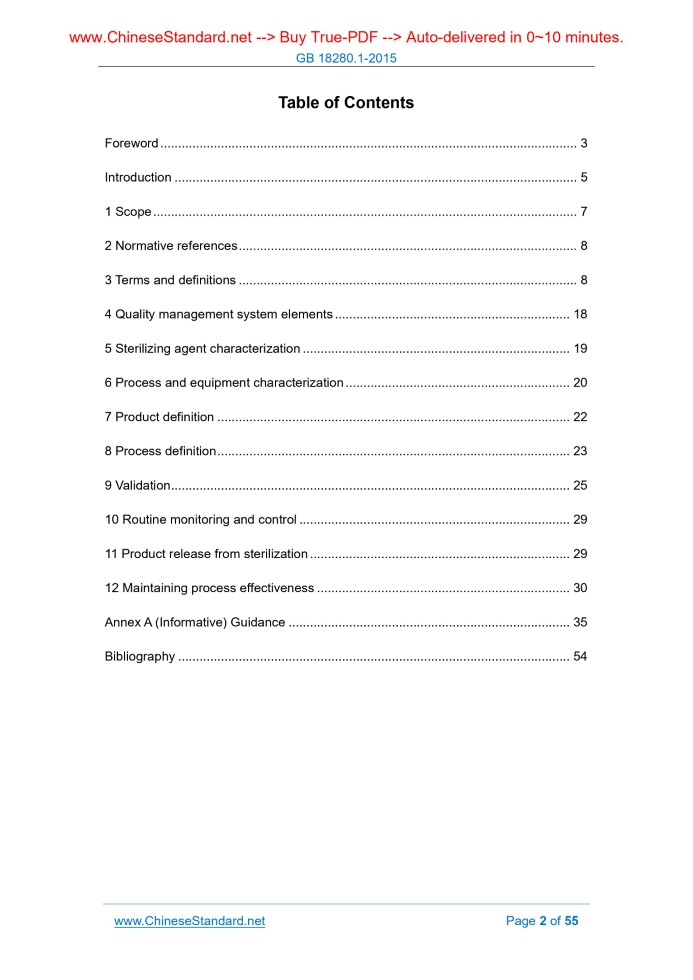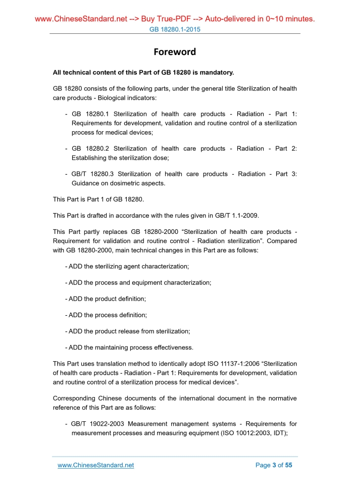 Similar standardsGB 18280.1-2015: Sterilization of health care products -- Radiation -- Part 1: Requirements for development, validation and routine control of a sterilization process for medical devices---This is an excerpt. Full copy of true-PDF in English version (including equations, symbols, images, flow-chart, tables, and figures etc.), auto-downloaded/delivered in 9 seconds, can be purchased online: https://www.ChineseStandard.net/PDF.aspx/GB18280.1-2015 Sterilization of health care products - Radiation - Part 1.Requirements for development, validation and routine control of a sterilization process for medical devices ICS 11.080.01 C47 National Standards of People's Republic of China Partly replace GB 18280-2000 Radiation Sterilization of health care products Part 1.Medical device sterilization process development, Validation and routine control Sterilizationofhealthcareproducts-Radiation-Part 1. Requirementsfordevelopment, validationandroutinecontrolofa (ISO 11137-1.2006, IDT) Issued on. 2017-07-01 2015-12-31 implementation Administration of Quality Supervision, Inspection and Quarantine of People's Republic of China Standardization Administration of China released Table of ContentsPreface Ⅰ Introduction Ⅱ 1 Scope 1 2 Normative references 1 3 Terms and definitions 2 4 Quality Management System Elements 7 5 sterilization characterization factor 7 Characteristics of processes and equipment 6 Description 8 7 9 Product Definition 8 9 Process Definition 9 Confirm 10 10 Routine monitoring and control 12 11 sterile product release 13 12 process to maintain the effectiveness of 13 Appendix A (informative) Guide 16 References 27ForewordAll technical content in this Part of GB 18280 is mandatory. GB 18280 "Radiation Sterilization of health care products" is divided into the following sections. --- GB 18280.1 Radiation Sterilization of health care products - Part 1.Development of medical equipment sterilization process, validation and routine control System requirements; --- GB 18280.2 Sterilization of health care products - Radiation - Part 2.Establish sterilization dose; --- GB/T 18280.3 Radiation Sterilization of health care products - Part 3.dose measurement guide. This is Part 1 GB 18280's. This section drafted in accordance with GB/T 1.1-2009 given rules. This portion instead of GB 18280-2000 "Sterilization of health care products Requirements for validation and routine control of radiation sterilization", and GB 18280-2000 compared to the main technical content changes are as follows. --- Increasing the sterilization factor characterization; --- Increased process characteristics and description of the device; --- Increased product definition; --- Increased process definition; --- Increased sterilization release; --- To increase the effectiveness of process control. This section uses the translation method identical with ISO 11137-1.2006 "Sterilization of health care products - Radiation - Part 1.Medical Devices Off Bacteria development process, validation and routine control. " The correspondence between the consistency of the international normative documents referenced in our country with the following documents. --- GB/T 19022-2003 Measurement management systems for measurement processes and measuring equipment (ISO 10012.2003, IDT); --- GB/T 19973.1-2005 Sterilization of health care products - Microbiological methods - Part 1.The total number of microorganisms on the product Estimate (ISO 11737-1.1994, IDT); --- GB /learning methods - Part 2 T 19973.2-2005 microbial sterilization of medical devices. sterility test confirmed the sterilization process (ISO 11737-2.1998, IDT). This part is proposed by the China Food and Drug Administration. This part of the National Standardization Technical Committee disinfection technology and equipment (SAC/TC200) centralized. This section is drafted. Beijing Radiation Application Research Center, Shenzhen Jinpeng source of radiation Technology Co., Ltd., the State Food and Drug Administration Administration of Guangzhou Medical Device Quality Supervision and Inspection Center. The main drafters of this section. Hu Jinhui, Linnai Jie, Xu Honglei, Chen Qiang, spear Bao, Zhang Yue. This part of the standard replaces the previous editions are. --- GB 18280-2000.introductionSterile medical devices is a non-living micro-organisms products. International Standard specifies confirm the sterilization process and routine control of when Necessary medical equipment provided in the form of sterile, should be sterilized before its various undesired microorganisms to minimize contamination. Even medical devices Mechanical products to meet the quality management system (for example. YY/T 0287) under standard manufacturing conditions requirements produced before sterilization will bring A small amount of micro-organisms, such products are non-sterile products. Purpose of sterilization is to inactivate microorganisms, so that non-sterile products into sterile product. Physical factors and/sterilization of medical devices using kinetic or chemical factors on pure cultures of microorganisms surviving microorganisms can be inactivated general The number was exponential relationship between the degree of sterilization and be a good description. This means that regardless of the degree of sterilization, there must exist a microorganism Live probability. For the treatment has been given, the remaining microorganism survival probability depends on the number of microbes, microbial resistance and processing It was occurring environment. Therefore, sterilized products batch processing in any one of the products can not be guaranteed to be sterile, sterilized batch processing Sterile product is defined as the amount of living micro-organisms present in the probability of the medical device. This section describes the requirements for radiation sterilization of medical devices program; to meet these requirements, we can provide suitable microorganisms bactericidal acti
