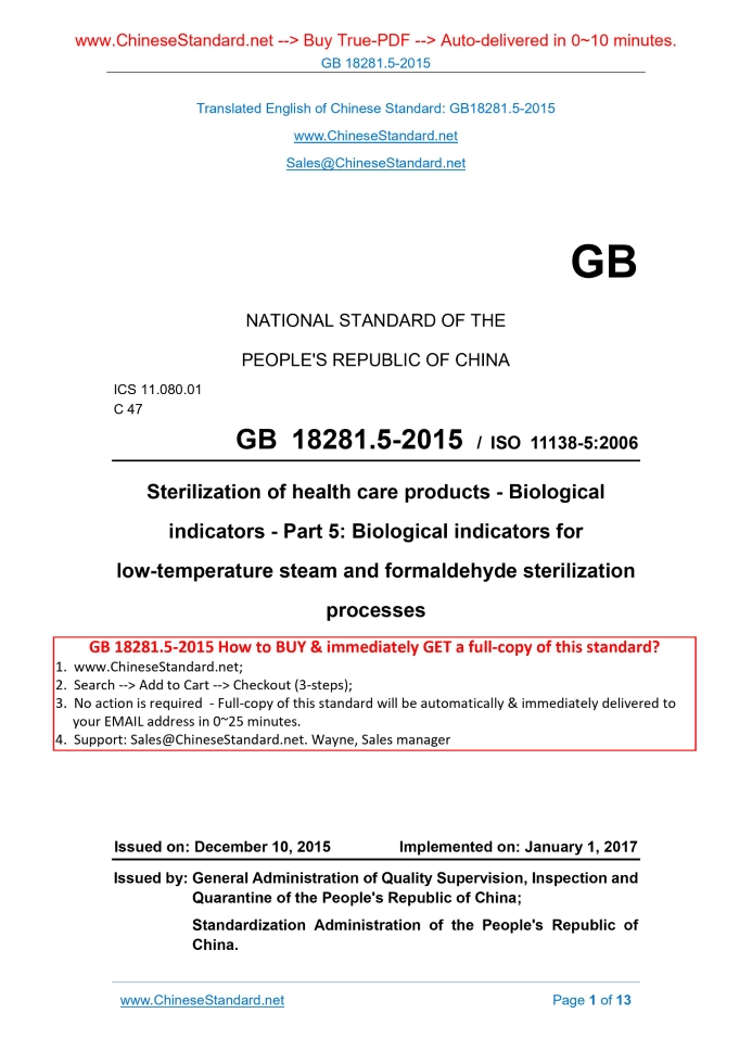 | GB/T 18281.5-2024 (GB 18281.5-2015) PDF EnglishUS$90.00 · In stock · Download in 9 seconds GB 18281.5-2015: Sterilization of health care products -- Biological indicator -- Part 5: Biological indicators for low-temperature steam and formaldehyde sterilization processes Delivery: 9 seconds. True-PDF full-copy in English & invoice will be downloaded + auto-delivered via email. See step-by-step procedure Status: Valid GB 18281.5: Historical versions