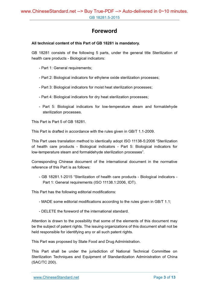 Similar standardsGB 18281.5-2015: Sterilization of health care products -- Biological indicator -- Part 5: Biological indicators for low-temperature steam and formaldehyde sterilization processes---This is an excerpt. Full copy of true-PDF in English version (including equations, symbols, images, flow-chart, tables, and figures etc.), auto-downloaded/delivered in 9 seconds, can be purchased online: https://www.ChineseStandard.net/PDF.aspx/GB18281.5-2015 Sterilization of health care products - Biological indicator - Part 5.Biological indicators for low-temperature steam and formaldehyde sterilization processes ICS 11.080.01 C47 National Standards of People's Republic of China Sterilization of health care products - Biological indicators Part 5.Low temperature steam formaldehyde sterilization biological indicators Sterilizationofhealthcareproducts-Biologicalindicator-Part 5.Biological (ISO 11138-5.2006, IDT) Issued on. 2015-12-10 2017-01-01 implementation Administration of Quality Supervision, Inspection and Quarantine of People's Republic of China Standardization Administration of China released Table of ContentsIntroduction Ⅲ Introduction Ⅳ 1 Scope 1 2 Normative references 1 3 Terms and definitions 4 1 General requirements 1 5 test bacteria 6 1 bacterial suspension 7 carrier and the inner packaging 2 8 carrier contamination and biological indicators 2 9 Number of microbial resistance and 2 Methods Appendix A (normative) Determination of low temperature steam formaldehyde sterilization process Resistance 3 Annex B (informative) low temperature steam formaldehyde principle with liquid biological indicators Test Method 4 Reference 5ForewordAll technical content in this Part of GB 18281 is mandatory. GB 18281 "Sterilization of health care products - Biological indicators" is divided into five parts. --- Part 1.General; --- Part 2.Biological indicators for ethylene oxide sterilization thereof; --- Part 3.Biological indicators for moist heat sterilization; --- Part 4.Biological indicators for dry heat sterilization thereof; --- Part 5.low temperature steam formaldehyde sterilization biological indicators. This section is part of the 5 GB 18281. This section drafted in accordance with GB/T 1.1-2009 given rules. This section uses the translation method identical with ISO 11138-5.2006 "Sterilization of health care products Biological indicators - Part 5.Low Temperature steam formaldehyde sterilization biological indicators. " Consistency correspondence between this part of international documents and normative references of our files are as follows. --- GB 18281.1-2015 Sterilization of health care products - Biological indicators - Part 1.General (ISO 11138-1.2006, IDT). This part made the following editorial changes. --- According to GB/T 1.1 requirements of a number of editorial changes; --- Delete international standards foreword. Please note that some of the content of this document may involve patents. Issuer of this document does not assume responsibility for the identification of these patents. This part is proposed by the China Food and Drug Administration. This part of the National Standardization Technical Committee disinfection technology and equipment (SAC/TC200) centralized. This section drafted by. State Food and Drug Administration Guangzhou Medical Device Quality Supervision and Inspection Center, located in Hangzhou Tailin Biotechnology Preparation Co., Ltd. Shandong Xinhua Medical Instrument Co., Ltd. The main drafters of this section. Xu Honglei, summer letter group, the new Mr Wong, Zhu Xiaoming.introductionGB 18281 specifies the biological indicator for monitoring sterilization cycle in the production, labeling, test methods and general performance requirements Further comprising a carrier intended to be used to verify and monitor the bacterial suspension sterilization process. GB 18281 This section gives specific for low temperature steam Biological indicator of claim formaldehyde vapor sterilization process. GB 18281 standard series provided the general requirements and test methods required. Currently this series is advanced by professional standards Manufacturers, users and regulatory authorities involved in standards development. The intention is not only not promote the use is not recommended in biological terms Indicators, but to provide general requirements now known that the production of biological indicators. Standard provides the general requirements for the verification and monitoring of low temperature steam formaldehyde sterilization processes (see ISO 14937). Note. The standard has been published in some countries or regions may cover the requirements for sterilization or biological indicators. The results of biological indicator selection, use and interpretation of visible ISO 14161. Sterilization of health care products - Biological indicators Part 5.Low temperature steam formaldehyde sterilization biological indicators 1 Scope GB 18281 of the provisions of this part of the test microorganisms, bacterial suspension, the carrier contamination, biological indicator and low temperature steam formaldehyde sterilization General requirements for sterilization agent to assess the treatment effect of biological indicator test method. Note 1.The requirements for low temperature steam formaldehyde sterilization process control and confirmation, see ISO 14937. Note 2.For the safety requirements in the workplace, see national or regional regulations. 2 Normative references The following documents for the application of this document is essential. For dated references, only the dated version suitable for use herein Member. For undated references, the latest edition (including any amendments) applies to this document. ISO 11138-1.2006 Sterilization of health care products - Biological indicators - Part 1.General (Sterilizationofhealthcare products-Biologicalindicators-Part 1.Genralrequirements) 3 Terms and Definitions As defined in ISO 11138-1 and the following terms 
