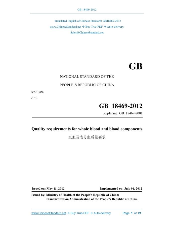 GB 18469-2012: Quality requirements for whole blood and blood components Delivery: 9 seconds. True-PDF full-copy in English & invoice will be downloaded + auto-delivered via email. See step-by-step procedure Status: Valid GB 18469: Historical versions