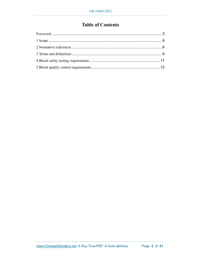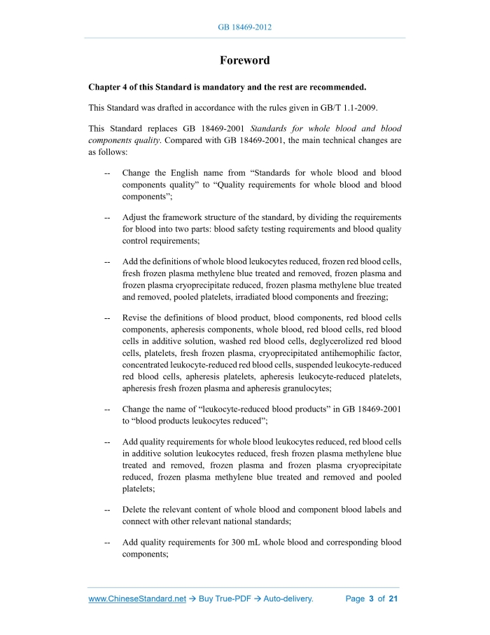 Similar standardsGB 18469-2012: Quality requirements for whole blood and blood components---This is an excerpt. Full copy of true-PDF in English version (including equations, symbols, images, flow-chart, tables, and figures etc.), auto-downloaded/delivered in 9 seconds, can be purchased online: https://www.ChineseStandard.net/PDF.aspx/GB18469-2012GB NATIONAL STANDARD OF THE PEOPLE’S REPUBLIC OF CHINA ICS 11.020 C 05 Replacing GB 18469-2001 Quality requirements for whole blood and blood components Issued on: MAY 11, 2012 Implemented on: JULY 01, 2012 Issued by. Ministry of Health of the People’s Republic of China; Standardization Administration of the People’s Republic of China. Table of ContentsForeword... 3 1 Scope... 6 2 Normative references... 6 3 Terms and definitions... 6 4 Blood safety testing requirements... 11 5 Blood quality control requirements... 12ForewordChapter 4 of this Standard is mandatory and the rest are recommended. This Standard was drafted in accordance with the rules given in GB/T 1.1-2009. This Standard replaces GB 18469-2001 Standards for whole blood and blood components quality. Compared with GB 18469-2001, the main technical changes are as follows. -- Change the English name from “Standards for whole blood and blood components quality” to “Quality requirements for whole blood and blood components”; -- Adjust the framework structure of the standard, by dividing the requirements for blood into two parts. blood safety testing requirements and blood quality control requirements; -- Add the definitions of whole blood leukocytes reduced, frozen red blood cells, fresh frozen plasma methylene blue treated and removed, frozen plasma and frozen plasma cryoprecipitate reduced, frozen plasma methylene blue treated and removed, pooled platelets, irradiated blood components and freezing; -- Revise the definitions of blood product, blood components, red blood cells components, apheresis components, whole blood, red blood cells, red blood cells in additive solution, washed red blood cells, deglycerolized red blood cells, platelets, fresh frozen plasma, cryoprecipitated antihemophilic factor, concentrated leukocyte-reduced red blood cells, suspended leukocyte-reduced red blood cells, apheresis platelets, apheresis leukocyte-reduced platelets, apheresis fresh frozen plasma and apheresis granulocytes; -- Change the name of “leukocyte-reduced blood products” in GB 18469-2001 to “blood products leukocytes reduced”; -- Add quality requirements for whole blood leukocytes reduced, red blood cells in additive solution leukocytes reduced, fresh frozen plasma methylene blue treated and removed, frozen plasma and frozen plasma cryoprecipitate reduced, frozen plasma methylene blue treated and removed and pooled platelets; -- Delete the relevant content of whole blood and component blood labels and connect with other relevant national standards; -- Add quality requirements for 300 mL whole blood and corresponding blood components; Quality requirements for whole blood and blood components1 ScopeThis Standard specifies the quality requirements for whole blood and blood components provided by general blood stations and used for clinical transfusion. This Standard applies to whole blood and blood components provided by general blood stations and used for clinical transfusion.2 Normative referencesThe following referenced documents are indispensable for the application of this document. For dated references, only the edition cited applies. For undated references, the latest edition of the referenced document (including any amendments) applies. GB 14232.1, Plastics collapsible containers for human blood and blood components - Part 1.Conventional containers3 Terms and definitionsFor the purposes of this document, the terms and definitions given in GB 14232.1 and the following apply. 3.1 preservative solution A class of drugs with anticoagulants, glucose, etc. as main ingredients, used to prevent blood coagulation and maintain the activity and physiological functions of various components in the blood. 3.2 blood product A uniform product formed by mixing a certain amount of blood or blood components from qualified blood donors with a certain amount of preservative solution. 3.3 additive solution red blood cells leukocytes reduced The red blood cells components made by using a leukocyte filter to remove almost all leukocytes from red blood cells and making the number of leukocytes remaining in the red blood cells lower than a certain value; or the red blood cells components made by the remaining part after separating most of the blood plasma in the whole blood leukocytes reduced by using a multi-unit plastics container with a leukocyte filter to collect whole blood, and removing almost all leukocytes from the whole blood through the leukocyte filter. 3.11 red blood cells in additive solution The red blood cells components made by separating most of the blood plasma from the whole blood collected in a multi-link plastics container using a specific method, and adding red blood cell additive solution into the remainder. 3.12 red blood cells in additive solution leukocytes reduced The red blood cells components made by using a leukocyte filter to remove almost all leukocytes from red blood cells in additive solution and making the number of leukocytes remaining in the red blood cells in additive solution lower than a certain value; or the red blood cells components made by using a multi-unit plastics container with a leukocyte filter to collect whole blood, removing almost all leukocytes from the whole blood through the leukocyte filter, separating most of the blood plasma in the whole blood leukocytes reduced, and adding red cell additive solution to the remainder. 3.13 washed red blood cells The red blood cells components made by using a large amount of isotonic solution to wash the whole blood and red blood cells in additive solution within the storage period by a specific metho