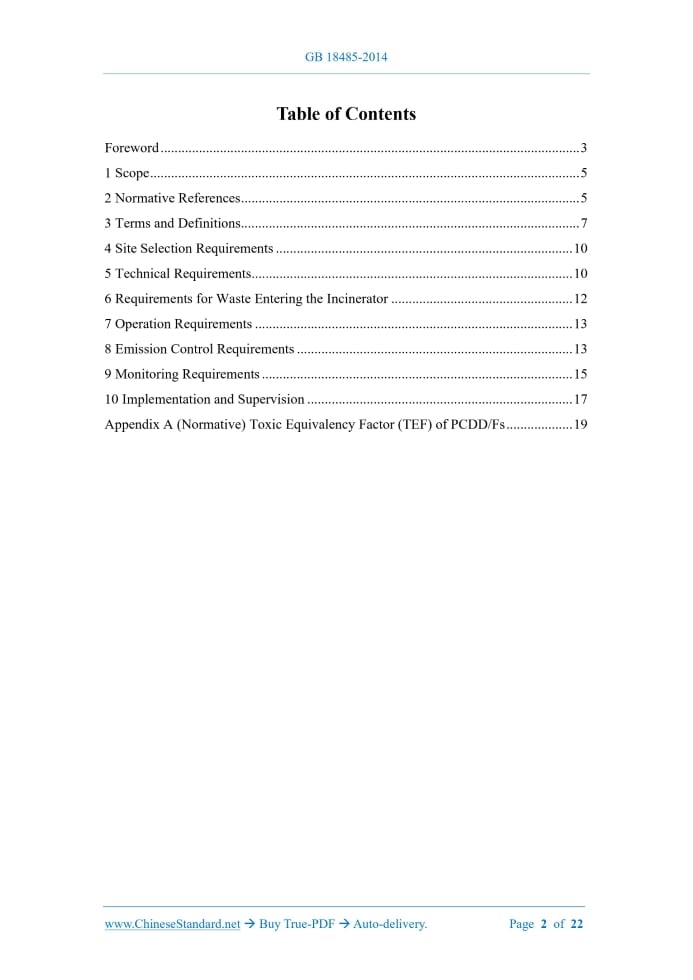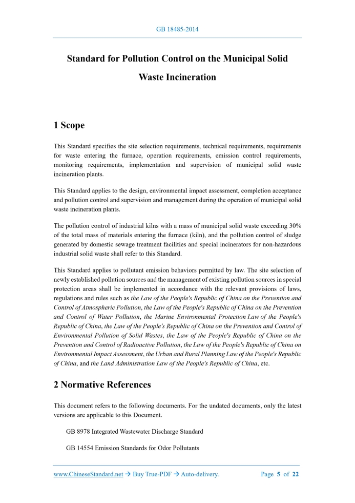Similar standardsGB 18485-2014: Standard for pollution control on the municipal solid waste incineration---This is an excerpt. Full copy of true-PDF in English version (including equations, symbols, images, flow-chart, tables, and figures etc.), auto-downloaded/delivered in 9 seconds, can be purchased online: https://www.ChineseStandard.net/PDF.aspx/GB18485-2014GB NATIONAL STANDARD OF THE PEOPLE’S REPUBLIC OF CHINA Replacing GB 18485-2001 Standard for Pollution Control on the Municipal Solid Waste Incineration [Including 2019XG1 Amendment No.1] Issued on: MAY 16, 2014 Implemented on: JULY 1, 2014 Issued by. Ministry of Environmental Protection; General Administration of Quality Supervision, Inspection and Quarantine. Table of ContentsForeword... 3 1 Scope... 5 2 Normative References... 5 3 Terms and Definitions... 7 4 Site Selection Requirements... 10 5 Technical Requirements... 10 6 Requirements for Waste Entering the Incinerator... 12 7 Operation Requirements... 13 8 Emission Control Requirements... 13 9 Monitoring Requirements... 15 10 Implementation and Supervision... 17 Appendix A (Normative) Toxic Equivalency Factor (TEF) of PCDD/Fs... 19 Standard for Pollution Control on the Municipal Solid Waste Incineration1 ScopeThis Standard specifies the site selection requirements, technical requirements, requirements for waste entering the furnace, operation requirements, emission control requirements, monitoring requirements, implementation and supervision of municipal solid waste incineration plants. This Standard applies to the design, environmental impact assessment, completion acceptance and pollution control and supervision and management during the operation of municipal solid waste incineration plants. The pollution control of industrial kilns with a mass of municipal solid waste exceeding 30% of the total mass of materials entering the furnace (kiln), and the pollution control of sludge generated by domestic sewage treatment facilities and special incinerators for non-hazardous industrial solid waste shall refer to this Standard. This Standard applies to pollutant emission behaviors permitted by law. The site selection of newly established pollution sources and the management of existing pollution sources in special protection areas shall be implemented in accordance with the relevant provisions of laws, regulations and rules such as the Law of the People's Republic of China on the Prevention and Control of Atmospheric Pollution, the Law of the People's Republic of China on the Prevention and Control of Water Pollution, the Marine Environmental Protection Law of the People's Republic of China, the Law of the People's Republic of China on the Prevention and Control of Environmental Pollution of Solid Wastes, the Law of the People's Republic of China on the Prevention and Control of Radioactive Pollution, the Law of the People's Republic of China on Environmental Impact Assessment, the Urban and Rural Planning Law of the People's Republic of China, and the Land Administration Law of the People's Republic of China, etc.2 Normative ReferencesThis document refers to the following documents. For the undated documents, only the latest versions are applicable to this Document. GB 8978 Integrated Wastewater Discharge Standard GB 14554 Emission Standards for Odor Pollutants impact assessment documents have been approved before the implementation of this Standard. 3.13 New municipal solid waste incinerator Newly built, rebuilt and expanded municipal solid waste incinerators whose environmental impact assessment documents are approved after the implementation of this Standard. 3.14 Standard conditions The gas state at temperature of 273.16K and pressure of 101.325kPa. 3.15 Average value The average value of at least 3 sample test values at equal time intervals (30min at minimum, and 8h at maximum) during the sampling period; the sampling time interval for dioxins is 6 h at minimum and 8 h at maximum. 3.16 Hourly average value The arithmetic mean of any pollutant concentration within any 1h; or the arithmetic mean of 4 sample test values collected at equal time intervals within 1h. 3.17 Daily average value The arithmetic mean of 24 consecutive hourly average values. 3.18 Emission concentration at baseline oxygen content The emission limits of various pollutant concentrations specified in this Standard refer to the emission concentration at baseline oxygen content converted with 11% (V/V%) O2 (dry flue gas) as the conversion basis under standard conditions, and are converted according to the following Formula. Where. ρ - emission concentration at baseline oxygen content of atmospheric pollutants, in mg/m3; ρ’ - actually measured emission concentration of atmospheric pollutants, in mg/m3; φ0(O2) - initial oxygen content of combustion-supporting air, in %. When air is used for combustion, it is 21; φ’(O2) - actually measured oxygen content of flue gas, in %.4 Site Selection Requirements4.1 The site selection of a municipal solid waste incineration plant shall comply with the local urban and rural master plan, environmental protection plan and environmental sanitation special plan; and meet the local requirements for prevention and control of air pollution, water resources protection, and natural ecological protection. 4.2 The location of the municipal solid waste incineration plant site and its distance from the surrounding population shall be determined based on the conclusion of the environmental impact assessment. This distance can be used as the basis for planning control after approval by the environmental protection administrative department with approval authority. 4.3 When conducting an environmental impact assessment on the site of a municipal solid waste incineration plant, the leakage of harmful substances that may be generated by various facilities in the municipal solid waste incineration plant, the generation and diffusion of air pollutants (including odorous substances), a