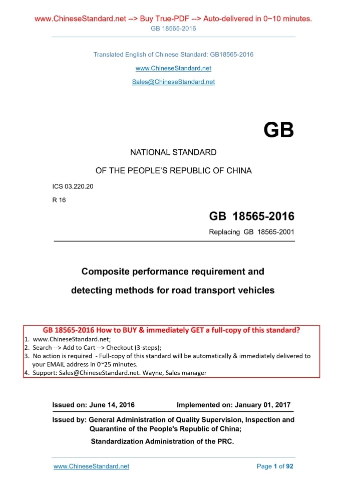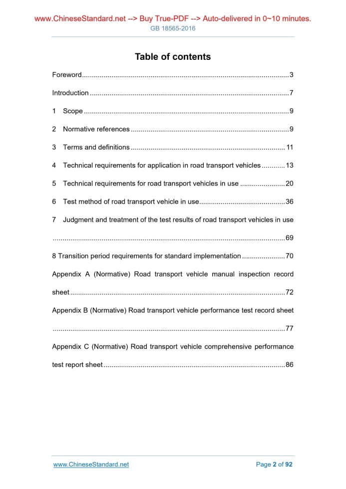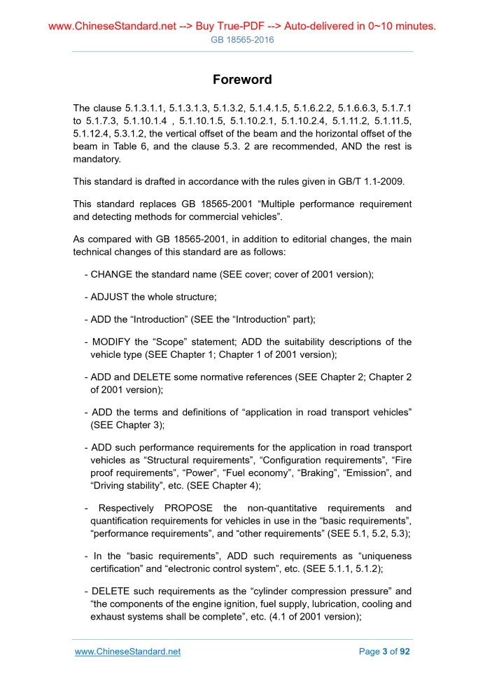 Similar standardsGB 18565-2016: Composite performance requirement and detecting methods for road transport vehicles---This is an excerpt. Full copy of true-PDF in English version (including equations, symbols, images, flow-chart, tables, and figures etc.), auto-downloaded/delivered in 9 seconds, can be purchased online: https://www.ChineseStandard.net/PDF.aspx/GB18565-2016 GB NATIONAL STANDARD OF THE PEOPLE’S REPUBLIC OF CHINA ICS 03.220.20 R 16 Replacing GB 18565-2001 Composite performance requirement and detecting methods for road transport vehicles Issued on: JUNE 14, 2016 Implemented on: JANUARY 01, 2017 Issued by. General Administration of Quality Supervision, Inspection and Quarantine of the People's Republic of China; Standardization Administration of the PRC. Table of ContentsForeword ... 3 Introduction ... 7 1 Scope ... 9 2 Normative references ... 9 3 Terms and definitions ... 11 4 Technical requirements for application in road transport vehicles ... 13 5 Technical requirements for road transport vehicles in use ... 20 6 Test method of road transport vehicle in use ... 36 7 Judgment and treatment of the test results of road transport vehicles in use ... 69 8 Transition period requirements for standard implementation ... 70 Appendix A (Normative) Road transport vehicle manual inspection record sheet ... 72 Appendix B (Normative) Road transport vehicle performance test record sheet ... 77 Appendix C (Normative) Road transport vehicle comprehensive performance test report sheet ... 86ForewordThe clause 5.1.3.1.1, 5.1.3.1.3, 5.1.3.2, 5.1.4.1.5, 5.1.6.2.2, 5.1.6.6.3, 5.1.7.1 to 5.1.7.3, 5.1.10.1.4 , 5.1.10.1.5, 5.1.10.2.1, 5.1.10.2.4, 5.1.11.2, 5.1.11.5, 5.1.12.4, 5.3.1.2, the vertical offset of the beam and the horizontal offset of the beam in Table 6, and the clause 5.3. 2 are recommended, AND the rest is mandatory. This standard is drafted in accordance with the rules given in GB/T 1.1-2009. This standard replaces GB 18565-2001 “Multiple performance requirement and detecting methods for commercial vehicles”. As compared with GB 18565-2001, in addition to editorial changes, the main technical changes of this standard are as follows. - CHANGE the standard name (SEE cover; cover of 2001 version); - ADJUST the whole structure; - ADD the “Introduction” (SEE the “Introduction” part); - MODIFY the “Scope” statement; ADD the suitability descriptions of the vehicle type (SEE Chapter 1; Chapter 1 of 2001 version); - ADD and DELETE some normative references (SEE Chapter 2; Chapter 2 of 2001 version); - ADD the terms and definitions of “application in road transport vehicles” (SEE Chapter 3); - ADD such performance requirements for the application in road transport vehicles as “Structural requirements”, “Configuration requirements”, “Fire proof requirements”, “Power”, “Fuel economy”, “Braking”, “Emission”, and “Driving stability”, etc. (SEE Chapter 4); - Respectively PROPOSE the non-quantitative requirements and quantification requirements for vehicles in use in the “basic requirements”, “performance requirements”, and “other requirements” (SEE 5.1, 5.2, 5.3); - In the “basic requirements”, ADD such requirements as “uniqueness certification” and “electronic control system”, etc. (SEE 5.1.1, 5.1.2); - DELETE such requirements as the “cylinder compression pressure” and “the components of the engine ignition, fuel supply, lubrication, cooling and exhaust systems shall be complete”, etc. (4.1 of 2001 version); - DELETE such requirements as “the technical conditions of the vehicle body and the cab shall be such as able to ensure the driver have normal working conditions and passenger & cargo safety”, the structural size of “safety exit”, “sleeper bus sleeper layout”, “aisle width”, “passenger door first step height”, and “fender”, etc. (SEE 11.8.1,11.8.9,11.8.12 ~ 11.8.15, etc. of 2001 version); - ADD the evaluation indicators of the power of the vehicles in use (SEE 5.2.1); - MODIFY the fuel consumption limit of the vehicles in use (SEE 5.2.2; Chapter 4 and 12.2 of 2001 version); - ADD the requirements for the braking system of the vehicles in use and the braking performance of category O3 and O4 trailers and semi-trailers (SEE 5.2.3); - MODIFY the requirements for the limit of the emission pollutants of the ignition engine of the vehicles in use and the emission visible pollutants of the compression-ignition engine vehicles; ADD the requirements of ignition engine using the sample working condition method and the compression-ignition engine using the load deceleration method (SEE 5.2.4; 9.1 and 12.7 of 2001 version); - DELETE the requirements for the “gasoline vehicle fuel evaporation pollutant emission control” and “vehicle stationary noise” (SEE 9.1.3 and 9.2.1 of 2001 version); - ADD the requirements for the “lateral slip of the steering wheel” of the double steering axle of the vehicles in use (SEE 5.2.5.1); - MODIFY the evaluation indicators of the “wheel retardation rate” of the vehicles in use (SEE 5.3.3; 6.13.1.5 of 2001 version); - ADD and MODIFY the test methods of the basic requirements and the performance requirements of the vehicles in use (SEE Chapter 6); - MODIFY the test methods of the “power”, “fuel consumption”, and “braking performance” of the vehicles in use (SEE 6.5, 6.6 and 6.7, etc.); - DELETE the methods of evaluating the “suspension characteristics” using a flat-type braking test-bed (SEE 7.6.2 of 2001 version); - ADD the “judgment and treatment of the test results of the road vehicles in use” (SEE Chapter 7);IntroductionRoad transport vehicles have distinctive characteristics and features, AND their operating intensity, operating mileage, and failure frequency are much higher than the ordinary social vehicles. In all kinds of traffic accidents, the road transport vehicles constitute the main road traffic accidents, in additio