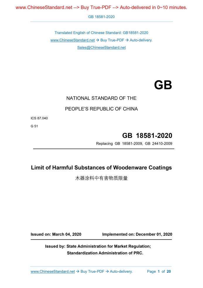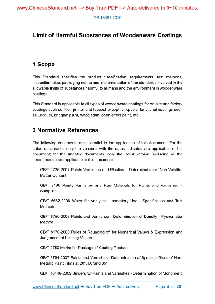 Similar standardsGB 18581-2020: Limit of Harmful Substances of Woodenware Coatings---This is an excerpt. Full copy of true-PDF in English version (including equations, symbols, images, flow-chart, tables, and figures etc.), auto-downloaded/delivered in 9 seconds, can be purchased online: https://www.ChineseStandard.net/PDF.aspx/GB18581-2020GB NATIONAL STANDARD OF THE PEOPLE’S REPUBLIC OF CHINA ICS 87.040 G 51 Replacing GB 18581-2009, GB 24410-2009 Limit of Harmful Substances of Woodenware Coatings Issued on. MARCH 04, 2020 Implemented on. DECEMBER 01, 2020 Issued by. State Administration for Market Regulation; Standardization Administration of PRC. Table of ContentsForeword... 3 1 Scope... 5 2 Normative References... 5 3 Terms and Definitions... 6 4 Product Classification... 7 5 requirements... 8 6 Test Methods... 11 7 Inspection Rules... 13 8 Packaging Mark... 14 9 Implementation of Standard... 15 Appendix A (Normative) Determination of Moisture Content – Gas Chromatography... 16 Bibliography... 201 ScopeThis Standard specifies the product classification, requirements, test methods, inspection rules, packaging marks and implementation of the standards involved in the allowable limits of substances harmful to humans and the environment in woodenware coatings. This Standard is applicable to all types of woodenware coatings for on-site and factory coatings such as filler, primer and topcoat except for special functional coatings such as Lacquer, bridging paint, wood stain, open effect paint, etc.2 Normative ReferencesThe following documents are essential to the application of this document. For the dated documents, only the versions with the dates indicated are applicable to this document; for the undated documents, only the latest version (including all the amendments) are applicable to this document. GB/T 1725-2007 Paints Varnishes and Plastics – Determination of Non-Volatile- Matter Content GB/T 3186 Paints Varnishes and Raw Materials for Paints and Varnishes – Sampling GB/T 6682-2008 Water for Analytical Laboratory Use - Specification and Test Methods GB/T 6750-2007 Paints and Varnishes - Determination of Density - Pycnometer Method GB/T 8170-2008 Rules of Rounding off for Numerical Values & Expression and Judgement of Limiting Values GB/T 9750 Marks for Package of Coating Product GB/T 9754-2007 Paints and Varnishes - Determination of Specular Gloss of Non- Metallic Paint Films at 20°, 60°and 85° GB/T 18446-2009 Binders for Paints and Varnishes - Determination of Monomeric Diisocyanate in Isocyanate Resins GB/T 23985-2009 Paints and Varnishes - Determination of Volatile Organic Compound (VOC) Content - Difference Method GB/T 23986-2009 Paints and Varnishes - Determination of Volatile Organic Compound (VOC) Content - Gas-Chromatographic Method GB/T 23990-2009 Determination of the Contents of Benzene, Toluene, Ethylbenzene, and Xylene in Coatings by Gas Chromatography GB/T 23991-2009 Determination of Soluble Harmful Elements Content of Coatings3 Terms and DefinitionsFor the purpose of this document, the following terms and definitions apply. 3.1 Polyurethane coatings A type of coating that uses polyurethane resin formed by the reaction of polyisocyanate and active hydrogen-containing compound as the main film-forming material. 3.2 Nitrocellulose coatings A type of coating that uses nitrocellulose prepared by the esterification reaction of a mixture of nitric acid and sulfuric acid with cellulose as the main film-forming material. 3.3 Alkyd coatings A type of coating that uses alkyd resin prepared by polyacid, fatty acid (or vegetable oil) and polyhydric alcohol as the main film-forming material. 3.4 Unsaturated polyester coatings A type of coating that uses unsaturated polyester resins with carbon-carbon double bonds on the polymer chain that are easily crosslinked with reactive diluents as the main film-forming materials. 3.5 Volatile organic compound; VOC Organic compounds that participate in atmospheric photochemical reactions, or organic compounds determined in accordance with relevant provisions. 3.6 Volatile organic compound content; VOC content The mass of the volatile organic compounds in the coating that is measured under the specified conditions.4 Product ClassificationThis Standard classifies woodenware coatings into solvent-based coatings (including filler), water-based coatings (including filler), radiation curing coatings (including filler), and powder coatings. Thereof, solvent-based coatings (including filler) are divided into polyurethane, nitrocellulose (only for factory coating use),5 requirementsThe limit value of the limit of harmful substances in woodenware coatings shall meet the requirements of Table 1.6 Test Methods6.1 Sampling Sampling according to the provisions of GB/T 3186, or according to the agreed method. The sampling amount is determined according to the inspection requirements. 6.2 Test methods 6.2.1 VOC content 6.2.1.1 Density Perform according to the provisions of GB/T 6750-2007; the test temperature is (23±0.5) °C. 6.2.1.2 Luster Perform according to the provisions of GB/T 9754-2007.Use a wet film preparation device with a groove depth of (100 ± 2) µm to prepare a sample plate on a flat glass plate. The varnish shall use black glass or flat glass with a matte black paint on the back as the substrate. After drying the sample plate for 48h at a temperature of (23±2) °C and a relative humidity of (50±5) %, test it with a 60° specular gloss meter. 6.2.1.3 Moisture content Perform according to the provisions of Appendix A. Perform according to the provisions of GB/T 34682-2017.The moisture shall not be measured, the moisture content is set to zero. 6.2.1.7 VOC content in radiation curable coatings (including filler) Perform according to the provisions of GB/T 34675-2017.Filler samples are not tested for moisture content (moisture content is set to zero) and density. 6.2.2 Formaldehyde content Perform according to the provisions of GB/T 2