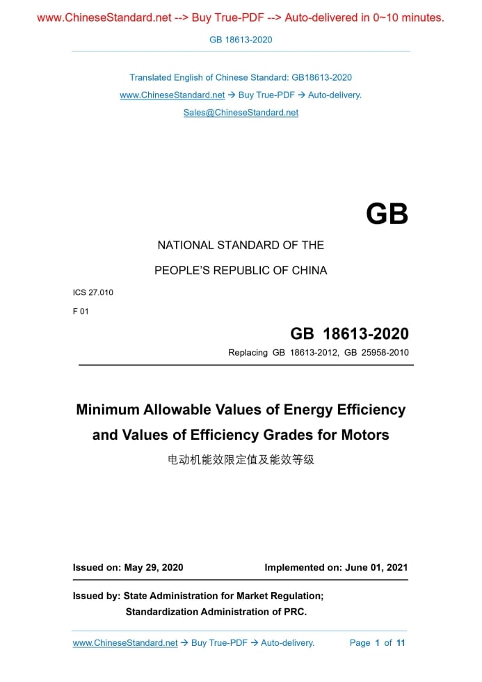 GB 18613-2020: Minimum Allowable Values of Energy Efficiency and Values of Efficiency Grades for Motors Delivery: 9 seconds. True-PDF full-copy in English & invoice will be downloaded + auto-delivered via email. See step-by-step procedure Status: Valid GB 18613: Historical versions