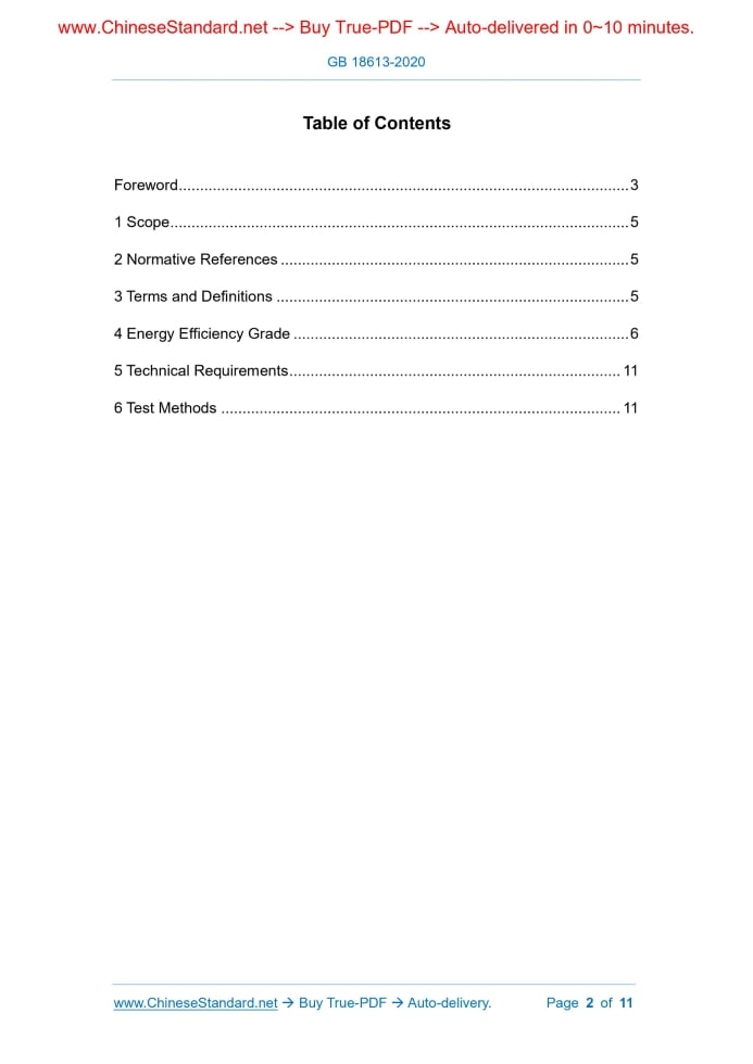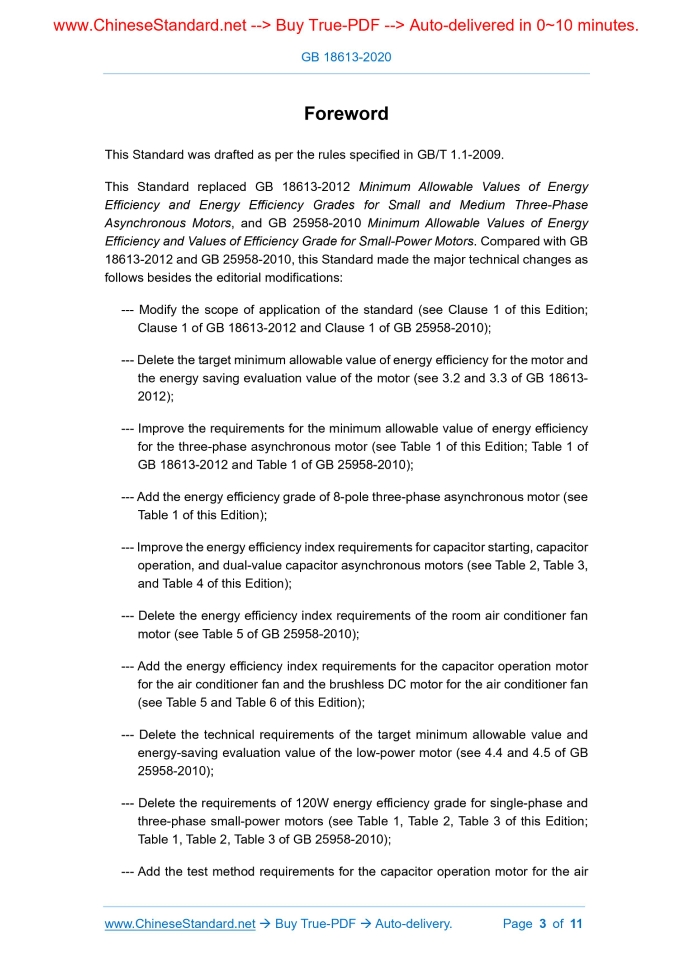 GB 18613-2020: Minimum Allowable Values of Energy Efficiency and Values of Efficiency Grades for Motors---This is an excerpt. Full copy of true-PDF in English version (including equations, symbols, images, flow-chart, tables, and figures etc.), auto-downloaded/delivered in 9 seconds, can be purchased online: https://www.ChineseStandard.net/PDF.aspx/GB18613-2020 GB NATIONAL STANDARD OF THE PEOPLE’S REPUBLIC OF CHINA ICS 27.010 F 01 Replacing GB 18613-2012, GB 25958-2010 Minimum Allowable Values of Energy Efficiency and Values of Efficiency Grades for Motors Issued on. MAY 29, 2020 Implemented on. JUNE 01, 2021 Issued by. State Administration for Market Regulation; Standardization Administration of PRC. Table of ContentsForeword... 3 1 Scope... 5 2 Normative References... 5 3 Terms and Definitions... 5 4 Energy Efficiency Grade... 6 5 Technical Requirements... 11 6 Test Methods... 11ForewordThis Standard was drafted as per the rules specified in GB/T 1.1-2009. This Standard replaced GB 18613-2012 Minimum Allowable Values of Energy Efficiency and Energy Efficiency Grades for Small and Medium Three-Phase Asynchronous Motors, and GB 25958-2010 Minimum Allowable Values of Energy Efficiency and Values of Efficiency Grade for Small-Power Motors. Compared with GB 18613-2012 and GB 25958-2010, this Standard made the major technical changes as follows besides the editorial modifications. --- Modify the scope of application of the standard (see Clause 1 of this Edition; Clause 1 of GB 18613-2012 and Clause 1 of GB 25958-2010); --- Delete the target minimum allowable value of energy efficiency for the motor and the energy saving evaluation value of the motor (see 3.2 and 3.3 of GB 18613- 2012); --- Improve the requirements for the minimum allowable value of energy efficiency for the three-phase asynchronous motor (see Table 1 of this Edition; Table 1 of GB 18613-2012 and Table 1 of GB 25958-2010); --- Add the energy efficiency grade of 8-pole three-phase asynchronous motor (see Table 1 of this Edition); --- Improve the energy efficiency index requirements for capacitor starting, capacitor operation, and dual-value capacitor asynchronous motors (see Table 2, Table 3, and Table 4 of this Edition); --- Delete the energy efficiency index requirements of the room air conditioner fan motor (see Table 5 of GB 25958-2010); --- Add the energy efficiency index requirements for the capacitor operation motor for the air conditioner fan and the brushless DC motor for the air conditioner fan (see Table 5 and Table 6 of this Edition); --- Delete the technical requirements of the target minimum allowable value and energy-saving evaluation value of the low-power motor (see 4.4 and 4.5 of GB 25958-2010); --- Delete the requirements of 120W energy efficiency grade for single-phase and three-phase small-power motors (see Table 1, Table 2, Table 3 of this Edition; Table 1, Table 2, Table 3 of GB 25958-2010); --- Add the test method requirements for the capacitor operation motor for the air conditioner fan and the brushless DC motor for the air conditioner fan (see Clause 6 of this Edition); --- Modify the requirements for test method (see Clause 6 of this Edition; Clause 6 of GB 25958-2010 and Clause 6 of GB 18613-2012). This Standard was proposed by and under the jurisdiction of Standardization Administration of PRC. Drafting organizations of this Standard. China National Institute of Standardization; Shanghai Electrical and Apparatus Research Institute (Group) Co., Ltd.; China National Electric Apparatus Research Institute Co., Ltd.; Vkan Certification & Testing Co., Ltd.; Shanghai Testing & Inspection Institute for Electrical Equipment Co., Ltd.; Jiamusi Electric Machine Co., Ltd.; Shanghai Engineering Research Center for Motor System Energy Saving Co., Ltd.; Wolong Electric Nanyang Explosion Protection Group Co., Ltd.; Hebei Electric Motor Co., Ltd.; Anhui Wannan Electric Machine Co., Ltd.; ABB Shanghai Motors Co., Ltd.; Jiangsu Dazhong Electric Motor Co., Ltd.; Shandong Huali Motor Group Co.. Ltd.; Siemens (China) Co., Ltd.; SEW-Electric Machines (Suzhou) Co., Ltd.; Sumitomo Heavy Industries Reducer (China) Co., Ltd.; Technical Center for Mechanical and Electrical Product Inspection and Testing of Shanghai Customs District; Fujian Inspection and Research Institute for Product Quality; Zhuhai Kaibang Motor Manufacture Co., Ltd.; Hangzhou Jiangchao Motor Co., Ltd.; Panasonic Motor (Hangzhou) Co., Ltd.; Zhongda Motors Co., Ltd.; Daily Static Reducer Manufacturing (Changzhou) Co., Ltd.; International Copper Association Shanghai Office; Yunnan Copper Science & Technology Development Co., Ltd.; Fans- Tech Electric Co., Ltd.; Beijing Industrial IOT Solutions Co., Ltd.; CQC Standard (Shanghai) Testing Technology Co., Ltd.; Qixing Intelligence Technology Co., Ltd.; Jiaxing Vkan Certification & Testing Co., Ltd.; Shanghai Energy Efficiency Center; Shandong Institute for Product Quality Inspection; and Regal Beloit (Wuxi) Co., Ltd. Chief drafting staffs of this Standard. Liu Ren, Chen Weihua, Zhang Chuanjia, Yan Beilan, Li Xiuying, Wu Yunshan, Chang Yanqin, Sun Yue, Wang Qingdong, Sun Baoqi, Zhang Wei, Wang Hefen, Li Hongjun, Zhang Yunzhe, Li Menglin, Li Ming, Li Ziqi, Wang Keguang, Zhang Hongxian, Chen Dongsuo, Liu Haixin, Lan Yuhua, Liang Guanxian, Zhang Xiong, Song Songlin, Xu Guochang, Wu Wenjun, Chen Haihong, Li Lin, Wang Gen, Liang Dong, Yang Xu, Yao Lei, Yu Zhao, Zhou Sheng, Liu Mingtao, Zhou Weijie, Sun Baoshi, Chen Li, Qin Hongbo, Wang Zhonghang, and Lu jinduo. The historical editions replaced by this Standard are as follows. --- GB 18613-2002, GB 18613-2006, GB 18613-2012; --- GB 25958-2010. Minimum Allowable Values of Energy Efficiency and Values of Efficiency Grades for Motors1 ScopeThis Standard specifies the energy efficiency grades, minimum allowable values of energy efficiency and test methods for three-phase asynchronous motors, single- phase asynchronous motors, and motors for air conditioner fans. This Sta