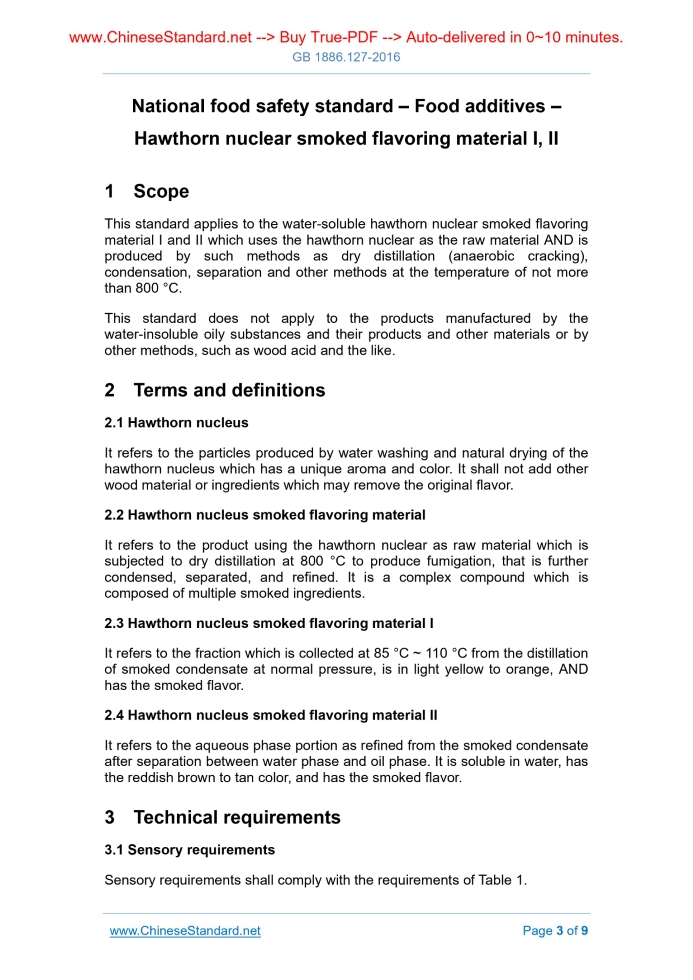 Similar standardsGB 1886.127-2016: National Food Safety Standard -- Food Additives -- Hawthorn nuclear smoked flavouring material I, II---This is an excerpt. Full copy of true-PDF in English version (including equations, symbols, images, flow-chart, tables, and figures etc.), auto-downloaded/delivered in 9 seconds, can be purchased online: https://www.ChineseStandard.net/PDF.aspx/GB1886.127-2016 GB NATIONAL STANDARD OF THE PEOPLE’S REPUBLIC OF CHINA National food safety standard – Food additives – Hawthorn nuclear smoked flavoring material I, II Issued on: AUGUST 31, 2016 Implemented on: JANUARY 01, 2017 Issued by. National Health and Family Planning Commission of the PRC 3. No action is required - Full-copy of this standard will be automatically & immediately delivered to your EMAIL address in 0~60 minutes. Table of Contents1 Scope ... 3 2 Terms and definitions ... 3 3 Technical requirements ... 3 Appendix A Testing method ... 5 National food safety standard – Food additives – Hawthorn nuclear smoked flavoring material I, II1 ScopeThis standard applies to the water-soluble hawthorn nuclear smoked flavoring material I and II which uses the hawthorn nuclear as the raw material AND is produced by such methods as dry distillation (anaerobic cracking), condensation, separation and other methods at the temperature of not more than 800 °C. This standard does not apply to the products manufactured by the water-insoluble oily substances and their products and other materials or by other methods, such as wood acid and the like.2 Terms and definitions2.1 Hawthorn nucleus It refers to the particles produced by water washing and natural drying of the hawthorn nucleus which has a unique aroma and color. It shall not add other wood material or ingredients which may remove the original flavor. 2.2 Hawthorn nucleus smoked flavoring material It refers to the product using the hawthorn nuclear as raw material which is subjected to dry distillation at 800 °C to produce fumigation, that is further condensed, separated, and refined. It is a complex compound which is composed of multiple smoked ingredients. 2.3 Hawthorn nucleus smoked flavoring material I It refers to the fraction which is collected at 85 °C ~ 110 °C from the distillation of smoked condensate at normal pressure, is in light yellow to orange, AND has the smoked flavor. 2.4 Hawthorn nucleus smoked flavoring material II It refers to the aqueous phase portion as refined from the smoked condensate after separation between water phase and oil phase. It is soluble in water, has the reddish brown to tan color, and has the smoked flavor.3 Technical requirements3.1 Sensory requirements Sensory requirements shall comply with the requirements of Table 1.Appendix ATesting method A.1 General provisions The reagents and water used in this standard, unless otherwise specified, refers to the analytical pure reagents and the level III water as specified in GB/T 6682. The standard solutions, impurity standard solutions, preparations and products used in the tests shall be prepared in accordance with the provisions of GB/T 601, GB/T 602 and GB/T 603, unless otherwise specified. The solution used in the test, unless otherwise specified of the solvent, refers to the aqueous solution. A.2 Determination of phenol content (expressed as 2,6-dimethoxyphenol) - modified Gibbs method A.2.1 Method summary The phenolic compounds in the smoked solution react with the colorant 2,6-dihydroquinone chloroimine (2,6-DcGc) in alkaline boric acid-potassium chloride buffer to form blue indophenol. After forming the color, the absorbance A is measured at 560 nm AND it is quantified by the absorbance standard curve of guaiacol (or other known phenol). This method cannot distinguish between the various phenols, BUT can only provide the total phenol content of guaiacol. A.2.2 Reagents and materials A.2.2.1 Boric acid-potassium chloride buffer solution. pH = 8.3. 125 mL of 0.4 mol/L boric acid solution; 125 mL of 0.4 mol/L potassium chloride solution; 40 mL of 0.2 mol/L sodium hydroxide solution. MIX these three solutions; USE water to dilute it to 1000 mL. A.2.2.2 NaOH solution. 6 g/L. A.2.2.3 Developer solution. WEIGH 0.25 g of 2,6-dihydroquinone chloride imine in 30 mL of absolute ethanol; COOL it before storage. A.2.2.4 Guaiacol standard solution. USE water to prepare 1 μg/mL ~ 20 μg/mL standard solution, to draw the standard curve of absorbance A and the guaiacol concentration B (μg/mL). A.2.2.5 Smoked sample solution. TAKE 0.5 mL of hawthorn nuclear smoked flavor, USE water to dilute it to 1000 mL (dilution factor is dependent on the concentration of sample, so that the absorbance A of the sample dilution is between 0.2 ~ 0.7). The total carbonyl compound in the smoked flavor material and the 2,4-dinitrophenyl hydrazine (abbreviated as 2,4-DNPH) are converted to a red hydrazone derivative at 60 °C in an acidic medium, AND the absorbance A is measured at 430 nm, so as to calculate the content of the carbonyl compound (expressed as heptanal or other known aldehydes). A.3.2.2 Reagents and materials A.3.2.2.1 Methanol free of carbonyl compounds. ADD 1% 2,4-DNPH into methanol; ADD several drops of hydrochloric acid; LET it backflow for 3 h; DISTILL it. A.3.2.2.2 2,4-DNPH saturated solution. USE the methanol free of carbonyl compounds to dissolve 2,4-DNPH; DILUTE it to make its content reach to 0.05%; SHAKE it for 1 h or PREPARE it 24 h in advance. It shall have the precipitation of insoluble 2,4-DNPH; FILTER and PRESERVE it, AND the shelf life is one week. A.3.2.2.3 Potassium hydroxide solution. ADD 10 g of potassium hydroxide into 20 mL of water; USE the methanol free of carbonyl compounds to dilute it to 100 mL. A.3.2.2.4 2-Butanone standard solution. USE the methanol free of carbonyl compounds to prepare 10 mg/100 mL of 2-butanone standard solution, which is used to draw the standard curve of absorbance A-2-butanone concentration (mg/100 mL). A.3.2.2.5 0.05% sample