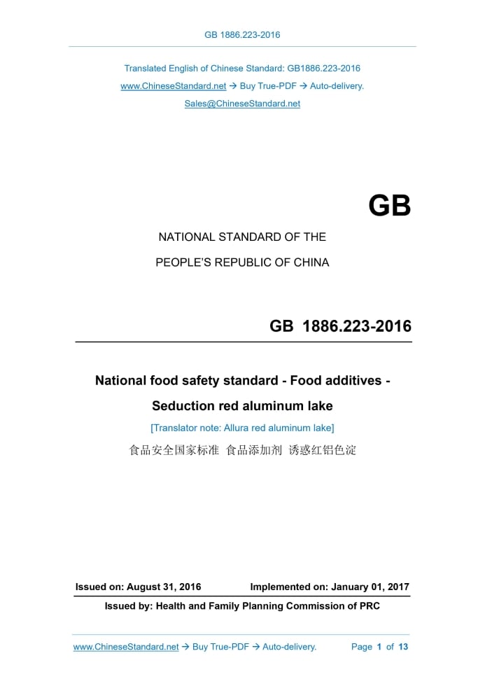 GB 1886.223-2016: National food safety standard - Food additives - Seduction Red Aluminum Lake Delivery: 9 seconds. True-PDF full-copy in English & invoice will be downloaded + auto-delivered via email. See step-by-step procedure Status: Valid