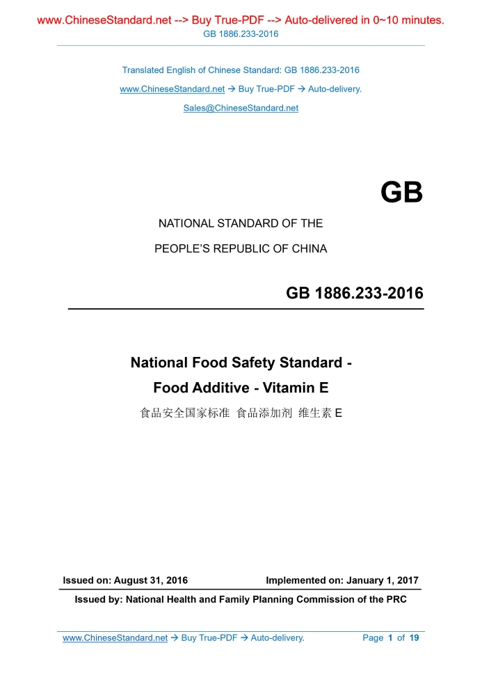 GB 1886.233-2016: National food safety standard - Food additives - Vitamin E Delivery: 9 seconds. True-PDF full-copy in English & invoice will be downloaded + auto-delivered via email. See step-by-step procedure Status: Valid