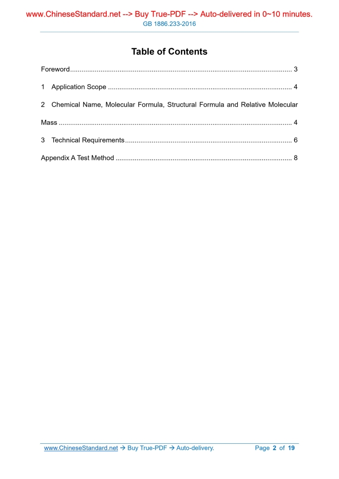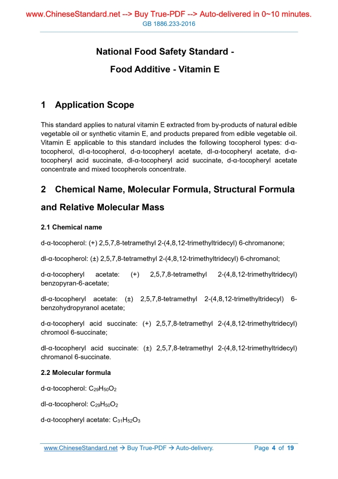 Similar standardsGB 1886.233-2016: National food safety standard - Food additives - Vitamin E---This is an excerpt. Full copy of true-PDF in English version (including equations, symbols, images, flow-chart, tables, and figures etc.), auto-downloaded/delivered in 9 seconds, can be purchased online: https://www.ChineseStandard.net/PDF.aspx/GB1886.233-2016NATIONAL STANDARD OF THE PEOPLE’S REPUBLIC OF CHINA National Food Safety Standard - Food Additive - Vitamin E Issued on. AUGUST 31, 2016 Implemented on. JANUARY 1, 2017 Issued by. National Health and Family Planning Commission of the PRC Table of ContentsForeword... 3 1 Application Scope... 4 2 Chemical Name, Molecular Formula, Structural Formula and Relative Molecular Mass... 4 3 Technical Requirements... 6 Appendix A Test Method... 8ForewordThis Standard replaces GB 19191-2003, Food Additive. Natural Vitamin E. Compared with GB 19191-2003, the major changes of this Standard are as follows. -- Change the standard name into “National Food Safety Standard - Food Additive. Vitamin E”; -- Modify the tocopherol species contained in vitamin E; -- Add refractive index requirements; -- Add absorption coefficient indicator requirements. National Food Safety Standard - Food Additive - Vitamin E1 Application ScopeThis standard applies to natural vitamin E extracted from by-products of natural edible vegetable oil or synthetic vitamin E, and products prepared from edible vegetable oil. Vitamin E applicable to this standard includes the following tocopherol types. d-α- tocopherol, dl-α-tocopherol, d-α-tocopheryl acetate, dl-α-tocopheryl acetate, d-α- tocopheryl acid succinate, dl-α-tocopheryl acid succinate, d-α-tocopheryl acetate concentrate and mixed tocopherols concentrate.2 Chemical Name, Molecular Formula, Structural Formulaand Relative Molecular Mass 2.1 Chemical name 2.2 Molecular formula 2.3 structural formula For d-α-tocopherol, dl-α-tocopherol, d-α-tocopheryl acetate, dl-α-tocopheryl acetate, d-α-tocopheryl acid succinate, dl-α-tocopheryl acid succinate, d-α-tocopheryl acetate concentrate and mixed tocopherols concentrate, the R1 group, R2 group, R3 group and R4 group corresponding to their structural formula are shown as Table 1. 2.4 Relative molecular mass d-α-tocopherol. 430.71 (according to the international relative atomic mass in 2013); dl-α-tocopherol. 430.71 (according to the international relative atomic mass in 2013); d-α-tocopheryl acetate. 472.75 (according to the international relative atomic mass in 2013);3 Technical Requirements3.1 Sensory requirements Sensory requirements should be in accordance with Table 2.Appendix ATest Method A.1 General provisions Unless otherwise specified in this standard, the purity of reagents used shall be above the grade of analytical reagent; the used standard titration solutions, the standard solutions for the determination of impurities, the preparations and products shall be prepared in accordance with the provisions of GB/T 601, GB/T 602 and GB/T 603; the test water should meet the requirements of grade-3 water specified by GB/T 6682. The solution used in the test, if not indicated which solvent is used, refers to aqueous solution. A.2 Identification test A.2.1 Reagents and materials A.2.1.1 Absolute ethanol. A.2.1.2 Nitric acid. A.2.2 Identification method A.3 Content determination A.3.1 Reagents and materials A.3.1.1 Cetyl palmitate. A.3.1.2 α-tocopherol reference substance. A.3.1.3 α-tocopheryl acetate reference substance. A.3.1.4 α-tocopheryl acid succinate reference substance. A.3.1.5 n-hexane. A.3.2 Instruments and apparatuses Gas chromatography. A.3.3 Analysis steps A.3.3.1 Determination of d-α-tocopherol content A.3.3.1.2 Reference chromatographic conditions SE-30 capillary column; hydrogen flame ion detector; keep the oven temperature at 250°C; the vaporization temperature and detection temperature are 300°C; the carrier gas is nitrogen; adjust the carrier gas flow rate to make the internal standard peak retention time at 18 min ~ 20 min. Inject 1 μL of the reference solution into the chromatograph; record the chromatogram. A.3.3.1.3 Correction factor determination Inject 1 μL of reference solution into the gas chromatograph; record the chromatogram; measure Aref1, the peak area of the α-tocopherol, and Aint1, the peak area of the internal standard peak; calculate the correction factor f1 according to Formula (A.1). A.3.3.1.4 Determination Inject 1 μL of the sample solution into the gas chromatograph; record the chromatogram; calculate the peak area of α-tocopherol, β- and γ-tocopherol, and δ- tocopherol (Aα2, Aβ,γ2, Aδ2); calculate the sum of the first three items (At2) and the internal standard peak area Aint2; calculate the content according to Formula (A.2) and Formula (A.3). A.3.3.2.1 Solution preparation The internal standard solution and the reference solution are the same as A.3.3.1.1. Sample solution. weigh an appropriate amount of sample; accurate to 0.02 mg; place it in a brown volumetric flask; add internal standard solution to dilute to 10.0 mL; shake to dissolve to gain a solution containing d-β-+d-γ-tocopherol of about 1.5 mg/mL. A.3.3.2.2 Reference chromatographic conditions Same as A.3.3.1.2. A.3.3.2.3 Correction factor determination Same as A.3.3.1.3. A.3.3.3.4 Determination Inject 1 μL of sample solution into the gas chromatograph; record the chromatogram. Calculate Asample7, the peak area of the α-tocopheryl acetate, and Aint7, the peak area of the internal standard; calculate the content according to Formula (A.7). A.6 Determination of absorbance coefficient A.6.1 Reagents and materials Absolute ethanol. A.6.2 Instruments and apparatuses Spectrophotometry. A.6.3 Analysis steps Weigh about 0.02 g of sample; accurate to 0.002 g; add absolute ethanol and dilute to 200 mL; shake well to obtain the sample solution. Take the sample solution in a 1 cm cuvette; use absolute ethanol as a blank control; use spectrometer to measu