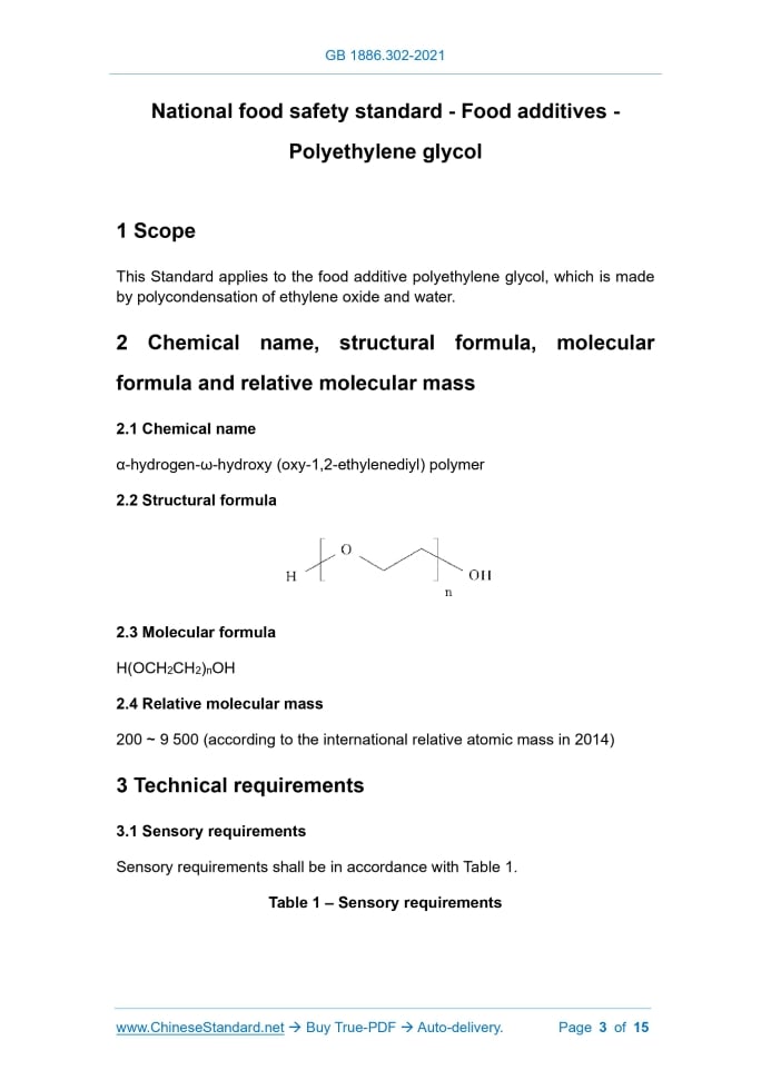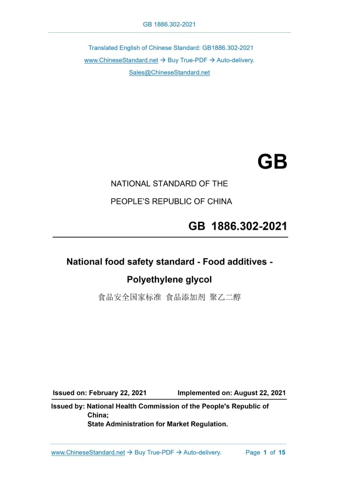 GB 1886.302-2021: National food safety standard - Food additives - Polyethylene glycol Delivery: 9 seconds. True-PDF full-copy in English & invoice will be downloaded + auto-delivered via email. See step-by-step procedure Status: Valid
