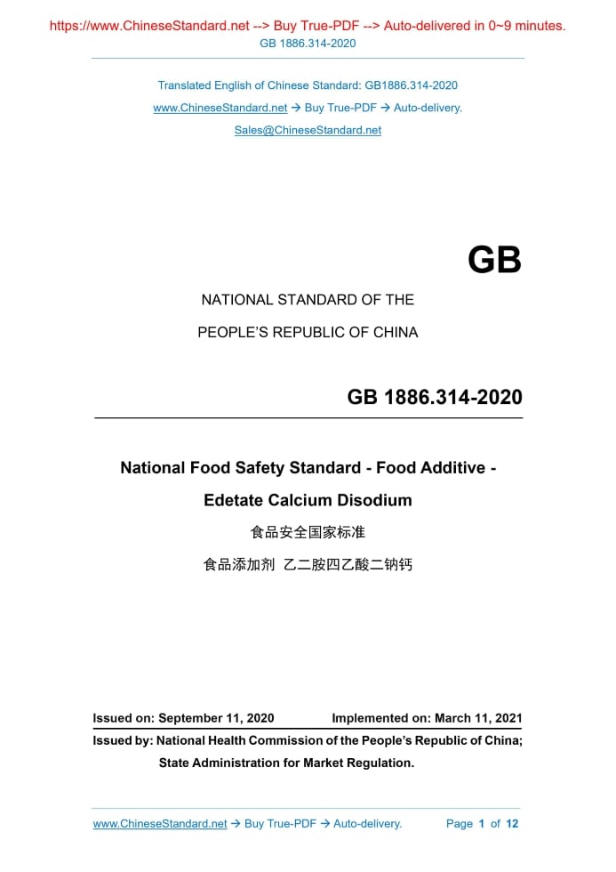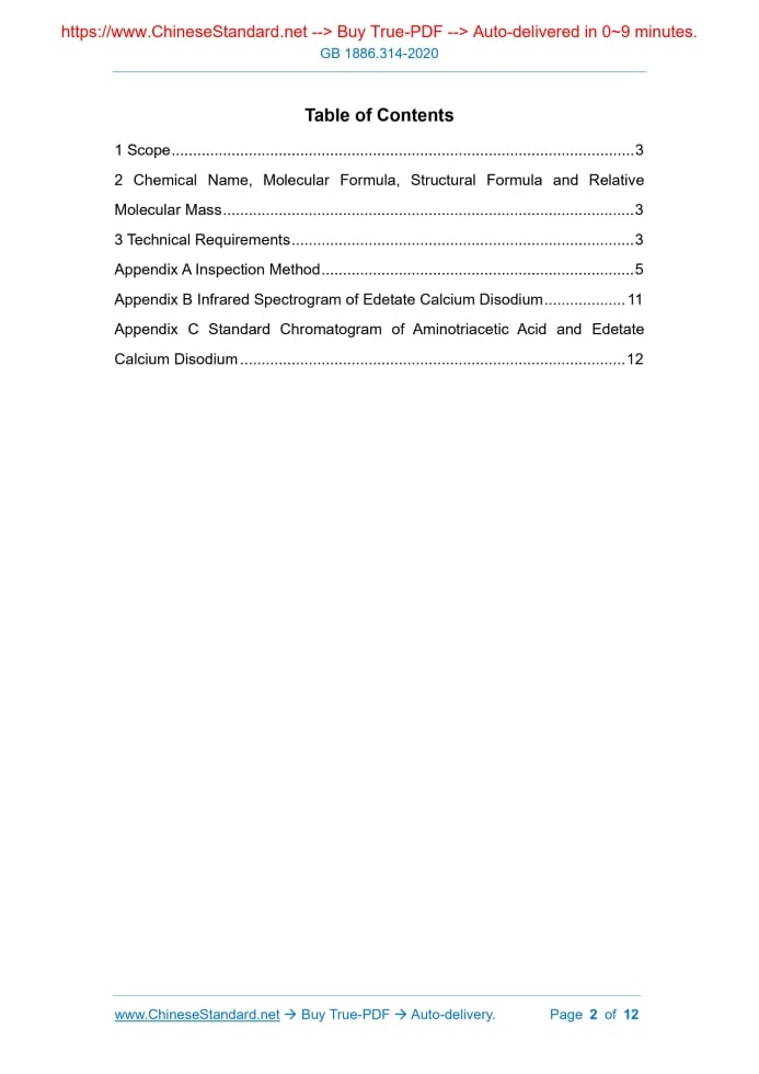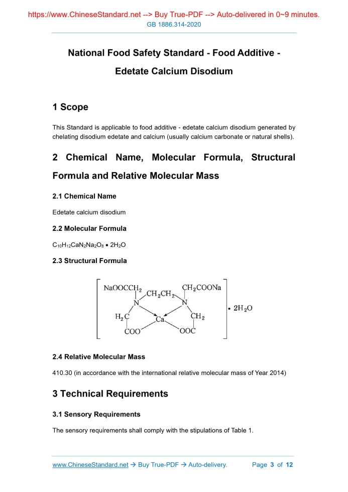 Similar standardsGB 1886.314-2020: National food safety standard - Food additives - Edetate Calcium Disodium---This is an excerpt. Full copy of true-PDF in English version (including equations, symbols, images, flow-chart, tables, and figures etc.), auto-downloaded/delivered in 9 seconds, can be purchased online: https://www.ChineseStandard.net/PDF.aspx/GB1886.314-2020GB NATIONAL STANDARD OF THE PEOPLE’S REPUBLIC OF CHINA National Food Safety Standard - Food Additive - Edetate Calcium Disodium ISSUED ON: SEPTEMBER 11, 2020 IMPLEMENTED ON: MARCH 11, 2021 Issued by: National Health Commission of the People’s Republic of China; State Administration for Market Regulation. Table of Contents1 Scope ... 3 2 Chemical Name, Molecular Formula, Structural Formula and Relative Molecular Mass ... 3 3 Technical Requirements ... 3 Appendix A Inspection Method ... 5 Appendix B Infrared Spectrogram of Edetate Calcium Disodium ... 11 Appendix C Standard Chromatogram of Aminotriacetic Acid and Edetate Calcium Disodium ... 12 National Food Safety Standard - Food Additive - Edetate Calcium Disodium1 ScopeThis Standard is applicable to food additive - edetate calcium disodium generated by chelating disodium edetate and calcium (usually calcium carbonate or natural shells). 2 Chemical Name, Molecular Formula, Structural Formula and Relative Molecular Mass 2.1 Chemical Name Edetate calcium disodium 2.2 Molecular Formula C10H12CaN2Na2O8 2H2O 2.3 Structural Formula 2.4 Relative Molecular Mass 410.30 (in accordance with the international relative molecular mass of Year 2014)3 Technical Requirements3.1 Sensory Requirements The sensory requirements shall comply with the stipulations of Table 1.Appendix AInspection Method A.1 General Provisions When no other requirements are indicated, the reagents and water used in this Standard refer to analytically pure reagents and Grade-3 water specified in GB/T 6682. When no other requirements are indicated, the standard titration solutions, and standard solutions, preparations and products for impurity determination shall be prepared in accordance with the stipulations of GB/T 601, GB/T 602 and GB/T 603. When the solvent used for solution preparation is not specified, it refers to aqueous solution in the tests. A.2 Identification Test A.2.1 Method summary Use the flame test to identify the sodium ions in the sample; use the oxalic acid test to identify the calcium ions in the sample; the residual ethylene diamine tetra-acetic acid ions in edetate calcium disodium can make the iron chloride solution fade, so as to identify the ethylene diamine tetra-acetic acid ions. Infrared spectroscopy is a qualitative analysis of edetate calcium disodium in accordance with the absorption bands of the ionic groups of the constituent substances within the infrared range (mid- infrared: 400 cm-1 ~ 4,000 cm-1). A.2.2 Reagents and materials A.2.2.1 Ammonium hydroxide solution (6 mol/L): measure-take 400 mL of 28% ammonium hydroxide solution; use water to dilute it to 1,000 mL. A.2.2.2 Ammonium oxalate solution (0.5 mol/L): take 3.5 g of ammonium oxalate monohydrate; dissolve it in water to 100 mL. A.2.2.3 Ammonium thiocyanate solution (0.02 g/mL): weigh-take 2 g of ammonium thiocyanate; dissolve it in water to 100 mL. A.2.2.4 Hydrochloric acid solution (3 mol/L): measure-take 226 mL of hydrochloric acid; use water to dilute it to 1,000 mL. A.2.2.5 Ferric chloride solution (1 mol/L): weigh-take 9 g of ferric chloride hexahydrate; dissolve it in water to 100 mL. A.2.2.6 Methyl red solution: weigh-take 100 mg of methyl red; dissolve it in 100 mL of ethanol; if necessary, filter it. A.2.3 Instruments and equipment Infrared spectrophotometer. A.2.4 Identification method A.2.4.1 Weigh-take 0.2 g of sample; prepare a sample solution (50 mg/mL). Take platinum wire; use hydrochloric acid solution to moisten it, then, dip it in the sample solution. Burn it in a colorless flame; the flame is bright yellow. A.2.4.2 Take 5 mL of the sample solution (50 mg/mL) in A.2.4.1; add 2 drops of methyl red solution as an indicator; use ammonium hydroxide solution to adjust it to neutral. Then, use hydrochloric acid solution to titrate the sample solution to acidic; add ammonium oxalate solution. Thus, white precipitate - calcium oxalate is generated. The calcium oxalate is insoluble in acetic acid, but soluble in hydrochloric acid. Use hydrochloric acid solution to moisten it, then, dip it in the sample solution. Burn it in a colorless flame; the flame is yellow-red. A.2.4.3 Take 5 mL of water into a test tube. Add 2 drops of ammonium thiocyanate solution and 2 drops of ferric chloride solution to obtain a dark red solution. Then, add 50 mg of sample. After mixing, the dark red color disappears. A.2.4.4 See Appendix B for the infrared spectrum of edetate calcium disodium. A.3 Determination of Edetate Calcium Disodium (C10H12CaN2Na2O8 2H2O) Content A.3.1 Method summary Edetate calcium disodium is under acidic conditions. Take diphenyl-carbazone as an indicator; the mercury nitrate solution is titrated to purple-red as the end point. Use the amount of consumed mercury nitrate to calculate the edetate calcium disodium content. A.3.2 Reagents and materials A.3.2.1 Mercury nitrate solution. A.3.2.2 Nitric acid solution. A.3.2.3 Ferric ammonium sulfate solution: weigh-take 8 g of ferric ammonium sulfate dodecahydrate; dissolve it in water to 100 mL. A.3.2.4 Ammonium thiocyanate standard titration solution (0.1 mol/L): weigh-take 8 g of ammonium thiocyanate; dissolve it in water to 1,000 mL. In accordance with the requirements of GB/T 601, calibrate it. A.3.2.5 6% acetic acid solution: take 60 mL of glacial acetic acid or 166 mL of acetic acid; use water to dilute to 1,000 mL. V2---the volume of mercury nitrate solution consumed during the titration process, expressed in (mL); 0.4103---each mL of mercury nitrate (1 mol/L) is equivalent to 0.4103 g of this product (C10H12CaN2Na2O8 2H2O); w---the mass of the sample, expres