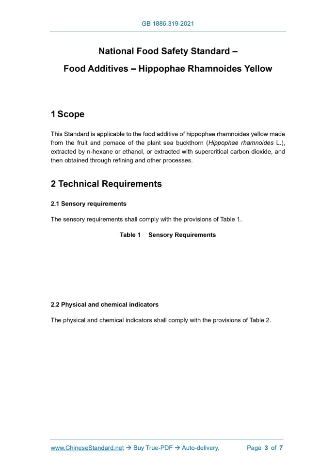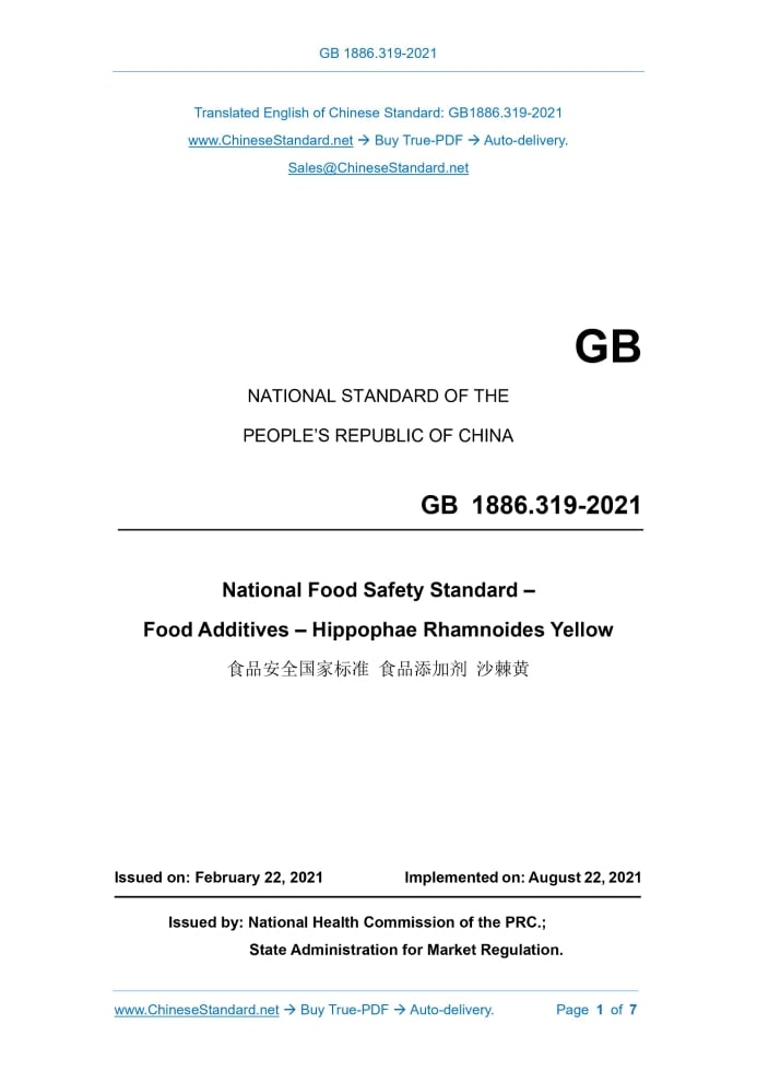 GB 1886.319-2021: National food safety standard - Food additives - Hippophae rhamnoides yellow Delivery: 9 seconds. True-PDF full-copy in English & invoice will be downloaded + auto-delivered via email. See step-by-step procedure Status: Valid
