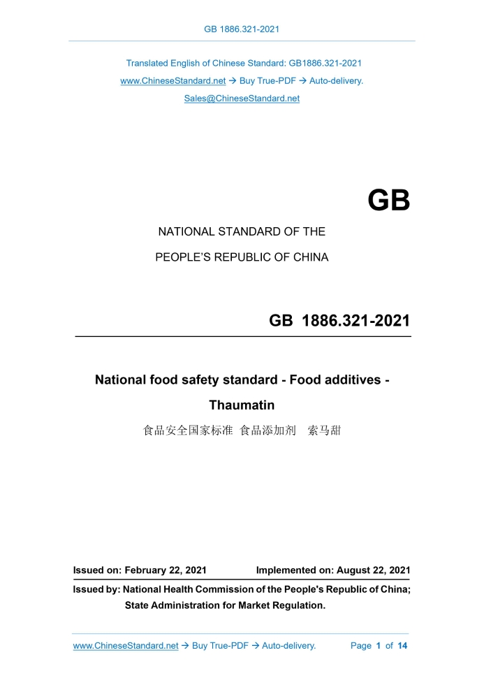 GB 1886.321-2021: National food safety standard - Food additives - Thaumatin Delivery: 9 seconds. True-PDF full-copy in English & invoice will be downloaded + auto-delivered via email. See step-by-step procedure Status: Valid