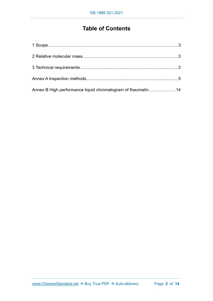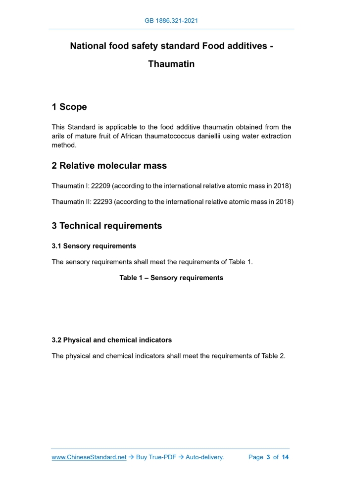 Similar standardsGB 1886.321-2021: National food safety standard - Food additives - Thaumatin---This is an excerpt. Full copy of true-PDF in English version (including equations, symbols, images, flow-chart, tables, and figures etc.), auto-downloaded/delivered in 9 seconds, can be purchased online: https://www.ChineseStandard.net/PDF.aspx/GB1886.321-2021GB NATIONAL STANDARD OF THE PEOPLE’S REPUBLIC OF CHINA National food safety standard - Food additives - Thaumatin ISSUED ON: FEBRUARY 22, 2021 IMPLEMENTED ON: AUGUST 22, 2021 Issued by: National Health Commission of the People's Republic of China; State Administration for Market Regulation. Table of Contents1 Scope ... 3 2 Relative molecular mass ... 3 3 Technical requirements ... 3 Annex A Inspection methods ... 5 Annex B High performance liquid chromatogram of thaumatin ... 14 National food safety standard Food additives - Thaumatin1 ScopeThis Standard is applicable to the food additive thaumatin obtained from the arils of mature fruit of African thaumatococcus daniellii using water extraction method.2 Relative molecular massThaumatin I: 22209 (according to the international relative atomic mass in 2018) Thaumatin II: 22293 (according to the international relative atomic mass in 2018)3 Technical requirements3.1 Sensory requirements The sensory requirements shall meet the requirements of Table 1. Table 1 – Sensory requirements 3.2 Physical and chemical indicators The physical and chemical indicators shall meet the requirements of Table 2.Annex AInspection methods A.1 General When other requirements are not specified, the reagents and water used in this Standard refer to analytically-pure reagents and grade 3 water specified in GB/T 6682. All standard solutions used in the test, standard solutions for impurity determination, preparations and products are prepared in accordance with the provisions of GB/T 601, GB/T 602, and GB/T 603 when other requirements are not indicated. The solution used in the test refers to an aqueous solution when it is not specified which solvent is used to prepare it. A.2 Identification test A.2.1 Solubility identification It is easily soluble in water but insoluble in acetone. A.2.2 Ninhydrin test In 5mL of 0.1% sample solution, add 1mL of freshly prepared ninhydrin solution (200mg of ninhydrin is dissolved in water, and the volume is set to 100mL). Blue shall appear. A.2.3 Liquid chromatography test On the liquid chromatogram of content determination, the retention time of the main peak of the specimen solution and the main peak of the reference solution shall be consistent. A.3 Determination of content (on a dry basis) A.3.1 Principle of determination Thaumatin is a protein compound. It has a characteristic absorption peak of ultraviolet absorption spectrum at 279nm. The specimen is dissolved by water. Use liquid chromatography to separate. Use UV detector to test. Use external standard method to quantify. A.3.2 Reagents and materials A.3.2.1 Water: Grade 1 water. A.3.2.2 Ammonium acetate. Under reference chromatographic conditions, respectively inject a series of standard solutions and specimen solutions to determine. According to the external standard method, use a series of standard solutions as a calibration table. Refer to Annex B for the reference retention time and chromatogram of each component. A.3.6 Result calculation The mass fraction w1 of thaumatin content is calculated according to formula (A.1). Where, c - The concentration of thaumatin in the test solution, in micrograms per milliliter (μg/mL); V - The volume of specimen solution, in milliliters (mL); m - The specimen mass, in milliliters (mL); 1000 - The conversion factor; f - The dilution times. The test results are based on the arithmetic mean of the parallel determination results. The absolute difference between the two independent determination results obtained under repeatability conditions is not more than 5% of the arithmetic mean. A.4 Determination of specific absorption rate A.4.1 Principle of determination Perform spectrophotometric detection at the maximum wavelength (typical wavelength is 279nm). A.4.2 Reagents and materials A.4.2.1 Hydrochloric acid. A.4.2.2 Water (equivalent to grade two water in GB/T 6682). A.4.3 Instruments and equipment A.4.3.1 Dual-beam UV/Visible spectrophotometry. C - 0.05% thaumatin absorption rate; 20 - Dilution multiple of thaumatin specimen solution; 100 - The conversion factor; W - The moisture content of thaumatin (%); WCF - The weight correction factor; WT - The mass of the thaumatin specimen actually used, in grams (g); 0.5 - The mass of the theoretically used thaumatin specimen, in grams (g). The test results are based on the arithmetic mean of the parallel determination results. The absolute difference between two independent determination results obtained under repeatability conditions is not more than 0.2% of the arithmetic mean. A.5 Determination of absorbance A.5.1 Reagents and materials A.5.1.1 Hydrochloric acid. A.5.1.2 Water (equivalent to grade two water in GB/T 6682). A.5.2 Instruments and equipment A.5.2.1 Dual beam UV/Visible spectrophotometer. A.5.2.2 Quartz cuvette with a light path of 10mm. A.5.2.3 50mL volumetric flask. A.5.2.4 Analytical balance: Resolution is 0.1 mg. A.5.2.5 Pasteur pipette. A.5.2.6 pH meter. A.5.3 Analysis steps A.5.3.1 Preparation of specimen solution Accurately weight about 0.5g of specimen in a 50mL volumetric flask. Use the right amount of pH2.5 blank solution to dissolve. Set volume to 50mL. A.5.3.2 Determination A.6.2.3 75mm×10mm disposable test tube. A.6.2.4 Vortex mixer. A.6.2.5 Electric heating constant temperature water bath. A.6.2.6 1mL adjustable pipette. A.6.2.7 Analytical balance: Resolution is 0.1mg. A.6.2.8 Pasteur pipette. A.6.2.9 pH meter. A.6.3 Analysis steps A.6.3.1 Preparation of specimen solution Accurately weigh about 0.2g of specimen in a 100mL volumetric flask. Use the right amount of pH2.5 blank solution to dissolve. Set volume to 