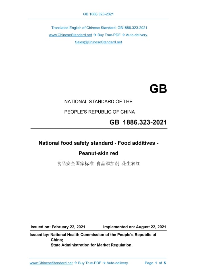 GB 1886.323-2021: National food safety standard - Food additives - Peanut-skin red Delivery: 9 seconds. True-PDF full-copy in English & invoice will be downloaded + auto-delivered via email. See step-by-step procedure Status: Valid