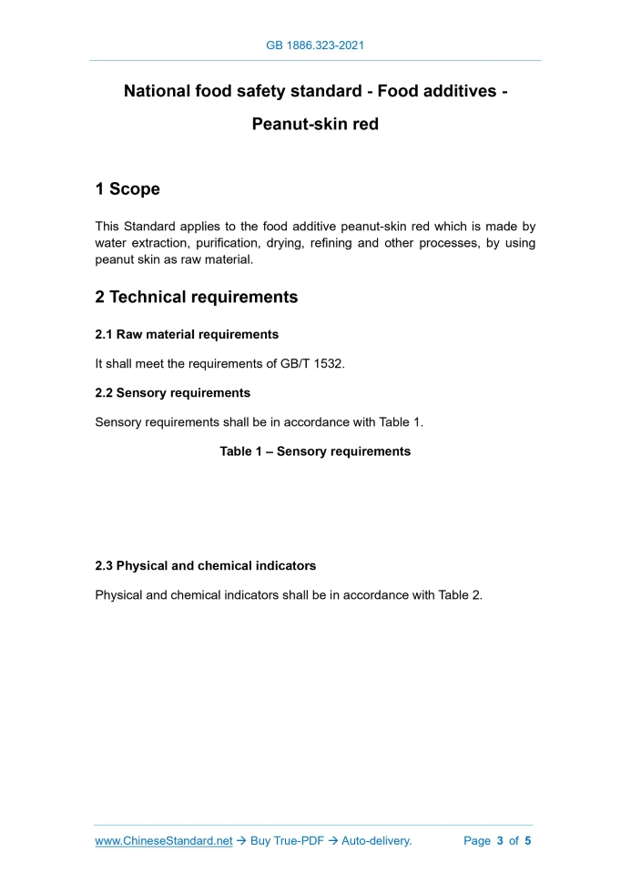 Similar standardsGB 1886.323-2021: National food safety standard - Food additives - Peanut-skin red---This is an excerpt. Full copy of true-PDF in English version (including equations, symbols, images, flow-chart, tables, and figures etc.), auto-downloaded/delivered in 9 seconds, can be purchased online: https://www.ChineseStandard.net/PDF.aspx/GB1886.323-2021GB NATIONAL STANDARD OF THE PEOPLE’S REPUBLIC OF CHINA National food safety standard - Food additives - Peanut-skin red ISSUED ON: FEBRUARY 22, 2021 IMPLEMENTED ON: AUGUST 22, 2021 Issued by: National Health Commission of the People's Republic of China; State Administration for Market Regulation. Table of Contents1 Scope ... 3 2 Technical requirements ... 3 Appendix A Inspection method ... 4 National food safety standard - Food additives - Peanut-skin red1 ScopeThis Standard applies to the food additive peanut-skin red which is made by water extraction, purification, drying, refining and other processes, by using peanut skin as raw material.2 Technical requirements2.1 Raw material requirements It shall meet the requirements of GB/T 1532. 2.2 Sensory requirements Sensory requirements shall be in accordance with Table 1. Table 1 – Sensory requirements 2.3 Physical and chemical indicators Physical and chemical indicators shall be in accordance with Table 2. ......Source: Above contents are excerpted from the full-copy PDF -- translated/reviewed by: www.ChineseStandard.net / Wayne Zheng et al. Tips & Frequently Asked Questions:Question 1: How long will the true-PDF of English version of GB 1886.323-2021 be delivered?Answer: The full copy PDF of English version of GB 1886.323-2021 can be downloaded in 9 seconds, and it will also be emailed to you in 9 seconds (double mechanisms to ensure the delivery reliably), with PDF-invoice.Question 2: Can I share the purchased PDF of GB 1886.323-2021_English with my colleagues?Answer: Yes. The purchased PDF of GB 1886.323-2021_English will be deemed to be sold to your employer/organization who actually paid for it, including your colleagues and your employer's intranet.Question 3: Does the price include tax/VAT?Answer: Yes. Our tax invoice, downloaded/delivered in 9 seconds, includes all tax/VAT and complies with 100+ countries' tax regulations (tax exempted in 100+ countries) -- See Avoidance of Double Taxation Agreements (DTAs): List of DTAs signed between Singapore and 100+ countriesQuestion 4: Do you accept my currency other than USD?Answer: Yes. www.ChineseStandard.us -- GB 1886.323-2021 -- Click this link and select your country/currency to pay, the exact amount in your currency will be printed on the invoice. Full PDF will also be downloaded/emailed in 9 seconds.How to buy and download a true PDF of English version of GB 1886.323-2021?A step-by-step guide to download PDF of GB 1886.323-2021_EnglishStep 1: Visit website https://www.ChineseStandard.net (Pay in USD), or https://www.ChineseStandard.us (Pay in any currencies such as Euro, KRW, JPY, AUD).Step 2: Search keyword "GB 1886.323-2021". Step 3: Click "Add to Cart". If multiple PDFs are required, repeat steps 2 and 3 to add up to 12 PDFs to cart. Step 4: Select payment option (Via payment agents Stripe or PayPal). Step 5: Customize Tax Invoice -- Fill up your email etc. Step 6: Click "Checkout". Step 7: Make payment by credit card, PayPal, Google Pay etc. After the payment is completed and in 9 seconds, you will receive 2 emails attached with the purchased PDFs and PDF-invoice, respectively. Step 8: Optional -- Go to download PDF. Step 9: Optional -- Click Open/Download PDF to download PDFs and invoice. See screenshots for above steps: Steps 1~3 Steps 4~6 Step 7 Step 8 Step 9 |
