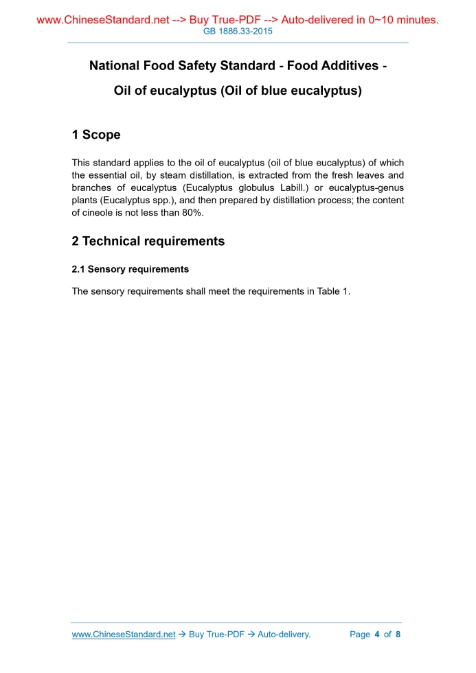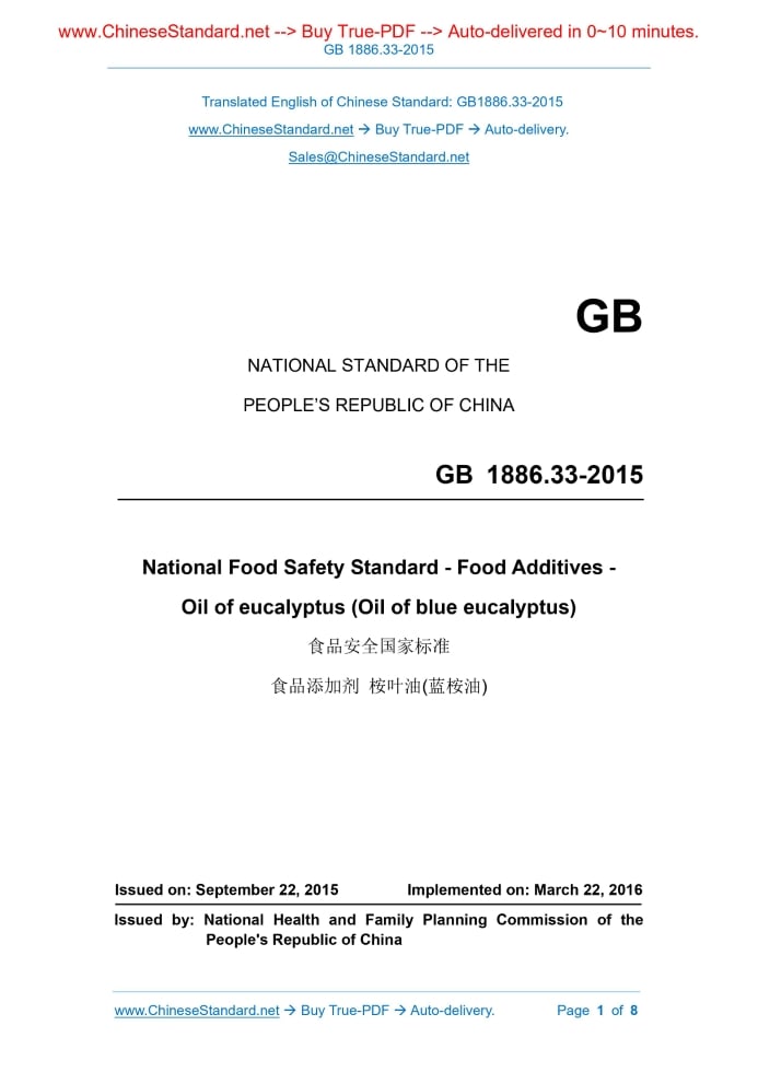 GB 1886.33-2015: National Food Safety Standard -- Food Additives -- Oil of eucalyptus Delivery: 9 seconds. True-PDF full-copy in English & invoice will be downloaded + auto-delivered via email. See step-by-step procedure Status: Valid