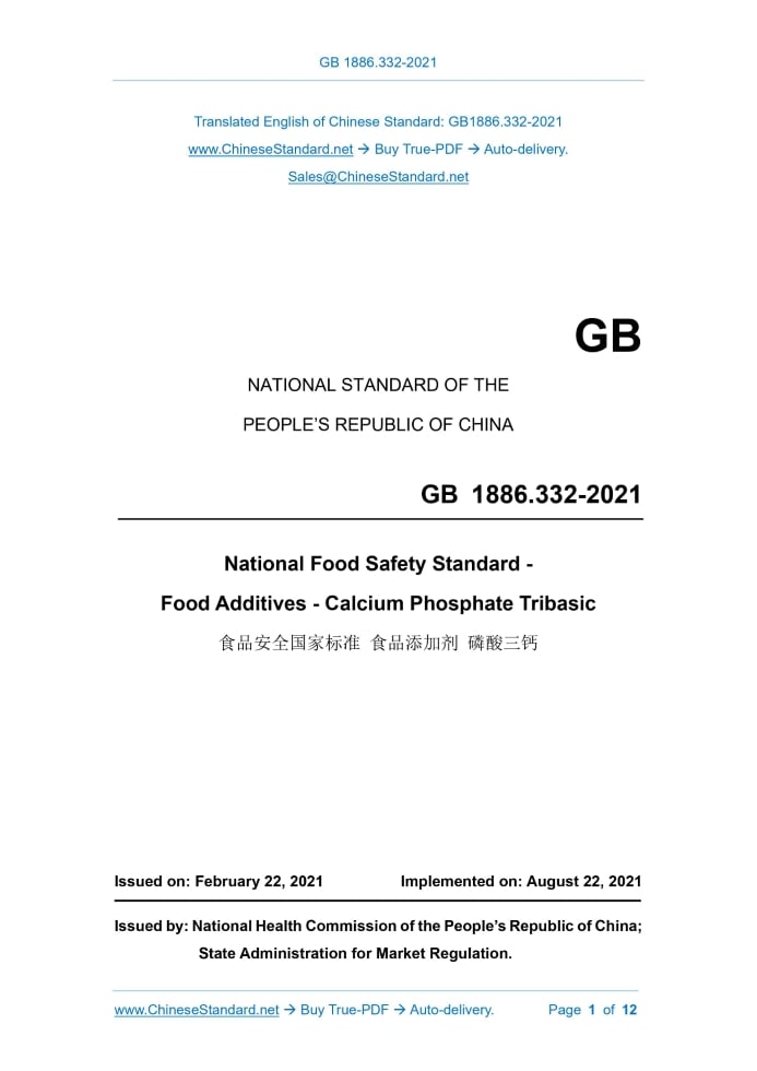 GB 1886.332-2021: National food safety standard - Food additives - Calcium phosphate tribasic Delivery: 9 seconds. True-PDF full-copy in English & invoice will be downloaded + auto-delivered via email. See step-by-step procedure Status: Valid
