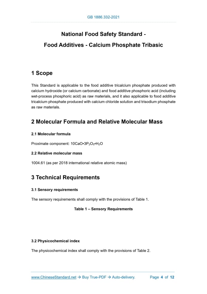 Similar standardsGB 1886.332-2021: National food safety standard - Food additives - Calcium phosphate tribasic---This is an excerpt. Full copy of true-PDF in English version (including equations, symbols, images, flow-chart, tables, and figures etc.), auto-downloaded/delivered in 9 seconds, can be purchased online: https://www.ChineseStandard.net/PDF.aspx/GB1886.332-2021GB NATIONAL STANDARD OF THE PEOPLE’S REPUBLIC OF CHINA National Food Safety Standard - Food Additives - Calcium Phosphate Tribasic ISSUED ON: FEBRUARY 22, 2021 IMPLEMENTED ON: AUGUST 22, 2021 Issued by: National Health Commission of the People’s Republic of China; State Administration for Market Regulation. Table of ContentsForeword ... 3 1 Scope ... 4 2 Molecular Formula and Relative Molecular Mass ... 4 3 Technical Requirements ... 4 Appendix A Inspection Methods ... 6 National Food Safety Standard - Food Additives - Calcium Phosphate Tribasic1 ScopeThis Standard is applicable to the food additive tricalcium phosphate produced with calcium hydroxide (or calcium carbonate) and food additive phosphoric acid (including wet-process phosphoric acid) as raw materials, and it also applicable to food additive tricalcium phosphate produced with calcium chloride solution and trisodium phosphate as raw materials.2 Molecular Formula and Relative Molecular Mass2.1 Molecular formula Proximate component: 10CaO•3P2O5•H2O 2.2 Relative molecular mass 1004.61 (as per 2018 international relative atomic mass)3 Technical Requirements3.1 Sensory requirements The sensory requirements shall comply with the provisions of Table 1. Table 1 – Sensory Requirements 3.2 Physicochemical index The physicochemical index shall comply with the provisions of Table 2.Appendix AInspection Methods Caution: Some reagents used in this test method are toxic or corrosive, so please be careful when operating! If necessary, perform it in a fume hood. If it splashes on the skin, it shall be rinsed with water immediately, and the severe cases shall be treated immediately. A.1 General provisions If no other requirements are specified, all the reagents and water used in this Standard refer to the analytical reagents and Class-III water specified in GB/T 6682. If no other requirements are specified, all the standard solution used in the test, standard solution for determining the impurity, preparation and product shall be prepared according to the provisions of GB/T 601, GB/T 602, GB/T 603.The solution used in the test refers to the aqueous solution when the solvent is not specified. A.2 Identification test A.2.1 Reagents and materials A.2.1.1 Nitric acid solution: 1+1. A.2.1.2 Hydrochloric acid solution: 1+3. A.2.1.3 Ammonia solution: 1+1. A.2.1.4 Ammonium oxalate solution: 35g/L. A.2.1.5 Ammonium molybdate solution: 60g/L, take 6g of ammonium molybdate [(NH4)6MO7O24·4H2O] and dissolve it in 50mL water; slowly add 50mL nitric acid solution while stirring; and store in a brown reagent bottle. A.2.2 Identification method A.2.2.1 Identification of calcium ions Weigh about 0.1g of specimen; add 5mL of hydrochloric acid solution, 5mL of water; heat to 40°C ~ 50°C. Add 1mL of ammonia solution while stirring; add 5mL of ammonium oxalate solution; and a white precipitate is produced. A.2.2.2 Identification of phosphate radical Weigh about 0.1g of specimen; add nitric acid solution dropwise to dissolve the specimen; then take 1mL of excessive nitric acid solution; heat to 40°C ~ 50°C; add solution shall be 12.3~12.5. Continue to titrate with ethylenediaminetetraacetic acid disodium salt (EDTA) standard titration solution until the solution appears clear blue and keep it unchanged for 60s. At the same time, a blank test is performed. Except for the blank test without adding the specimen, the other operations and the types and amounts of the added reagents (except the standard titration solution) are the same as the determination test. A.3.1.5 Calculation of results The mass fraction w1 of the trisodium phosphate (by Ca) shall be calculated as per Formula (A.1). Where: V1 – volume of ethylenediaminetetraacetic acid disodium salt (EDTA) standard titration solution consumed for titrating the specimen solution, in mL; V0 – volume of ethylenediaminetetraacetic acid disodium salt (EDTA) standard titration solution consumed for the blank test, in mL; 1000 – conversion factor; c1 – concentration of ethylenediaminetetraacetic acid disodium salt (EDTA) standard titration solution, in mol/L; M1 – molar mass of the calcium (Ca), in g/mol [M1 =40.078]; m1 – mass of the specimen, in g. The test results are based on the arithmetic mean of the parallel determination results. The absolute difference between two independent determination results obtained under repeatability conditions is no more than 0.2%. A.3.2 Zinc sulfate back titration method (Method-II) A.3.2.1 Method summary In the specimen solution, add excessive ethylenediaminetetraacetic acid disodium salt (EDTA) standard titration solution; complex with calcium ions; and use the KB mixture as an indicator to titrate the excessive ethylenediaminetetraacetic acid disodium salt (EDTA) standard titration solution by zinc sulfate standard titration solution. A.3.2.2 Reagents and materials Take about 0.5g of the specimen, accurate to 0.0002g; place it in a 100mL beaker; moisten it with a small amount of water; and add 5mL of hydrochloric acid solution to dissolve the sample completely. Transfer all to a 250mL volumetric flask; dilute to the mark with water; and shake well. If necessary, dry filter, discard the first 20mL of filtrate. Pipette 25.00mL of the above specimen solution; place it in a 500mL conical flask; then use another pipette to transfer 25.00mL of ethylenediaminetetraacetic acid disodium salt (EDTA) standard titration solution; add 50mL of water, 10mL of ammonia- ammonium chloride buffer solution (A); shake well and stand for 5min. Add 2~3 drops of KB indicator solution; titrate with zinc sulfate stand
