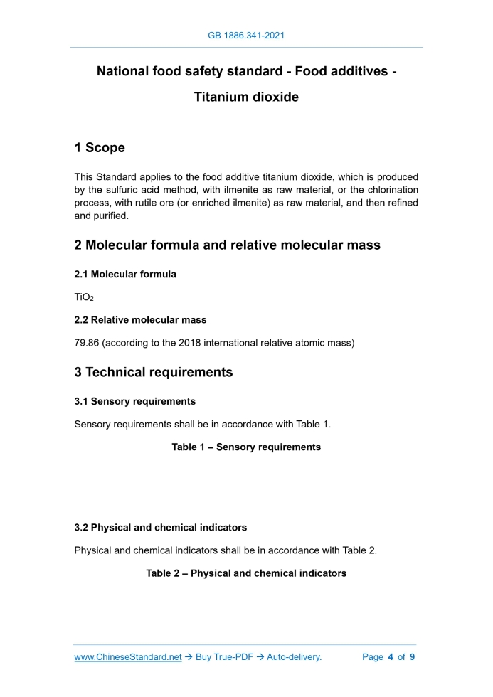 Foreword ... 3 1 Scope ... 4 2 Molecular formula and relative molecular mass ... 4 3 Technical requirements ... 4 Appendix A Inspection method ... 6 National food safety standard - Food additives - Titanium dioxide