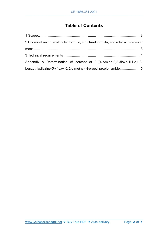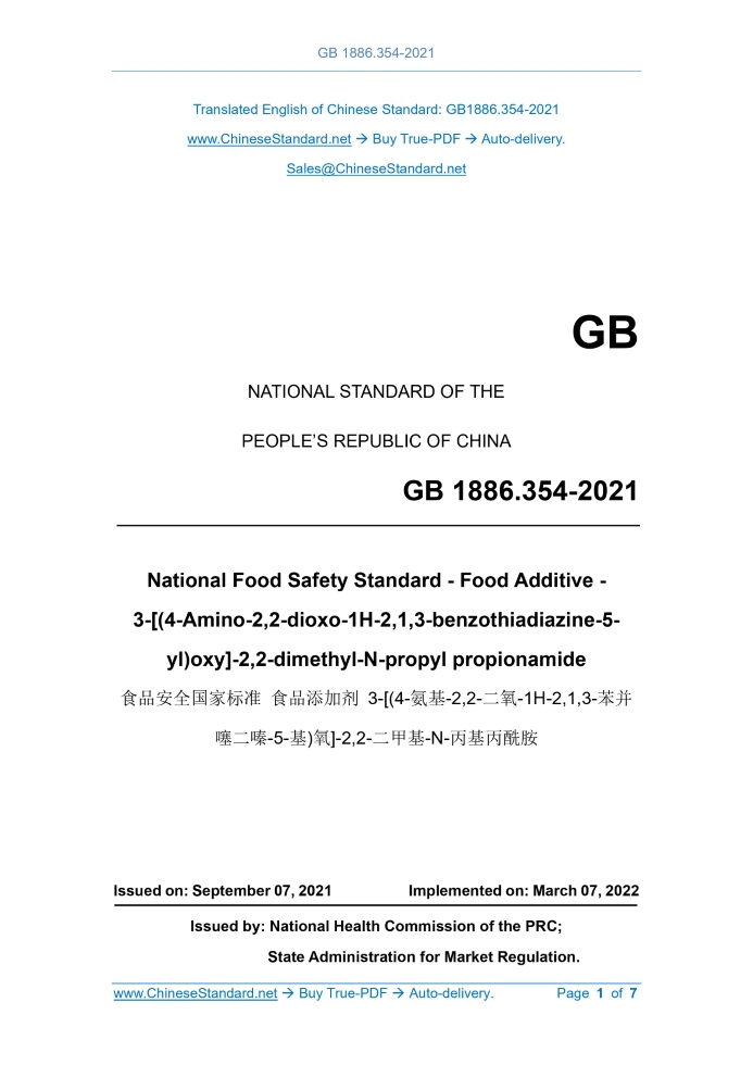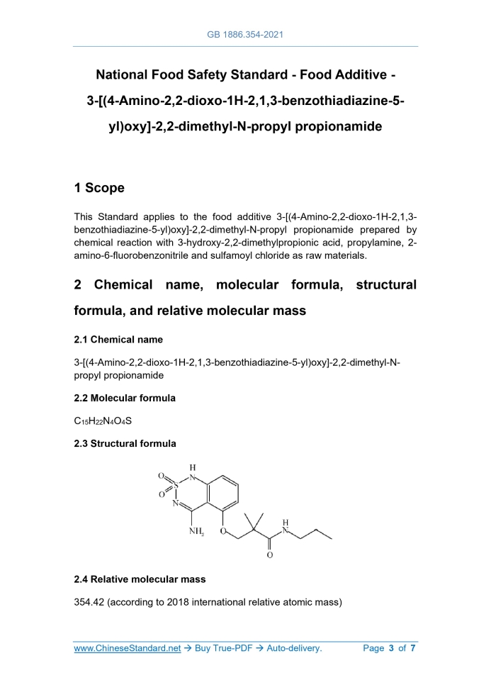 GB 1886.354-2021: National Food Safety Standard - Food Additive - 3-[(4-Amino-2,2-dioxo-1H-2,1,3-benzothiadiazine-5-yl)oxy]-2,2-dimethyl-N-propyl propionamide Delivery: 9 seconds. True-PDF full-copy in English & invoice will be downloaded + auto-delivered via email. See step-by-step procedure Status: Valid