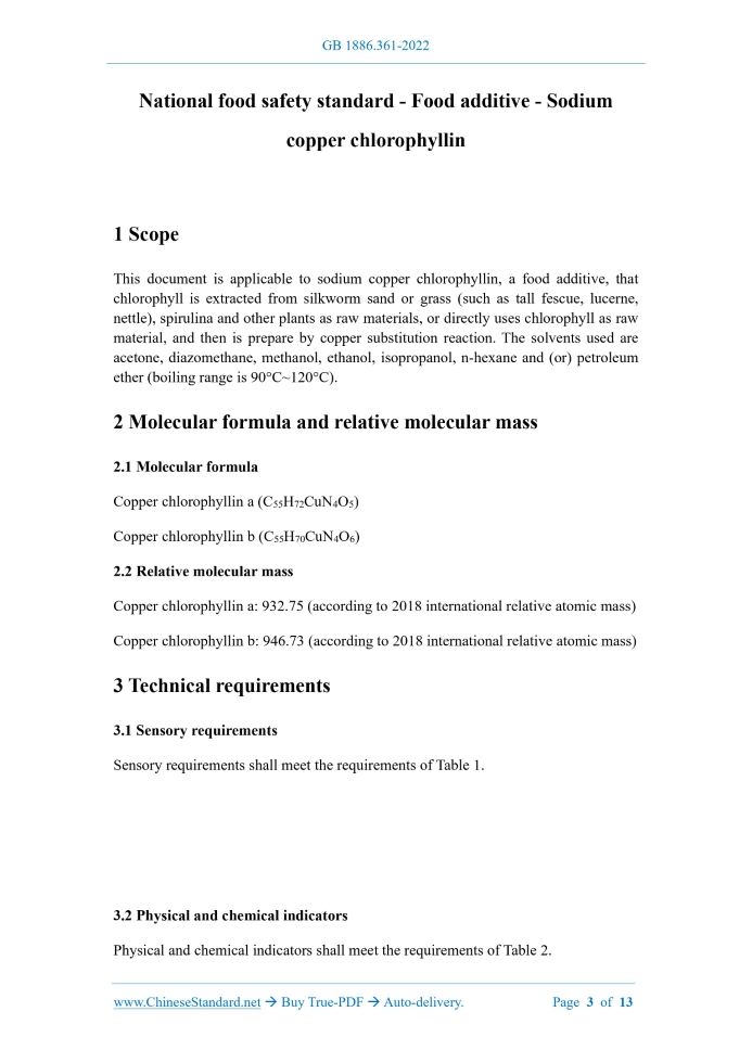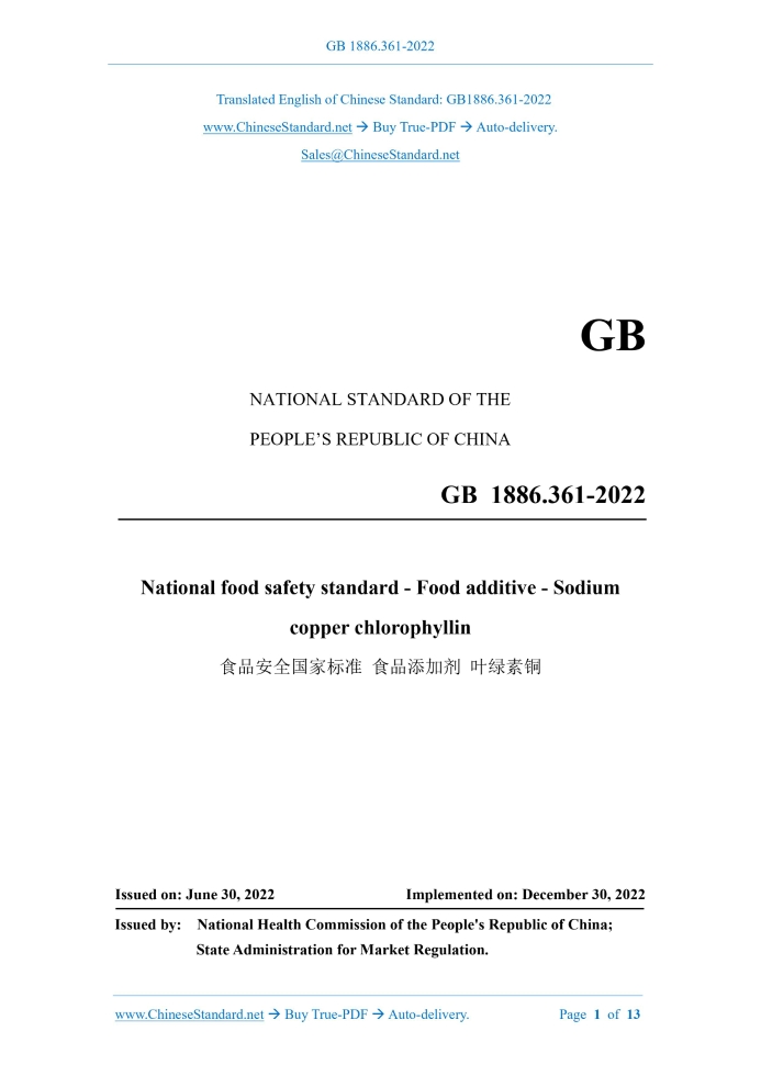 GB 1886.361-2022: National food safety standard - Food additives - Sodium copper chlorophyllin Delivery: 9 seconds. True-PDF full-copy in English & invoice will be downloaded + auto-delivered via email. See step-by-step procedure Status: Valid