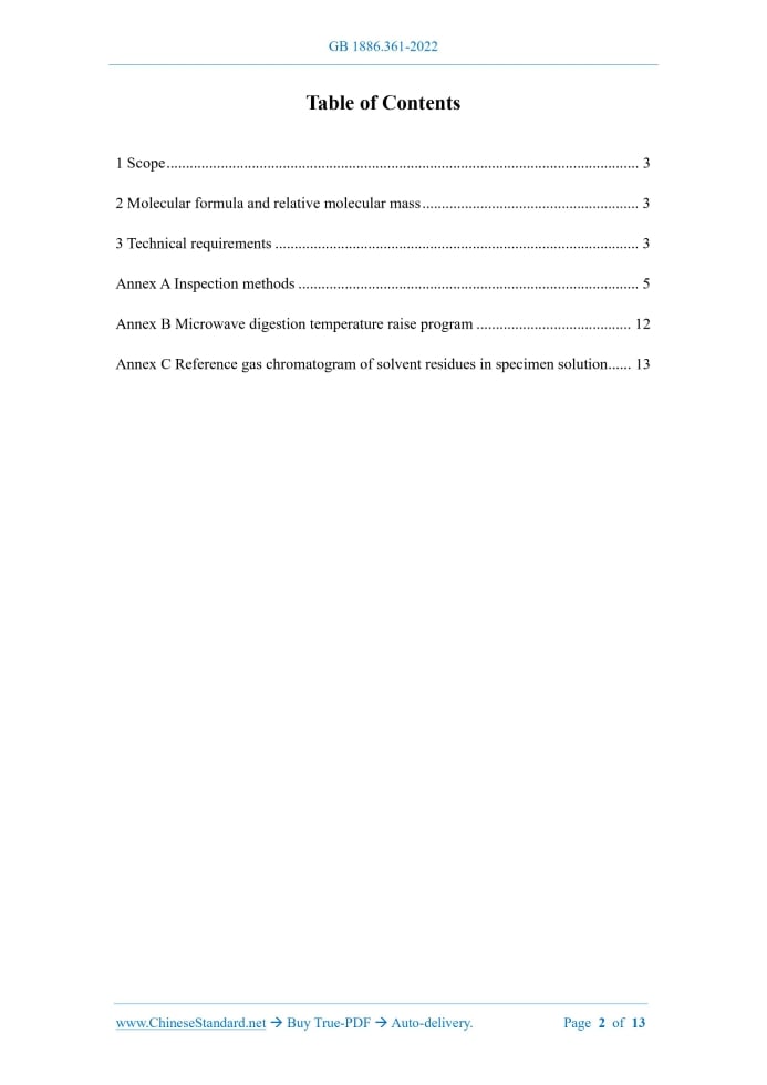 Similar standardsGB 1886.361-2022: National food safety standard - Food additives - Sodium copper chlorophyllin---This is an excerpt. Full copy of true-PDF in English version (including equations, symbols, images, flow-chart, tables, and figures etc.), auto-downloaded/delivered in 9 seconds, can be purchased online: https://www.ChineseStandard.net/PDF.aspx/GB1886.361-2022NATIONAL STANDARD OF THE PEOPLE’S REPUBLIC OF CHINA National food safety standard - Food additive - Sodium copper chlorophyllin Issued on: JUNE 30, 2022 Implemented on: DECEMBER 30, 2022 Issued by. National Health Commission of the People's Republic of China; State Administration for Market Regulation. Table of Contents1 Scope... 3 2 Molecular formula and relative molecular mass... 3 3 Technical requirements... 3 Annex A Inspection methods... 5 Annex B Microwave digestion temperature raise program... 12 Annex C Reference gas chromatogram of solvent residues in specimen solution... 13 National food safety standard - Food additive - Sodium copper chlorophyllin1 ScopeThis document is applicable to sodium copper chlorophyllin, a food additive, that chlorophyll is extracted from silkworm sand or grass (such as tall fescue, lucerne, nettle), spirulina and other plants as raw materials, or directly uses chlorophyll as raw material, and then is prepare by copper substitution reaction. The solvents used are acetone, diazomethane, methanol, ethanol, isopropanol, n-hexane and (or) petroleum ether (boiling range is 90°C~120°C).2 Molecular formula and relative molecular mass2.1 Molecular formula Copper chlorophyllin a (C55H72CuN4O5) Copper chlorophyllin b (C55H70CuN4O6) 2.2 Relative molecular mass Copper chlorophyllin a. 932.75 (according to 2018 international relative atomic mass) Copper chlorophyllin b. 946.73 (according to 2018 international relative atomic mass)3 Technical requirements3.1 Sensory requirements Sensory requirements shall meet the requirements of Table 1. 3.2 Physical and chemical indicators Physical and chemical indicators shall meet the requirements of Table 2.Annex AInspection methods A.1 General Unless otherwise specified, the reagents and water used in this Standard refer to analytically pure reagents and grade three water specified in GB/T 6682.The standard solutions, standard solutions used for determination of impurities, preparations and products shall be prepared in accordance with the provisions of GB/T 601, GB/T 602 and GB/T 603, unless other requirements are specified. The solution used in the test refers to the aqueous solution when the solvent is not specified. A.2 Identification test A.2.1 Maximum absorption peak and absorbance ratio range Take the specimen solution in A.3.3.1 Determination of chlorophyll content. There are maximum absorption peaks in the two wavelength ranges of 405nm ± 3nm and 635nm ± 5nm. The absorbance ratio of the two measurements is between 3.2~4.0. A.2.2 Copper ion test A.2.2.1 Reagents and materials A.2.2.1.1 Sulfuric acid. A.2.2.1.2 Hydrochloric acid solution. 1+3. A.2.2.1.3 Sodium diethyldithiocarbamate solution. 1g/L. A.2.2.2 Analysis steps Take 1g of specimen. Place in a crucible that has been burnt to constant weight at 800°C ± 25°C. Slowly heat until the specimen is completely carbonized. Cool the carbonized specimen. Use 0.5mL~1mL of sulfuric acid to wet the residue. Continue to heat until the sulfuric acid vapor escapes. Burn the residue to a heavy weight in a high temperature furnace at 800°C ± 25°C. Add 10mL of hydrochloric acid solution to the residue. Heat on the water bath to dissolve. After filtration, add water to 10mL. Take 5mL of the above solution. Add 0.5mL of sodium diethyldithiocarbamate solution. Produce a reddish-brown precipitate. A.3 Determination of chlorophyll content A.3.1 Reagents and materials A.3.1.1 Anhydrous ether. A.3.1.2 Disodium hydrogen phosphate solution (0.15mol/L). Weigh 53.7g of disodium hydrogen phosphate (Na2HPO4 • 12H2O). Add water to dissolve. Dilute and set volume to 1000mL. A.3.1.3 Potassium dihydrogen phosphate solution (0.15mol/L). Weigh 20.4g of potassium dihydrogen phosphate (KH2PO4). Add water to dissolve. Dilute and set volume to 1000mL. A.3.1.4 Phosphate buffer (pH 7.5). Measure disodium hydrogen phosphate solution (0.15mol/L) and potassium dihydrogen phosphate solution (0.15mol/L) respectively. Mix by volume ratio of 21.4. A.3.1.5 Solution A. copper chloride-methanol solution (5%). A.3.1.6 Solution B. sodium hydroxide-methanol solution (10%). A.3.2 Instruments and equipment A.3.2.1 Spectrophotometer. A.3.2.2 Constant temperature water bath. A.3.2.3 Separatory funnel (250mL). A.3.3 Analysis steps A.3.3.1 Preparation of specimen solution Weigh 1g of specimen, to the nearest of 0.0002g. Place in an Erlenmeyer flask. Add 50mL~60mL of anhydrous ether to dissolve. Add 1mL of solution A. Heat to reflux for 15min in a constant temperature water bath at 50°C ± 2°C. Remove. Add 2mL of solution B. Shake well. Continue to heat to reflux for 20min in a constant temperature water bath at 50°C ± 2°C. Shake intermittently throughout the process. Make sure the reaction is complete. After reaction, remove the Erlenmeyer flask. Cool. Add a little water. Shake well. Transfer to a separatory funnel. Then use an appropriate amount of water to wash the Erlenmeyer flask in several times. The washing liquid is transferred to the separatory funnel. Shake well and let stand for at least 1h. After the liquid in the separatory funnel is separated, filter the bottom liquid. Note that the interfacial layer remains in the separatory funnel. Do not filter down to avoid clogging filter paper. After filtration, rinse the upper acetyl layer and interface with water until the washed water layer is colorless. The washing liquid is merged into the lower filtrate. Discard the upper ether layer and interface. Use water to wash the filter paper several times until almost it is almost colorless. The washing liquid is combined into the lower fil