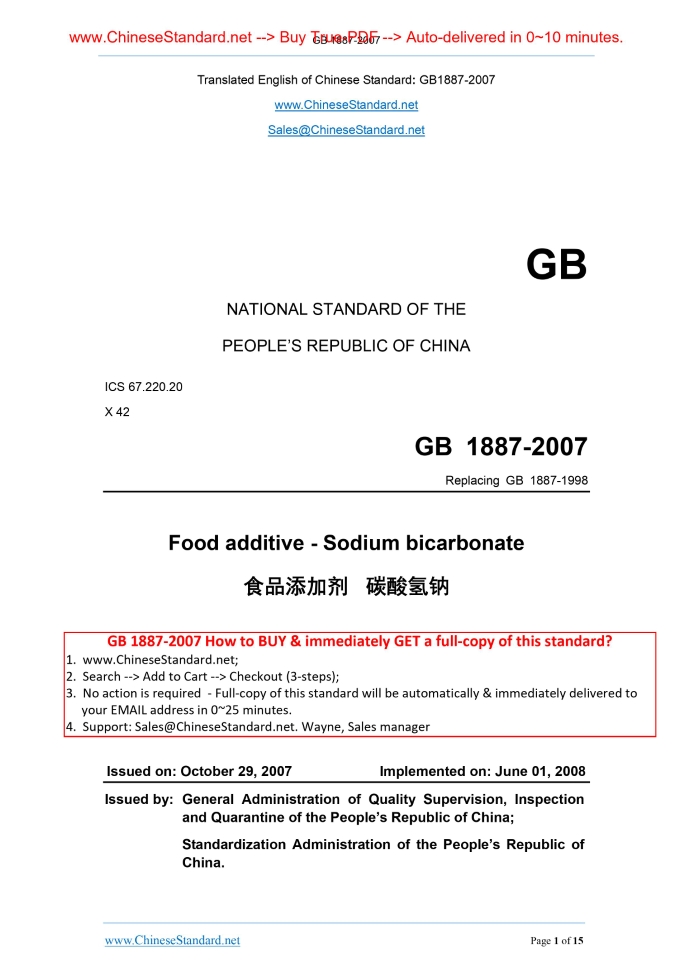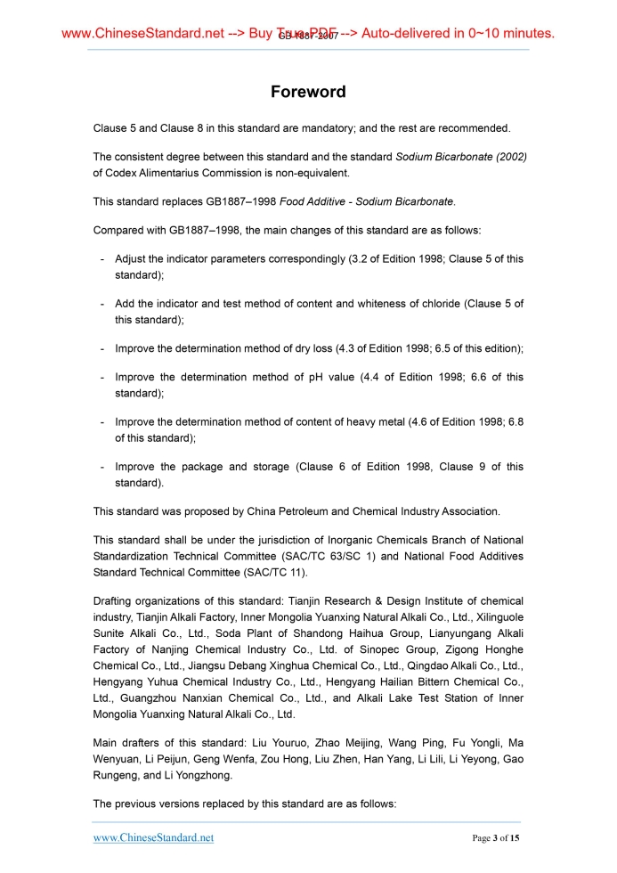 Similar standardsGB 1887-2007: Food additive -- Sodium bicarbonate---This is an excerpt. Full copy of true-PDF in English version (including equations, symbols, images, flow-chart, tables, and figures etc.), auto-downloaded/delivered in 9 seconds, can be purchased online: https://www.ChineseStandard.net/PDF.aspx/GB1887-2007GB NATIONAL STANDARD OF THE PEOPLE’S REPUBLIC OF CHINA ICS 67.220.20 X 42 Replacing GB 1887-1998 Food additive - Sodium bicarbonate Issued on: OCTOBER 29, 2007 Implemented on: JUNE 01, 2008 Issued by. General Administration of Quality Supervision, Inspection and Quarantine of the People’s Republic of China; Standardization Administration of the People’s Republic of China. Table of ContentsForeword ... 3 1 Scope ... 5 2 Normative references ... 5 3 Symbol ... 6 4 Property ... 6 5 Requirements ... 6 6 Test methods ... 6 7 Inspection rules ... 14 8 Mark and label ... 14 9 Package, transportation, and storage ... 15ForewordClause 5 and Clause 8 in this standard are mandatory; and the rest are recommended. The consistent degree between this standard and the standard Sodium Bicarbonate (2002) of Codex Alimentarius Commission is non-equivalent. This standard replaces GB1887–1998 Food Additive - Sodium Bicarbonate. Compared with GB1887–1998, the main changes of this standard are as follows. - Adjust the indicator parameters correspondingly (3.2 of Edition 1998; Clause 5 of this standard); - Add the indicator and test method of content and whiteness of chloride (Clause 5 of this standard); - Improve the determination method of dry loss (4.3 of Edition 1998; 6.5 of this edition); - Improve the determination method of pH value (4.4 of Edition 1998; 6.6 of this standard); - Improve the determination method of content of heavy metal (4.6 of Edition 1998; 6.8 of this standard); - Improve the package and storage (Clause 6 of Edition 1998, Clause 9 of this standard). This standard was proposed by China Petroleum and Chemical Industry Association. This standard shall be under the jurisdiction of Inorganic Chemicals Branch of National Standardization Technical Committee (SAC/TC 63/SC 1) and National Food Additives Standard Technical Committee (SAC/TC 11). Drafting organizations of this standard. Tianjin Research & Design Institute of chemical industry, Tianjin Alkali Factory, Inner Mongolia Yuanxing Natural Alkali Co., Ltd., Xilinguole Sunite Alkali Co., Ltd., Soda Plant of Shandong Haihua Group, Lianyungang Alkali Factory of Nanjing Chemical Industry Co., Ltd. of Sinopec Group, Zigong Honghe Chemical Co., Ltd., Jiangsu Debang Xinghua Chemical Co., Ltd., Qingdao Alkali Co., Ltd., Hengyang Yuhua Chemical Industry Co., Ltd., Hengyang Hailian Bittern Chemical Co., Ltd., Guangzhou Nanxian Chemical Co., Ltd., and Alkali Lake Test Station of Inner Mongolia Yuanxing Natural Alkali Co., Ltd. Main drafters of this standard. Liu Youruo, Zhao Meijing, Wang Ping, Fu Yongli, Ma Wenyuan, Li Peijun, Geng Wenfa, Zou Hong, Liu Zhen, Han Yang, Li Lili, Li Yeyong, Gao Rungeng, and Li Yongzhong. The previous versions replaced by this standard are as follows. Food Additive Sodium – Bicarbonate1 ScopeThis standard specifies the requirements, test method, inspection rules, sign, label, package, transportation and storage of food additive sodium bicarbonate. This standard is applicable to the food additive sodium bicarbonate. This product can be used as the leavening agent or processing aids for food industry.2 Normative referencesThe articles contained in the following documents have become part of this standard when they are quoted herein. For the dated documents so quoted, all the modifications (excluding corrections) or revisions made thereafter shall not be applicable to this standard. For the undated documents so quoted, the latest editions shall be applicable to this standard. GB/T 191-2000 Packaging - Pictorial marking for handling of goods (eqv ISO 780. 1997) GB/T 3051-2000 Inorganic chemical products for industrial use - General method for determination of chloride content - Mercurimetric method GB/T 5009.74-2003 Method for limit test of heavy metals in food additives GB/T 5009.76-2003 Determination of arsenic in food additives GB/T 6678 General principles for sampling chemical products GB/T 6682-1992 Water for laboratory use - Specifications GB/T 9724 Chemical reagent - General rule for the determination of pH HG/T 3696.1 Inorganic chemical products - Preparations of standard volumetric solutions for chemical analysis HG/T 3696.2 Inorganic chemical products - Preparations of standard solutions for chemical analysis HG/T 3696.3 Inorganic chemical products - Preparations of reagent solutions for chemical analysis m1 - Value of mass of weighing bottle and specimen before drying, and the unit is g; m2 - Value of mass of weighing bottle and specimen after drying, and the unit is g; m - Value of mass of specimen, and the unit is g. Take the arithmetic mean value of parallel determination results as the determination result. The absolute difference of two parallel determination results shall not be more than 0.02%. 6.6 Determination of pH value 6.6.1 Instrument PH meter. the accuracy is 0.02 pH unit. 6.6.2 Analysis steps Weight 1.00 g ± 0.01 g of specimen; put it in a 250 mL beaker. Add about 100 mL of water without carbon dioxide to dissolve the specimen. Determine within 10 min according to the regulations of GB/T 9724 (since the time when adding the water). 6.7 Determination of arsenic content 6.7.1 Method summary It is same as Clause 8 of GB/T 5009.76–2003. 6.7.2 Reagents 6.7.2.1 Hydrochloric acid solution. 1+3; 6.7.2.2 Arsenic standard solution. 1 mL of this solution contains 1µg of arsenic. Weigh 1.00 mL of arsenic standard solution according to the requirements of HG/T 3696.2; put it in a 100 mL bottle; use water to dilute to the mark; and shake it uniformly. Prepare this solution before using it. 6.7.2.3 Other reagents are same as Clause 9 of GB/T 5009.76. 6.7.3 Instruments and equi