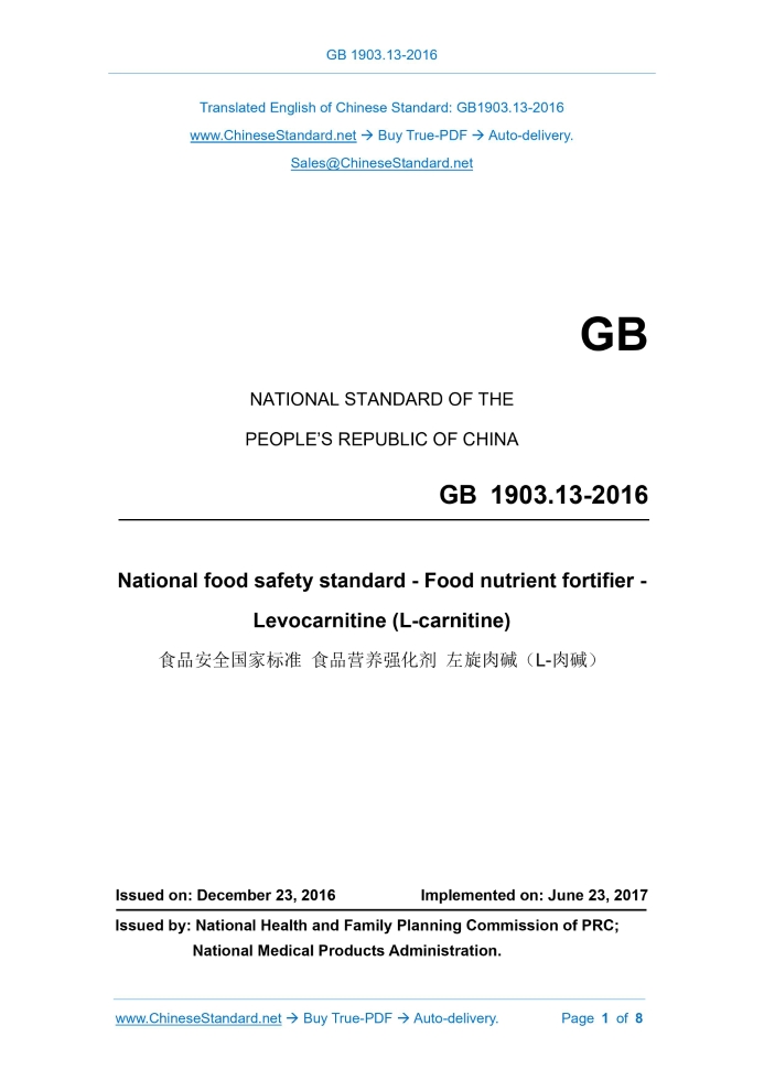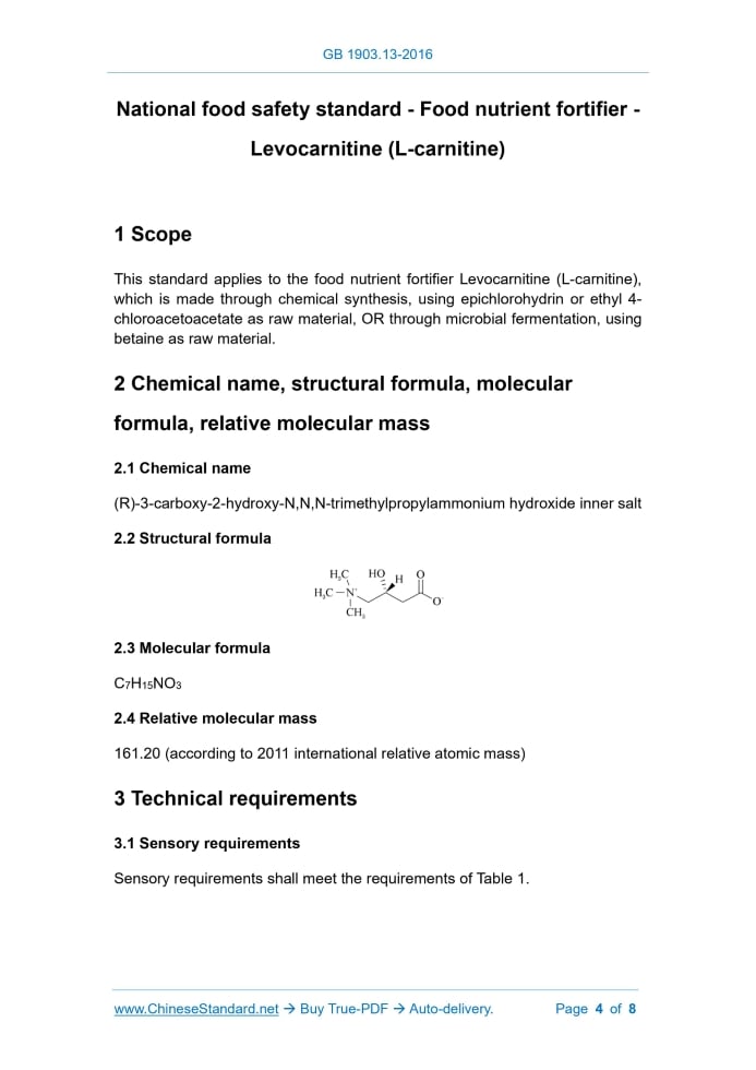 GB 1903.13-2016: Food additive -- Levocarnitine Delivery: 9 seconds. True-PDF full-copy in English & invoice will be downloaded + auto-delivered via email. See step-by-step procedure Status: Valid