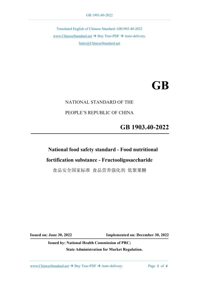 GB 1903.40-2022: National food safety standard - Food nutritional fortification substance - Fructooligosaccharide Delivery: 9 seconds. True-PDF full-copy in English & invoice will be downloaded + auto-delivered via email. See step-by-step procedure Status: Valid