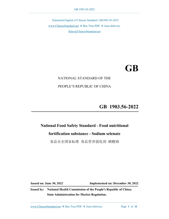 GB 1903.56-2022: National food safety standard - Food nutritional fortification substance - Sodium selenate Delivery: 9 seconds. True-PDF full-copy in English & invoice will be downloaded + auto-delivered via email. See step-by-step procedure Status: Valid