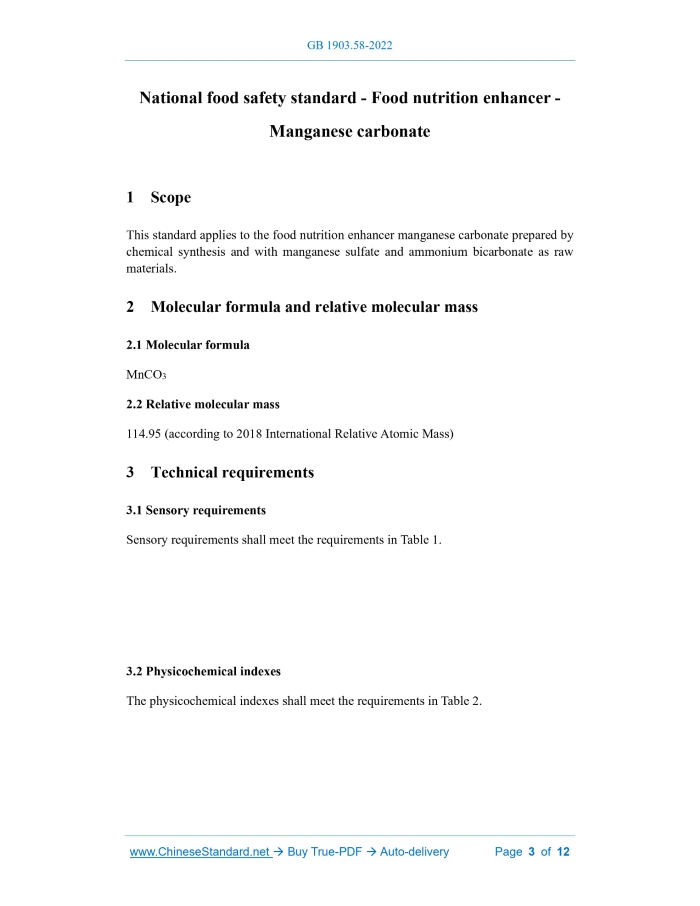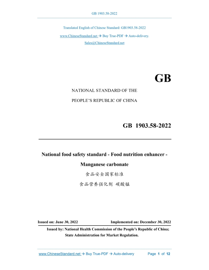 GB 1903.58-2022: National food safety standard - Food nutritional fortification substance - Manganous carbonate Delivery: 9 seconds. True-PDF full-copy in English & invoice will be downloaded + auto-delivered via email. See step-by-step procedure Status: Valid