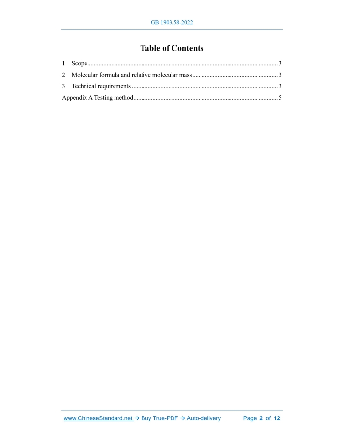 Similar standardsGB 1903.58-2022: National food safety standard - Food nutritional fortification substance - Manganous carbonate---This is an excerpt. Full copy of true-PDF in English version (including equations, symbols, images, flow-chart, tables, and figures etc.), auto-downloaded/delivered in 9 seconds, can be purchased online: https://www.ChineseStandard.net/PDF.aspx/GB1903.58-2022 GB NATIONAL STANDARD OF THE PEOPLE’S REPUBLIC OF CHINA National food safety standard - Food nutrition enhancer - Manganese carbonate ISSUED ON: JUNE 30, 2022 IMPLEMENTED ON: DECEMBER 30, 2022 Issued by: National Health Commission of the People’s Republic of China; State Administration for Market Regulation. Table of Contents1 Scope ... 3 2 Molecular formula and relative molecular mass ... 3 3 Technical requirements ... 3 Appendix A Testing method ... 5 National food safety standard - Food nutrition enhancer - Manganese carbonate1 ScopeThis standard applies to the food nutrition enhancer manganese carbonate prepared by chemical synthesis and with manganese sulfate and ammonium bicarbonate as raw materials.2 Molecular formula and relative molecular mass2.1 Molecular formula MnCO3 2.2 Relative molecular mass 114.95 (according to 2018 International Relative Atomic Mass)3 Technical requirements3.1 Sensory requirements Sensory requirements shall meet the requirements in Table 1. 3.2 Physicochemical indexes The physicochemical indexes shall meet the requirements in Table 2.Appendix ATesting method A.1 Warning Some of the reagents used in this standard test method are toxic or corrosive, and shall be used with caution and in accordance with relevant regulations. If a toxic or corrosive reagent splashes on the skin, it shall be washed with water immediately; if the hurt is serious, it shall be treated immediately. When volatile acids are used, the operation shall be done in a fume hood. A.2 General provision Unless otherwise specified in this standard, the purity of the reagents used shall be above analytical purity, and the preparation of the standard titration solutions, standard solutions for impurity determination, preparations and products used shall be in accordance with the provisions of GB/T 601, GB/T 602, and GB/T 603; the test water shall meet the requirements of the third-grade water in GB/T 6682. The solution used in the test refers to the aqueous solution when the solvent used for preparation is not indicated. A.3 Identification test A.3.1 Reagents and solutions A.3.1.1 Hydrochloric acid. A.3.1.2 Acetic acid. A.3.1.3 Nitric acid. A.3.1.4 Hydrochloric acid solution: Take 50.0 mL of hydrochloric acid (A.3.1.1), add water to make up to 100 mL, and shake well to obtain the solution. A.3.1.5 Nitric acid solution: Take 25.0 mL of nitric acid (A.3.1.3), add water to make up to 100 mL, and shake well to obtain the solution. A.3.1.6 Ammonium sulfide. A.3.1.7 Sodium bismuthate. A.3.1.8 Calcium hydroxide saturated solution: Weigh about 3 g of calcium oxide, and the weight shall be accurate to 0.1 g; put it in a reagent bottle, add 1000 mL of water, cover the bottle, and shake vigorously; let it stand for clarification, and then take the supernatant for using. A.3.2 Instruments and equipment Electronic balance: The sense quantity shall be 0.1 mg, 0.01 g, and 0.1 g. A.3.3 Identification method A.3.3.1 Manganese identification A.3.3.1.1 Weigh 1 g of the sample, and add hydrochloric acid solution dropwise until the sample is completely dissolved; continue to add hydrochloric acid solution to form 20 mL test sample solution, and then add ammonium sulfide drop by drop to produce an orange-red precipitate. After the mixture stands for 10 min, the acetic acid is added dropwise, and then the precipitate gradually dissolves. A.3.3.1.2 Weigh 1 g of the sample, dissolve it in the nitric acid solution, and add a little amount of sodium bismuthate powder to produce the purplish red color. A.3.3.2 Carbonate identification Weigh 1 g of the sample, add 100 mL of water, add hydrochloric acid solution dropwise to the test solution, and then a colorless and odorless gas releases; introduce it into the saturated solution of calcium hydroxide, the solution becomes white and turbid at first, then continue to introduce the gas and the turbidity becomes clear gradually. A.4 Determination of manganese carbonate content (ferrous ammonium sulfate titration method) A.4.1 Method principle The sample is put in a phosphoric acid medium, and the perchloric acid is added to oxidize manganese into trivalent; the N-Phenylanthranilic acid is used as the indicator, and the ferrous ammonium sulfate standard titration solution is used for titration; the manganese carbonate content can be calculated according to the difference between the consumption of ferrous ammonium sulfate standard titration solution in the titration sample test and blank test. A.4.2 Reagents and materials A.4.2.1 Phosphoric acid. A.4.2.2 Nitric acid. A.4.2.3 Hydrochloric acid. c --- The concentration of potassium dichromate standard solution, in moles per liter (mol/L); V1 --- 25.00, the volume of potassium dichromate standard solution pipetted, in milliliters (mL); m1 --- 114.95, the molar mass of manganese carbonate, in grams per mole (g/mol); 10-3 --- The calculation factor; V2 --- The volume of ferrous ammonium sulfate standard titration solution consumed during titration, in milliliters (mL); V3 --- The volume of ferrous ammonium sulfate standard titration solution consumed during titration in the blank test, in milliliters (mL). A.4.2.9.3 Determination of blank value Pipette 10.00 mL potassium dichromate standard solution (A.4.2.8) into a 250 mL conical flask, add 40 mL sulfuric acid solution (A.4.2.7), 5 mL phosphoric acid (A.4.2.1), and use the ferrous ammonium sulfate standard titration solution (A.4.2.9) to titrate until the orange-yellow color disappears; add 2 drops of N-Phenylanthranilic acid indicator solution (A.4.2.10) dropwise, and continue dripping carefull