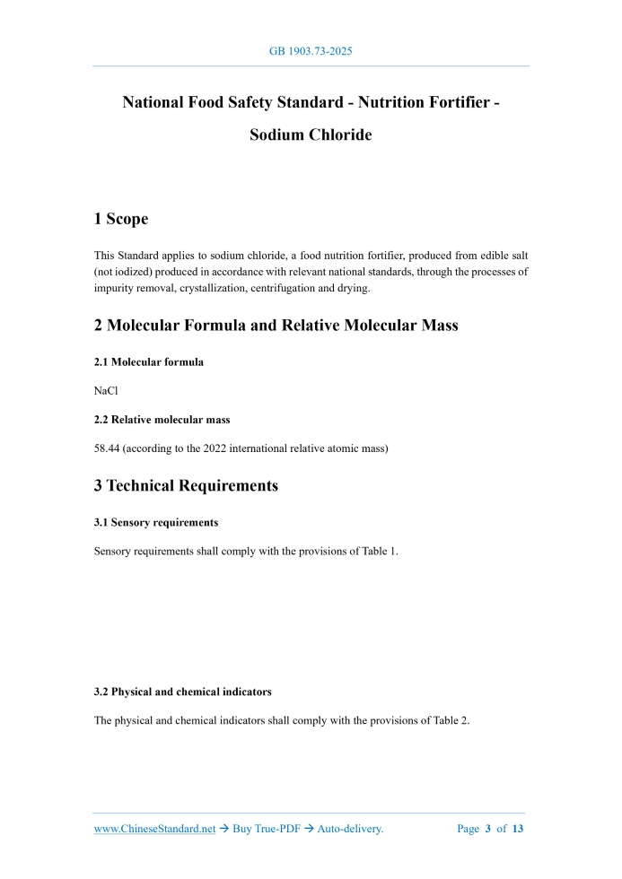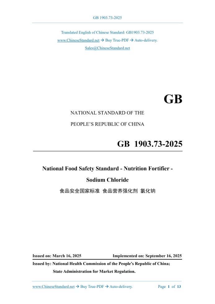 GB 1903.73-2025: National food safety standard - Nutrition fortifier - Sodium chloride Delivery: 9 seconds. True-PDF full-copy in English & invoice will be downloaded + auto-delivered via email. See step-by-step procedure Status: Valid