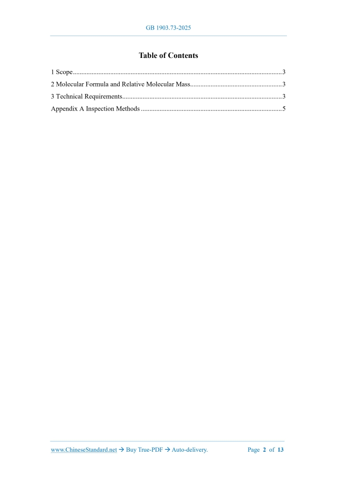 Similar standardsGB 1903.73-2025: National food safety standard - Nutrition fortifier - Sodium chloride---This is an excerpt. Full copy of true-PDF in English version (including equations, symbols, images, flow-chart, tables, and figures etc.), auto-downloaded/delivered in 9 seconds, can be purchased online: https://www.ChineseStandard.net/PDF.aspx/GB1903.73-2025GB NATIONAL STANDARD OF THE PEOPLE’S REPUBLIC OF CHINA National Food Safety Standard - Nutrition Fortifier - Sodium Chloride Issued on: MARCH 16, 2025 Implemented on: SEPTEMBER 16, 2025 Issued by. National Health Commission of the People’s Republic of China; State Administration for Market Regulation. Table of Contents1 Scope... 3 2 Molecular Formula and Relative Molecular Mass... 3 3 Technical Requirements... 3 Appendix A Inspection Methods... 5 National Food Safety Standard - Nutrition Fortifier - Sodium Chloride1 ScopeThis Standard applies to sodium chloride, a food nutrition fortifier, produced from edible salt (not iodized) produced in accordance with relevant national standards, through the processes of impurity removal, crystallization, centrifugation and drying.2 Molecular Formula and Relative Molecular Mass2.1 Molecular formula NaCl 2.2 Relative molecular mass 58.44 (according to the 2022 international relative atomic mass)3 Technical Requirements3.1 Sensory requirements Sensory requirements shall comply with the provisions of Table 1. 3.2 Physical and chemical indicators The physical and chemical indicators shall comply with the provisions of Table 2.Appendix AInspection Methods A.1 Safety Tips Some reagents such as sulfuric acid used in the inspection methods of this Standard are toxic or corrosive. Appropriate safety and protective measures shall be taken during operation. A.2 General Unless otherwise specified, the purity of the reagents used in this Standard shall be analytically pure. The used standard titration solution, standard solution for impurity determination, preparations and products shall be prepared in accordance with the provisions of GB/T 601, GB/T 602 and GB/T 603, respectively. The test water shall comply with the provisions of Grade 3 water specified in GB/T 6682.When the solution used in the test is not specified with which solvent to prepare, it refers to aqueous solution. A.3 Identification Test A.3.1 Reagents and materials A.3.1.1 Hydrochloric acid. A.3.1.2 Nitric acid. A.3.1.3 Nitric acid solution. c(HNO3) = 0.1 mol/L. Pipette 6.4 mL of nitric acid (A.3.1.2) and dilute it to 1,000 mL with water. A.3.1.4 Silver nitrate solution. 17 g/L. A.3.2 Instruments and equipment Electronic balance. Sensitivity is 0.1 g. A.3.3 Sodium ion identification Weigh about 1 g of the specimen and dissolve it in 10 mL of water. Dip a platinum wire in hydrochloric acid (A.3.1.1) and burn it on a colorless flame until it becomes colorless. Then dip a little test solution and burn it on a colorless flame. The flame shall turn bright yellow. A.3.4 Chloride ion identification Weigh about 1 g of the specimen, place it in a 125 mL conical flask; add 50 mL of water to dissolve it. And then add 10 mL of nitric acid solution (A.3.1.3) to make it acidic; add a few drops of silver nitrate solution (A.3.1.4); and a white curd-like precipitate shall be generated. A.4 pH test A.4.1 Reagents and materials A.4.1.1 Sodium hydroxide. A.4.1.2 Hydrochloric acid. A.4.1.3 Bromothymol blue. A.4.1.4 Sodium hydroxide solution. c(NaOH) = 0.02 mol/L. Weigh 0.8 g of sodium hydroxide (A.4.1.1); dissolve it in water and dilute to 1,000 mL. A.4.1.5 Bromothymol blue indicator solution. Take 0.1 g of bromothymol blue (A.4.1.3); add 8 mL of sodium hydroxide solution (A.4.1.4) to dissolve it; and then add water to dilute to 200 mL. A.4.1.6 Hydrochloric acid solution. c(HCl) = 0.02 mol/L. A.4.2 Instruments and equipment Electronic balance. Sensitivity is 0.01 g. A.4.3 Analysis procedures Weigh 5.0 g of the specimen (accurate to 0.01 g); add 50 mL of water to dissolve; and then add 0.10 mL of bromothymol blue indicator solution (A.4.1.5). If it turns yellow, add 0.10 mL of sodium hydroxide solution (A.4.1.4) and observe the color change; if it turns blue or green, add 0.20 mL of hydrochloric acid solution (A.4.1.6) and observe the color change. A.4.4 Judgment of results After adding bromothymol blue indicator solution (A.4.1.5) to the specimen solution, if it turns yellow, add sodium hydroxide solution (A.4.1.4) and turn it blue; if it turns blue or green, add hydrochloric acid solution (A.4.1.6) and turn it yellow, that is, the pH of the specimen passes the test. A.5 Solution clarity A.5.1 Method summary Compare the specimen solution with the specified turbidity standard solution to check the clarity of the solution. A.5.2 Reagents and materials A.5.2.1 Hydrazine sulfate. Dry to constant weight at 105°C before use. A.6.2.2 Acetic acid. A.6.2.3 Phenol red. A.6.2.4 Ammonium sulfate. A.6.2.5 Chloramine T. C7H7ClNNaO2S · 3H2O. A.6.2.6 Potassium bromide. Dry to constant weight at 105 °C before use. A.6.2.7 Sodium thiosulfate. A.6.2.8 Sodium hydroxide solution. c(NaOH) = 2 mol/L. Weigh 80 g of sodium hydroxide (A.6.2.1); dissolve in water; transfer to a 1,000 mL volumetric flask; and dilute to the scale. A.6.2.9 Acetic acid solution. c(CH3CO2H) = 2 mol/L. Weigh 113.2 mL of acetic acid (A.6.2.2) and dilute to 1,000 mL with water. A.6.2.10 Phenol red solution. Weigh 33 mg of phenol red (A.6.2.3); add 1.5 mL of sodium hydroxide solution (A.6.2.8); dissolve in water and dilute to 100 mL. A.6.2.11 Phenol red mixed solution. Weigh 25 mg of ammonium sulfate (A.6.2.4); add 235 mL of water; add 105 mL of sodium hydroxide solution (A.6.2.8); add 135 mL of acetic acid solution (A.6.2.9); shake well. Then add 25 mL of phenol red solution (A.6.2.10); shake well. Adjust the pH to 4.7 if necessary. A.6.2.12 Chloramine T solution (0.1 g/L). Weigh 0.01 g of chloramine T (A.6.2.5); dissolve in water; transfer to a 100 mL volumetric flask; and dilute to the scale. Prepar