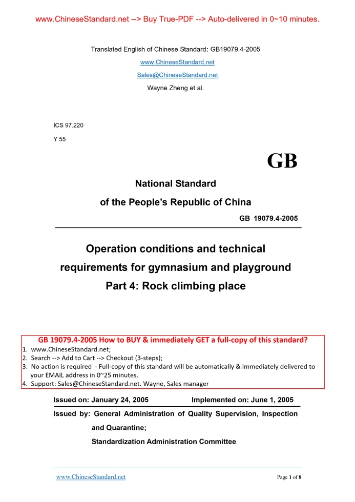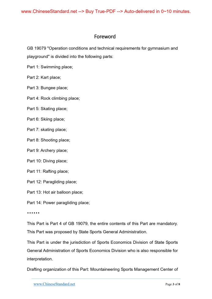Similar standardsGB 19079.4-2005: Operation conditions and technical requirements for gymnasium and playground -- Part 4: Rock climbing place---This is an excerpt. Full copy of true-PDF in English version (including equations, symbols, images, flow-chart, tables, and figures etc.), auto-downloaded/delivered in 9 seconds, can be purchased online: https://www.ChineseStandard.net/PDF.aspx/GB19079.4-2005 ICS 97.220 Y 55 GB National Standard of the People’s Republic of China Operation conditions and technical requirements for gymnasium and playground Part 4.Rock climbing place Issued on: JANUARY 24, 2005 Implemented on: JUNE 1, 2005 Issued by. General Administration of Quality Supervision, Inspection and Quarantine; Standardization Administration Committee Table of ContentsForeword... 3 1 Scope... 5 2 Normative references... 5 3 Terms and definitions... 5 4 Practitioner Qualification... 6 5 Place, facilities and equipment conditions... 6 6 Health, environmental management requirements... 8 7 Safety protection... 8ForewordGB 19079 "Operation conditions and technical requirements for gymnasium and playground" is divided into the following parts. Part 1.Swimming place; Part 2.Kart place; Part 3.Bungee place; Part 4.Rock climbing place; Part 5.Skating place; Part 6.Skiing place; Part 7.skating place; Part 8.Shooting place; Part 9.Archery place; Part 10.Diving place; Part 11.Rafting place; Part 12.Paragliding place; Part 13.Hot air balloon place; Part 14.Power paragliding place; •••••• This Part is Part 4 of GB 19079, the entire contents of this Part are mandatory. This Part was proposed by State Sports General Administration. This Part is under the jurisdiction of Sports Economics Division of State Sports General Administration of Sports Economics Division who is also responsible for interpretation. Drafting organization of this Part. Mountaineering Sports Management Center of State Sports General Administration, and Beijing University. The main drafters of this Part. Hao Guang’an, Xie Yun, Chen Xueling, Liu Daqing, Li Zhixin, Yang Shitao, Wang Liquan, Dan Chunjian, and Li Zhi. Operation conditions and technical requirements for gymnasium and playground Part 4.Rock climbing place1 ScopeThis Part of GB 19079 specifies the basic conditions and basic technical requirements that shall be possessed by rocking climbing place. This Part applies to all types of rock climbing places that are opened to society.2 Normative referencesThe provisions in following documents become the provisions of this Standard through reference in this Standard. For dated references, the subsequent amendments (excluding corrections) or revisions do not apply to this Standard, however, parties who reach an agreement based on this Standard are encouraged to study if the latest versions of these documents are applicable. For undated references, the latest edition of the referenced document applies. GB 6566 Limits of radionuclides in building materials GB 9668 Hygienic standard for gymnasium GB/T 17093 Hygienic standard for bacterial total in indoor air GB/T 18883-2002 Indoor air quality standards GB/T 10001.1 Signs with graphic symbols for public information - Part 1. Common symbols3 Terms and definitions3.1 rock climbing place6 Health, environmental management requirements6.1 Artificial rock shall comply with the requirements of GB 6566. 6.2 Environmental Health at rock climbing place shall comply with the requirements of GB 9668. 6.3 Indoor air at rock climbing place shall comply with the requirements of GB/T 17093 and GB/T 18883-2002.7 Safety protection7.1 There are "Rock climbing personnel must know" and safety warning at prominent position. 7.2 During operation, each operating climbing channel shall be equipped with a climbing technical guidance staff. 7.3 There are sound facilities, equipment and safety inspection system. Damaged equipment shall be replaced in time. 7.4 Emergency drugs and equipment shall be placed in an obvious location for easy access. 7.5 Various staffs who are on duty shall have obvious identity. 7.6 There are sound public security, safety and rescue, equipment maintenance system, and personal responsibility of staff services. ......Source: Above contents are excerpted from the full-copy PDF -- translated/reviewed by: www.ChineseStandard.net / Wayne Zheng et al. |