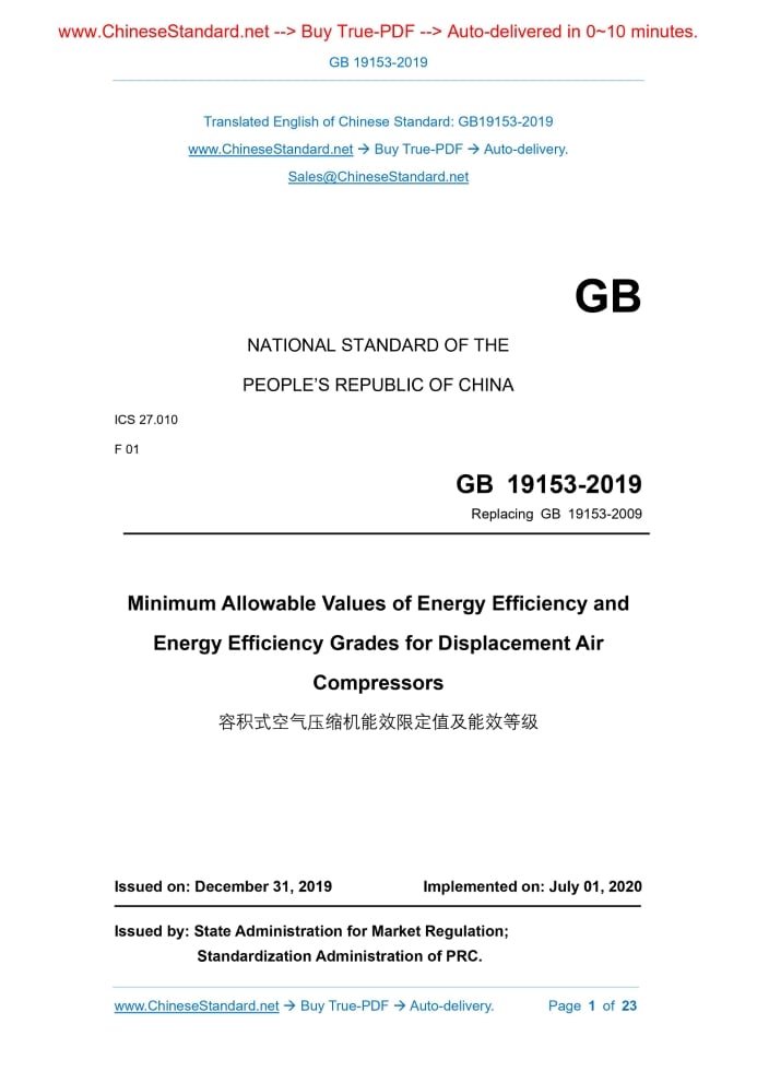 GB 19153-2019: Minimum Allowable Values of Energy Efficiency and Energy Efficiency Grades for Displacement Air Compressors Delivery: 9 seconds. True-PDF full-copy in English & invoice will be downloaded + auto-delivered via email. See step-by-step procedure Status: Valid GB 19153: Historical versions