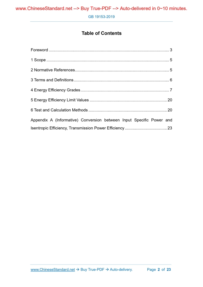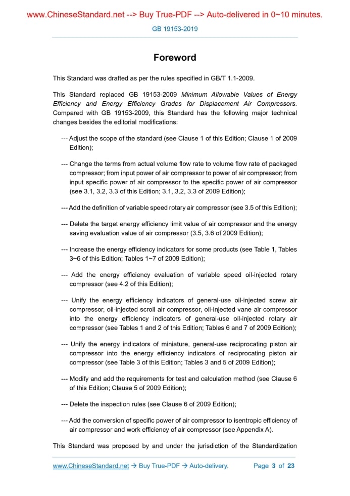 GB 19153-2019: Minimum Allowable Values of Energy Efficiency and Energy Efficiency Grades for Displacement Air Compressors---This is an excerpt. Full copy of true-PDF in English version (including equations, symbols, images, flow-chart, tables, and figures etc.), auto-downloaded/delivered in 9 seconds, can be purchased online: https://www.ChineseStandard.net/PDF.aspx/GB19153-2019 NATIONAL STANDARD OF THE PEOPLE’S REPUBLIC OF CHINA ICS 27.010 F 01 Replacing GB 19153-2009 Minimum Allowable Values of Energy Efficiency and Energy Efficiency Grades for Displacement Air Compressors Issued on. DECEMBER 31, 2019 Implemented on. JULY 01, 2020 Issued by. State Administration for Market Regulation; Standardization Administration of PRC. Table of ContentsForeword... 3 1 Scope... 5 2 Normative References... 5 3 Terms and Definitions... 6 4 Energy Efficiency Grades... 7 5 Energy Efficiency Limit Values... 20 6 Test and Calculation Methods... 20 Appendix A (Informative) Conversion between Input Specific Power and Isentropic Efficiency, Transmission Power Efficiency... 23ForewordThis Standard was drafted as per the rules specified in GB/T 1.1-2009. This Standard replaced GB 19153-2009 Minimum Allowable Values of Energy Efficiency and Energy Efficiency Grades for Displacement Air Compressors. Compared with GB 19153-2009, this Standard has the following major technical changes besides the editorial modifications. --- Adjust the scope of the standard (see Clause 1 of this Edition; Clause 1 of 2009 Edition); --- Change the terms from actual volume flow rate to volume flow rate of packaged compressor; from input power of air compressor to power of air compressor; from input specific power of air compressor to the specific power of air compressor (see 3.1, 3.2, 3.3 of this Edition; 3.1, 3.2, 3.3 of 2009 Edition); --- Add the definition of variable speed rotary air compressor (see 3.5 of this Edition); --- Delete the target energy efficiency limit value of air compressor and the energy saving evaluation value of air compressor (3.5, 3.6 of 2009 Edition); --- Increase the energy efficiency indicators for some products (see Table 1, Tables 3~6 of this Edition; Tables 1~7 of 2009 Edition); --- Add the energy efficiency evaluation of variable speed oil-injected rotary compressor (see 4.2 of this Edition); --- Unify the energy efficiency indicators of general-use oil-injected screw air compressor, oil-injected scroll air compressor, oil-injected vane air compressor into the energy efficiency indicators of general-use oil-injected rotary air compressor (see Tables 1 and 2 of this Edition; Tables 6 and 7 of 2009 Edition); --- Unify the energy indicators of miniature, general-use reciprocating piston air compressor into the energy efficiency indicators of reciprocating piston air compressor (see Table 3 of this Edition; Tables 3 and 5 of 2009 Edition); --- Modify and add the requirements for test and calculation method (see Clause 6 of this Edition; Clause 5 of 2009 Edition); --- Delete the inspection rules (see Clause 6 of 2009 Edition); --- Add the conversion of specific power of air compressor to isentropic efficiency of air compressor and work efficiency of air compressor (see Appendix A). This Standard was proposed by and under the jurisdiction of the Standardization Administration of PRC. Chief drafting organizations of this Standard. China National Institute of Standardization; Hefei General Machinery Electrical Products Inspection Institute Co., Ltd.; Hefei General Machinery Research Institute Co., Ltd.; Ningbo Mobo Compressor Co., Ltd.; Lida (China) Machine Equipment Co., Ltd.; Fusheng Industrial (Shanghai) Co., Ltd.; Ningbo Baosi Energy Equipment Co., Ltd.; Wuxi Xiya Fittings Co., Ltd.; Zhejiang Hngwuhuan Machinery Co., Ltd.; Shanghai Ingersoll-Rand Compressor Co., Ltd.; Zhejiang Kaishan Compressor Co., Ltd.; Guangdong Ecoair Equipment Technology Co., Ltd.; and Hangzhou Jiangchao Motor Co., Ltd. Chief drafting staffs of this Standard. Sun Xiaoming, Pao Yangyang, Liu Ren, Song Lifeng, Luo Jingkun, Chen Shengkun, Zhang Jiongyan, Shang Yongjun, Jiang Jianjiang, Lin Lihua, Wang Lixin, Nie Changjun, and Lan Yuhua. The historical editions replaced by this Standard are as follows. --- GB 19153-2003, GB 19153-2009. Minimum Allowable Values of Energy Efficiency and Energy Efficiency Grades for Displacement Air Compressors1 ScopeThis Standard specifies the energy efficiency grades, energy efficiency limit values, test and calculation methods for the displacement air compressors. This Standard is applicable to. a) General-use oil-injected rotary air compressors (including general-use oil- injected screw air compressors, general-use single-screw air compressors, general-use oil-injected vane air compressors and oil-injected scroll air compressors with drive motor power of 1.5kW~630kW, exhaust pressure of 0.25MPa~1.4MPa; b) General-use variable-speed oil-injected rotary air compressors (including general-use variable-frequency oil-injected screw air compressors and integrated permanent-magnet variable-frequency screw air compressor) with drive motor power of 2.2kW~315kW, exhaust pressure of 0.25MPa~1.4MPa; c) General-use reciprocating piston air compressors (including miniature reciprocating piston air compressors and general-use fixed reciprocating piston air compressors) with driving motor power of 0.75kW~75kW and exhaust pressure of 0.25MPa~1.4MPa; d) Oil-free reciprocating piston air compressor with drive motor power of 0.55kW~22kW and exhaust pressure of 0.4MPa ~ 1.4MPa; e) Directly drive portable reciprocating piston air compressor.2 Normative ReferencesThe following documents are essential to the application of this document. For the dated documents, only the versions with the dates indicated are applicable to this document; for the undated documents, only the latest version (including all the amendments) are applicable to this document. GB/T 3853 Displacement Compressor - Acceptance Tests GB/T 4975 Displacement