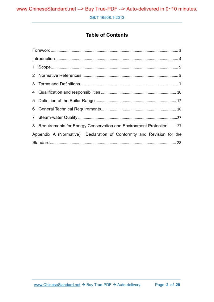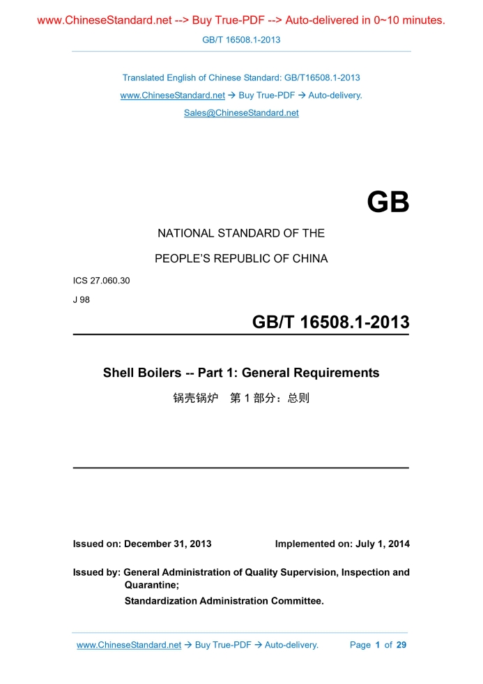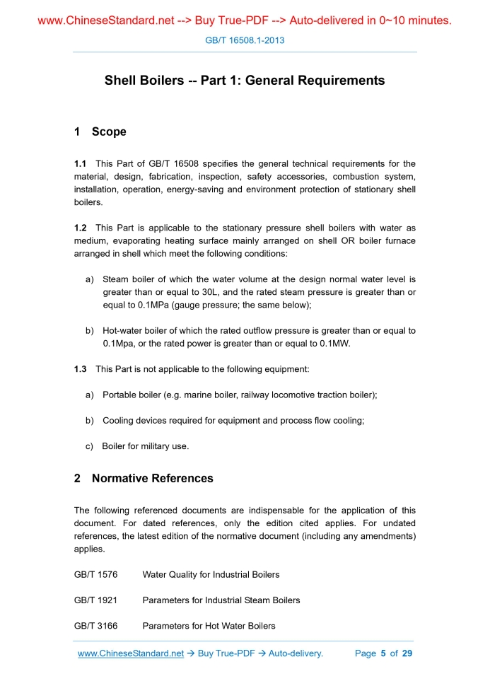 GB 19156-2003: General specifications for fire monitors---This is an excerpt. Full copy of true-PDF in English version (including equations, symbols, images, flow-chart, tables, and figures etc.), auto-downloaded/delivered in 9 seconds, can be purchased online: https://www.ChineseStandard.net/PDF.aspx/GB19156-2003NATIONAL STANDARD OF THE PEOPLE’S REPUBLIC OF CHINA ICS 27.060.30 J 98 Shell Boilers -- Part 1.General Requirements Issued on: DECEMBER 31, 2013 Implemented on: JULY 1, 2014 Issued by. General Administration of Quality Supervision, Inspection and Quarantine; Standardization Administration Committee. Table of ContentsForeword... 3 Introduction... 4 1 Scope... 5 2 Normative References... 5 3 Terms and Definitions... 7 4 Qualification and responsibilities... 10 5 Definition of the Boiler Range... 12 6 General Technical Requirements... 18 7 Steam-water Quality... 27 8 Requirements for Energy Conservation and Environment Protection... 27 Appendix A (Normative) Declaration of Conformity and Revision for the Standard... 28 Shell Boilers -- Part 1.General Requirements1 Scope1.1 This Part of GB/T 16508 specifies the general technical requirements for the material, design, fabrication, inspection, safety accessories, combustion system, installation, operation, energy-saving and environment protection of stationary shell boilers. 1.2 This Part is applicable to the stationary pressure shell boilers with water as medium, evaporating heating surface mainly arranged on shell OR boiler furnace arranged in shell which meet the following conditions. a) Steam boiler of which the water volume at the design normal water level is greater than or equal to 30L, and the rated steam pressure is greater than or equal to 0.1MPa (gauge pressure; the same below); b) Hot-water boiler of which the rated outflow pressure is greater than or equal to 0.1Mpa, or the rated power is greater than or equal to 0.1MW. 1.3 This Part is not applicable to the following equipment. a) Portable boiler (e.g. marine boiler, railway locomotive traction boiler); b) Cooling devices required for equipment and process flow cooling; c) Boiler for military use.2 Normative ReferencesThe following referenced documents are indispensable for the application of this document. For dated references, only the edition cited applies. For undated references, the latest edition of the normative document (including any amendments) applies. GB/T 1576 Water Quality for Industrial Boilers GB/T 1921 Parameters for Industrial Steam Boilers GB/T 3166 Parameters for Hot Water Boilers GB/T 2900.48 Electrotechnical Terminology of Boilers GB 8978 Integrated Wastewater Discharge Standard GB/T 10180 Thermal Performance Test Code for Industrial Boilers GB/T 10863 Thermal Test Method for Gas Pass Heat Recovery Boiler GB/T 12145 Quality Criterion of Water and Steam for Generating Unit and Steam Power Equipment GB 12348 Standard of Noise at Boundary of Industrial Enterprises GB 13271 Emission Standard of Air Pollutants for Boiler GB/T 16507 Water-tube Boilers GB/T 16508.2 Shell Boilers - Part 2.Material GB/T 16508.3 Shell Boilers - Part 3.Design and Strength Calculation GB/T 16508.4 Shell Boilers - Part 4.Fabrication, Inspection and Acceptance GB/T 16508.5 Shell Boilers - Part 5.Safety Appurtenances and Instruments GB/T 16508.6 Shell Boilers - Part 6.Combustion Systems GB/T 16508.7 Shell Boilers - Part 7.Installation GB/T 16508.8 Shell Boilers - Part 8.Operation GB/T 22395 Specification for Design of Boiler Steel Structures GB 24747 Safety Technology Conditions for Heat Transfer Fluids JB/T 6734 Strength Calculation Method for Boiler Fillet Weld JB/T 6735 Calculation Method for Strength of Boiler Hanger Rod NB/T 47013 (JB/T 4730) Nondestructive Testing of Pressure Equipment 3.5 Safety release pressure The pressure of safety valve upon releasing, also referred to as set pressure of safety valve. 3.6 Hydrostatic test pressure The pressure applied when conducting hydrostatic test for boiler system or pressure component (part) as required. 3.7 Rated temperature The working fluid temperature at the outlet which shall be ensured for long-term continuous operation under specified design conditions. 3.8 Calculating temperature The metal temperature of part set under normal operating conditions (the mean temperature along the metal section of part). 3.9 Test temperature The metal temperature of pressure part in pressure test. 3.10 Required thickness The thickness of pressure part determined according to theoretical calculation formula. Where necessary, thickness required by other loads shall also be calculated. 3.11 Design thickness 3.18 The highest fire line The highest point of water-side under the erosion of flame or high-temperature flue gas on the evaporating heating surface of boiler. 3.19 Component space It means that adequate space must be provided between adjacent parts of different wall temperatures on the tube plate so as to avoid overlarge temperature difference stress.4 Qualification and responsibilities4.1 Qualification 4.1.1 Organization qualification The fabrication, inspection, testing and installation organizations of boilers shall obtain corresponding special equipment license qualification according to the requirements of "Regulations on Safety Supervision over Special Equipment". 4.1.2 Personnel qualification 4.1.2.1 The welding personnel of the boiler pressure parts shall be assessed according to the requirements of relevant safety technical codes such as "Examination Rules for Welding Operators of Special Equipment" and may be engaged in the welding work within the acceptable project scope within the period of validity after obtaining the "Special Equipment Operator Certificate". 4.1.2.2 The non-destructive inspection personnel may only undertake non-destructive testing with type and technical level corresponding to the qualification certificate after obtaining the special equipment operator qualification certificate according to the requirements 