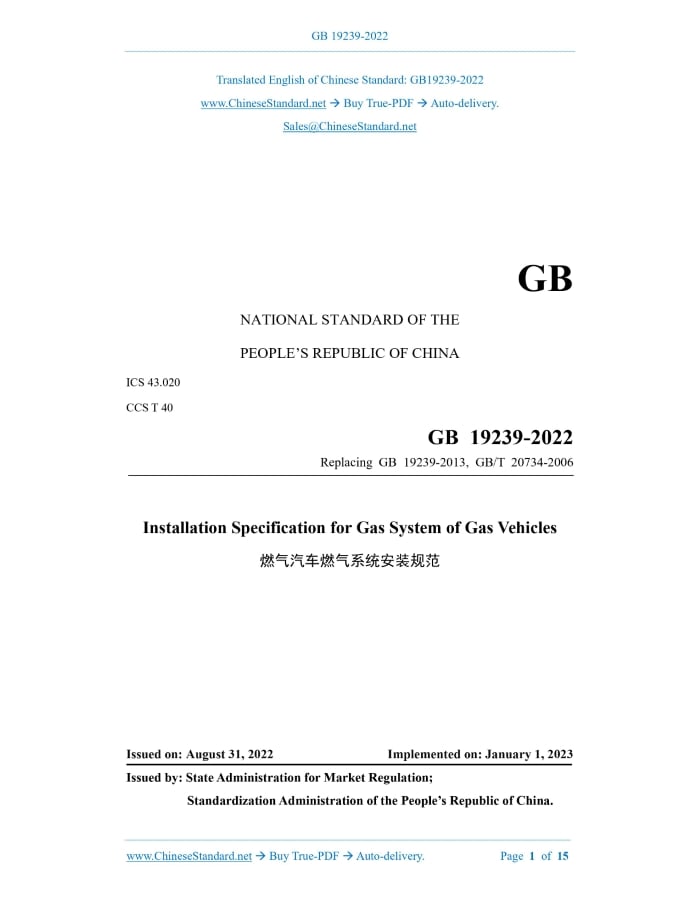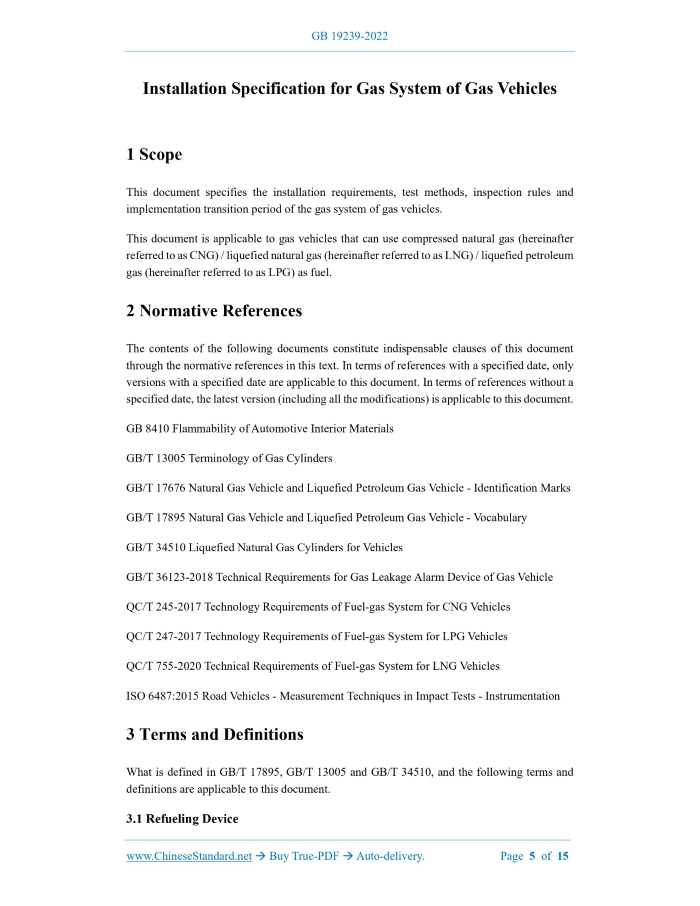 Similar standardsGB 19239-2022: Installation specification for gas system of gas vehicles---This is an excerpt. Full copy of true-PDF in English version (including equations, symbols, images, flow-chart, tables, and figures etc.), auto-downloaded/delivered in 9 seconds, can be purchased online: https://www.ChineseStandard.net/PDF.aspx/GB19239-2022GB NATIONAL STANDARD OF THE PEOPLE’S REPUBLIC OF CHINA ICS 43.020 CCS T 40 Replacing GB 19239-2013, GB/T 20734-2006 Installation Specification for Gas System of Gas Vehicles ISSUED ON: AUGUST 31, 2022 IMPLEMENTED ON: JANUARY 1, 2023 Issued by: State Administration for Market Regulation; Standardization Administration of the People’s Republic of China. Table of ContentsForeword ... 3 1 Scope ... 5 2 Normative References ... 5 3 Terms and Definitions ... 5 4 Installation Requirements ... 6 5 Test Methods ... 10 6 Inspection Rules ... 14 7 Implementation Transition Period ... 15 Installation Specification for Gas System of Gas Vehicles1 ScopeThis document specifies the installation requirements, test methods, inspection rules and implementation transition period of the gas system of gas vehicles. This document is applicable to gas vehicles that can use compressed natural gas (hereinafter referred to as CNG) / liquefied natural gas (hereinafter referred to as LNG) / liquefied petroleum gas (hereinafter referred to as LPG) as fuel.2 Normative ReferencesThe contents of the following documents constitute indispensable clauses of this document through the normative references in this text. In terms of references with a specified date, only versions with a specified date are applicable to this document. In terms of references without a specified date, the latest version (including all the modifications) is applicable to this document. GB 8410 Flammability of Automotive Interior Materials GB/T 13005 Terminology of Gas Cylinders GB/T 17676 Natural Gas Vehicle and Liquefied Petroleum Gas Vehicle - Identification Marks GB/T 17895 Natural Gas Vehicle and Liquefied Petroleum Gas Vehicle - Vocabulary GB/T 34510 Liquefied Natural Gas Cylinders for Vehicles GB/T 36123-2018 Technical Requirements for Gas Leakage Alarm Device of Gas Vehicle QC/T 245-2017 Technology Requirements of Fuel-gas System for CNG Vehicles QC/T 247-2017 Technology Requirements of Fuel-gas System for LPG Vehicles QC/T 755-2020 Technical Requirements of Fuel-gas System for LNG Vehicles ISO 6487:2015 Road Vehicles - Measurement Techniques in Impact Tests - Instrumentation3 Terms and DefinitionsWhat is defined in GB/T 17895, GB/T 13005 and GB/T 34510, and the following terms and definitions are applicable to this document. 3.1 Refueling Device Refueling device refers to a component connected with the gas (liquid) refueling gun or gas (liquid) returning gun when refueling gas (liquid).4 Installation Requirements4.1 General Requirements 4.1.1 The gas system for CNG vehicles shall satisfy the requirements of Chapter 4 in QC/T 245-2017. The gas system for LPG vehicles shall satisfy the requirements of Chapter 4 in QC/T 247-2017. The gas system for LNG vehicles shall satisfy the requirements of Chapter 5 in QC/T 755-2020. 4.1.2 The installation of the gas system of gas vehicles shall comply with the requirements of the design documents of finished vehicles, and shall be assembled in accordance with the product drawings and technical documents approved by the prescribed procedures. 4.1.3 The installation of the gas system of gas vehicles shall satisfy the requirements of the strength and rigidity of the vehicle bearing parts and other relevant safety components. Installation methods that may result in a reduction in the strength and rigidity of the vehicle bearing parts shall not be adopted. The gas system shall not be used as a bearing part. 4.1.4 The gas vehicles shall be marked with signs in accordance with the stipulations of GB/T 17676 in a prominent position. 4.1.5 After installation, the gas system of gas vehicles shall satisfy the following requirements: ---the gas cylinder shall not be deformed or worn; ---all components shall have anti-loosening measures, and there shall be no loosening or falling off; ---After the system is tested in accordance with the method specified in 5.1, there shall be no leakage. When the LNG gas system is tested, the cold test shall be carried out first; ---The various components of the gas system shall not be installed within a range of 100 mm from heat sources, such as: exhaust pipe and exhaust after-treatment tank, etc. When the distance between relevant components and heat sources is between 100 mm and 200 mm, fixed and reliable heat insulation devices shall be set up. 4.2 Gas Cylinder 4.2.1 The gas cylinder shall be installed away from heat sources, and shall be effectively separated from the driver’s cab or passenger compartment. When the gas cylinder cannot be effectively separated from the driver’s cab or passenger compartment, sealing boxes (sealing parts around the gas cylinder accessories), corrugated pipes and ventilation ports shall be used to discharge the gas that may leak out of the vehicle. The exhaust direction of the ventilation port shall be within the range of 45 cone with the ground. The distance from the ventilation specified in 5.3.2, the relative displacement between the gas cylinder or gas cylinder set and the fixed point of its fixing seat shall not be greater than 13 mm. Among them, the single gas cylinder and the single gas cylinder fixing seat in the gas cylinder set shall be tested in accordance with the method specified in 5.3.2.2; the installation of the fixing seat for the vertical arrangement of the gas cylinder set shall be tested in accordance with the method specified in 5.3.2.3. If the gas cylinder set is horizontally arranged and multiple gas cylinders are fixed by one fastening belt, the installation of the fixing seat shall be tested in accordance with the method specified in 5.3.2.4; if the gas cylinder fastening b