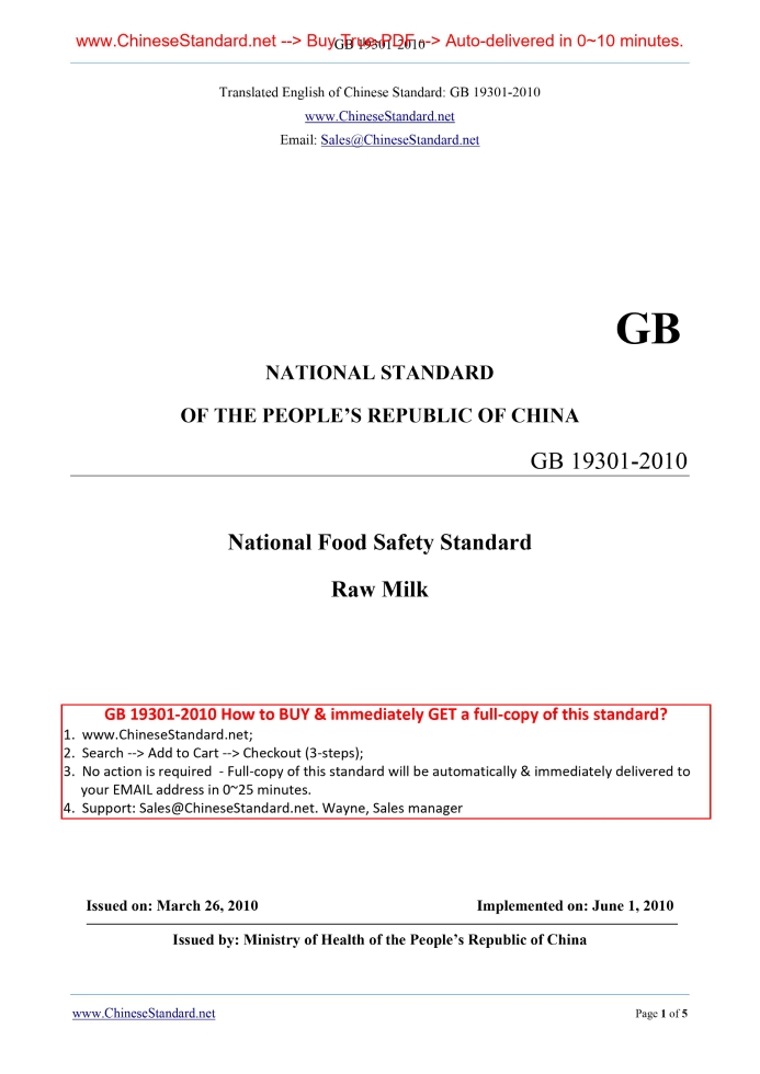 GB 19301-2010: National food safety standard -- Raw milk Delivery: 9 seconds. True-PDF full-copy in English & invoice will be downloaded + auto-delivered via email. See step-by-step procedure Status: Valid GB 19301: Historical versions