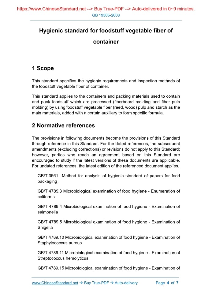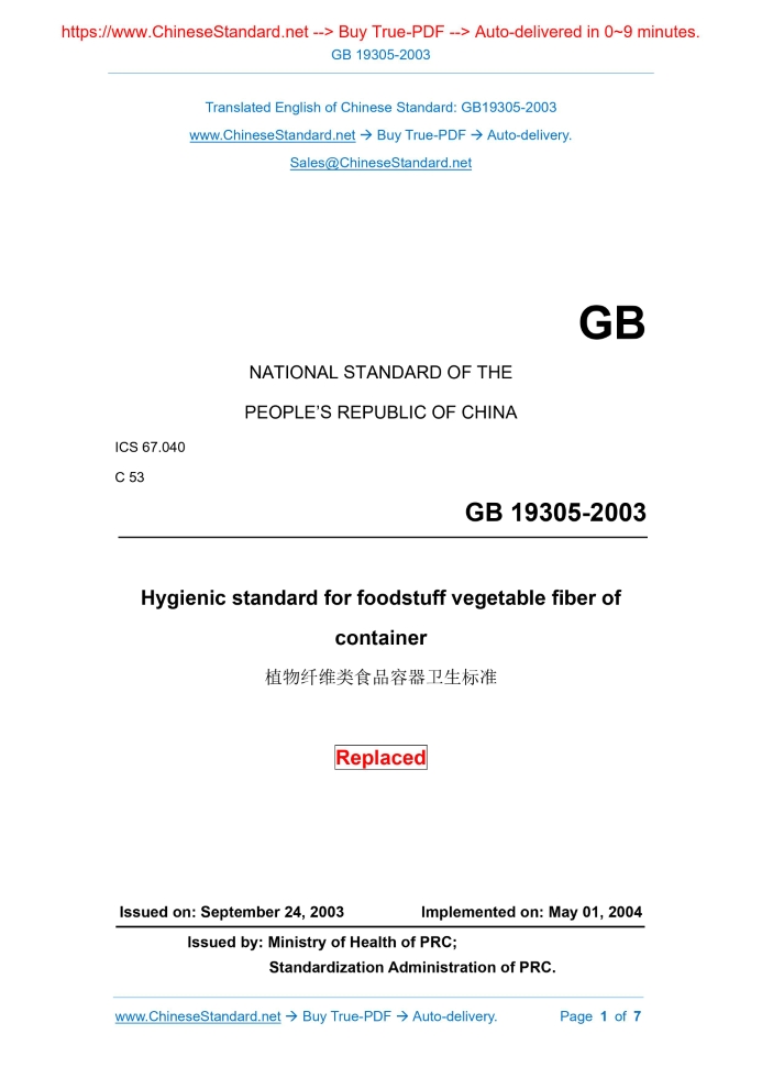 GB 19305-2003: Hygienic standard for foodstuff vegetable fibre of container Delivery: 9 seconds. True-PDF full-copy in English & invoice will be downloaded + auto-delivered via email. See step-by-step procedure Status: Obsolete
