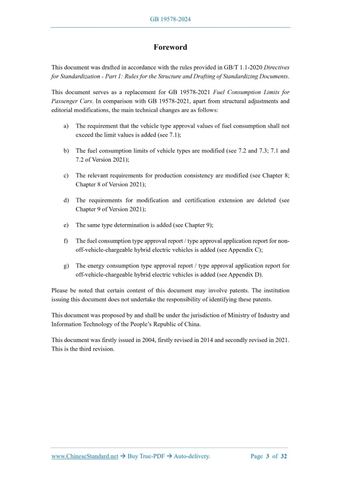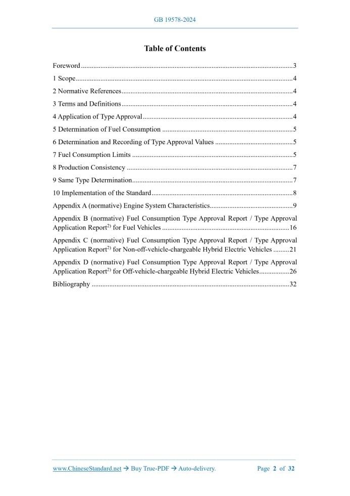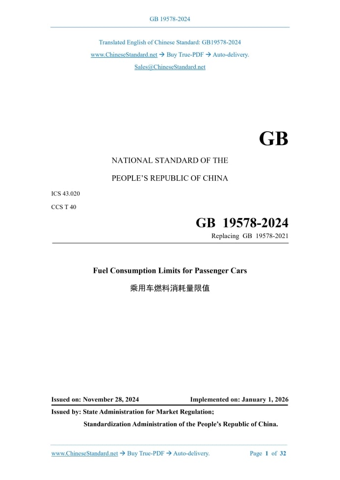 Similar standardsGB 19578-2024: Fuel consumption limits for passenger cars---This is an excerpt. Full copy of true-PDF in English version (including equations, symbols, images, flow-chart, tables, and figures etc.), auto-downloaded/delivered in 9 seconds, can be purchased online: https://www.ChineseStandard.net/PDF.aspx/GB19578-2024GB NATIONAL STANDARD OF THE PEOPLE’S REPUBLIC OF CHINA ICS 43.020 CCS T 40 Replacing GB 19578-2021 Fuel Consumption Limits for Passenger Cars Issued on. NOVEMBER 28, 2024 Implemented on. JANUARY 1, 2026 Issued by. State Administration for Market Regulation; Standardization Administration of the People’s Republic of China. Table of ContentsForeword... 3 1 Scope... 4 2 Normative References... 4 3 Terms and Definitions... 4 4 Application of Type Approval... 4 5 Determination of Fuel Consumption... 5 6 Determination and Recording of Type Approval Values... 5 7 Fuel Consumption Limits... 5 8 Production Consistency... 7 9 Same Type Determination... 7 10 Implementation of the Standard... 8 Appendix A (normative) Engine System Characteristics... 9 Appendix B (normative) Fuel Consumption Type Approval Report / Type Approval Application Report2) for Fuel Vehicles... 16 Appendix C (normative) Fuel Consumption Type Approval Report / Type Approval Application Report2) for Non-off-vehicle-chargeable Hybrid Electric Vehicles... 21 Appendix D (normative) Fuel Consumption Type Approval Report / Type Approval Application Report2) for Off-vehicle-chargeable Hybrid Electric Vehicles... 26 Bibliography... 321 ScopeThis document specifies the application for type approval of passenger cars, the determination of fuel consumption, the determination and recording of type approval values, the limits of fuel consumption, production consistency and the same type determination. This document applies to Category-M1 vehicles that can be fueled by gasoline or diesel fuel and have a maximum design total mass not exceeding 3,500 kg. This document is not applicable to vehicles that only use gas fuel or alcohol-ether fuel.2 Normative ReferencesThe contents of the following documents constitute indispensable clauses of this document through the normative references in the text. In terms of references with a specified date, only versions with a specified date are applicable to this document. In terms of references without a specified date, the latest version (including all the modifications) is applicable to this document. GB/T 19233-2020 Measurement Methods of Fuel Consumption for Light-duty Vehicles GB/T 19596 Terminology of Electric Vehicles GB/T 19753-2021 Test Methods for Energy Consumption of Light-duty Hybrid Electric Vehicles GB/T 37340 Conversion Methods for Energy Consumption of Electric Vehicles3 Terms and DefinitionsThe terms and definitions defined in GB/T 19596 are applicable to this document.4 Application of Type Approval4.1 For a vehicle type or a system of vehicles that complies with the requirements of 10.2.1 in GB/T 19233-2020 or 8.1 in GB/T19753-2021, 4.2 The application shall be accompanied by the following documents and detailed information (if there is a schematic diagram, it shall thoroughly explain the details in an appropriate scale). 4.3 A sample vehicle representing the type or system of vehicles to be approved shall be submitted to the inspection institution responsible for type approval test.5 Determination of Fuel ConsumptionThe fuel consumption of gasoline, diesel, bi-fuel, and dual-fuel vehicles shall be determined in accordance with the test method specified in GB/T 19233-2020 using the World Light Vehicle Test Cycle (WLTC).6 Determination and Recording of Type Approval ValuesThe inspection institution responsible for type approval test shall determine and record the vehicle type approval values in accordance with the following requirements.7 Fuel Consumption Limits7.1 The type-approved fuel consumption value of the vehicle type and the OVC-HEV converted fuel consumption shall not exceed the corresponding limits in 7.2 and 7.3. 7.2 The fuel consumption limit for vehicles equipped with manual transmission and with less than three rows of seats1) shall be calculated in accordance with Formula (1), and the calculation results shall be rounded to two decimal places. 7.3 The fuel consumption limits for other vehicle types shall be calculated in accordance with Formula (2), and the calculation results shall be rounded to two decimal places. 7.4 The reference value of CO2 emission corresponding to the limits shall be calculated in accordance with Formula (3), and the calculation results shall be rounded to two decimal places.8 Production ConsistencyThe fuel consumption of gasoline, diesel, bi-fuel, and dual-fuel vehicles shall satisfy the requirements of GB/T 19233-2020 for production consistency.9 Same Type Determination9.1 If the following provisions are satisfied, then, they are considered to be of the same type. shall also be satisfied.10 Implementation of the StandardFor vehicle types that are newly applying for type approval, implementation will begin from the date of implementation of this document; for vehicle types that have already obtained vehicle type approval, implementation will begin from the 25th month from the date of implementation of this document. ......Source: Above contents are excerpted from the full-copy PDF -- translated/reviewed by: www.ChineseStandard.net / Wayne Zheng et al. Tips & Frequently Asked Questions:Question 1: How long will the true-PDF of English version of GB 19578-2024 be delivered?Answer: The full copy PDF of English version of GB 19578-2024 can be downloaded in 9 seconds, and it will also be emailed to you in 9 seconds (double mechanisms to ensure the delivery reliably), with PDF-invoice.Question 2: Can I share the purchased PDF of GB 19578-2024_English with my colleagues?Answer: Yes. The purchased PDF of GB 19578-2024_English will be deemed to be sold to your employer/organization who actually paid for it, including your co