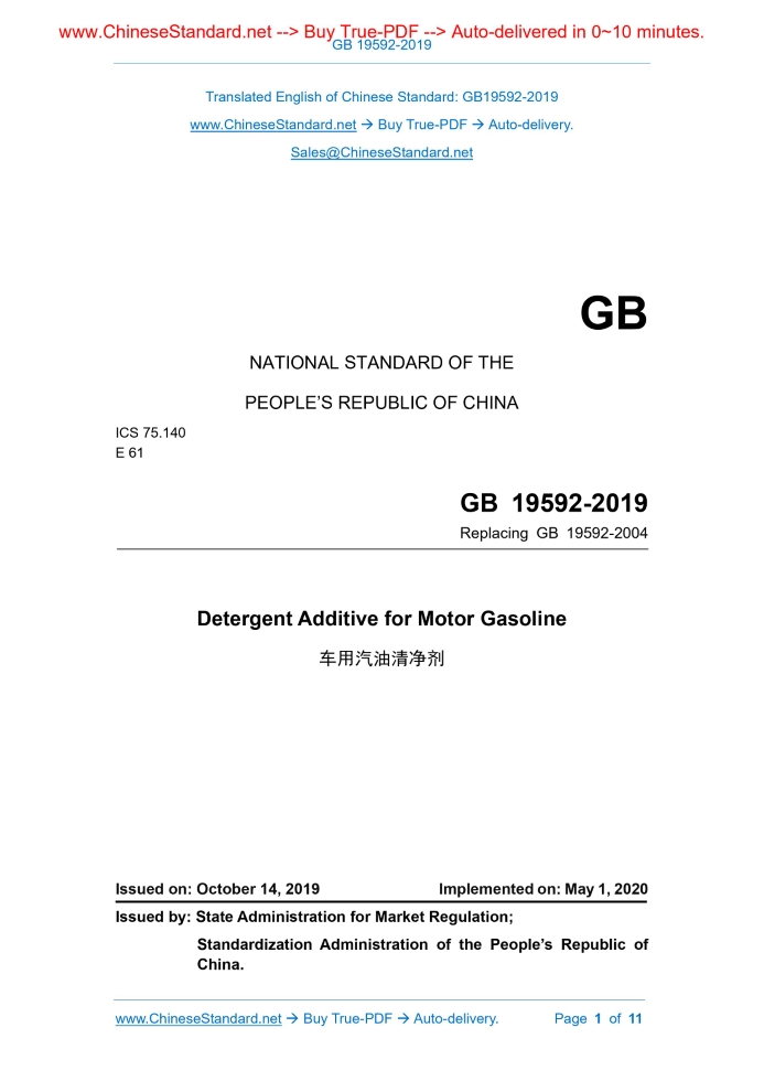 GB 19592-2019: Detergent Additive for Motor Gasoline Delivery: 9 seconds. True-PDF full-copy in English & invoice will be downloaded + auto-delivered via email. See step-by-step procedure Status: Valid GB 19592: Historical versions